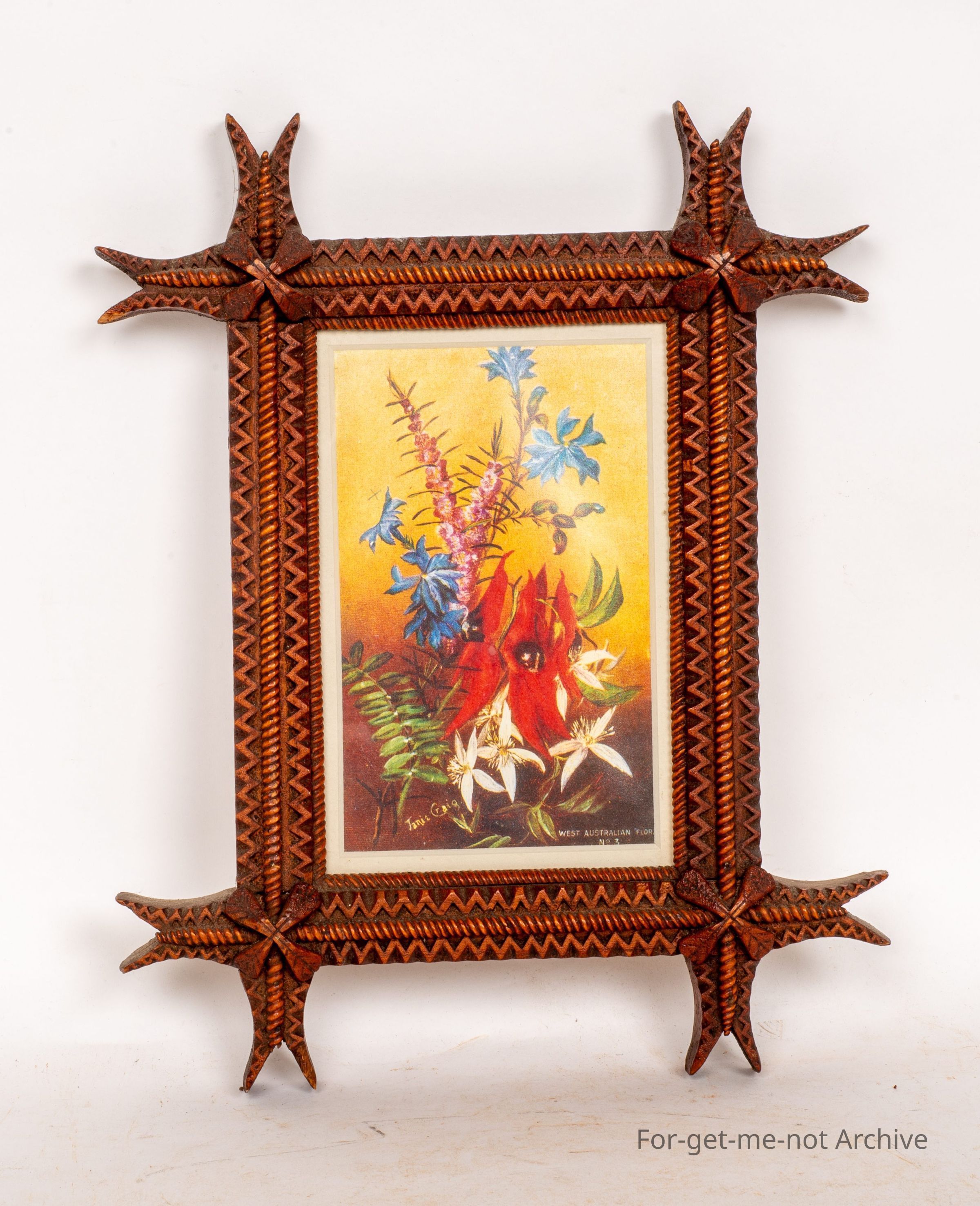 This is another Tramp art picture frame. Absolutely glorious to work in this. Very ornate, in perfect condition. Photo or a postcard of Australian Wildflowers