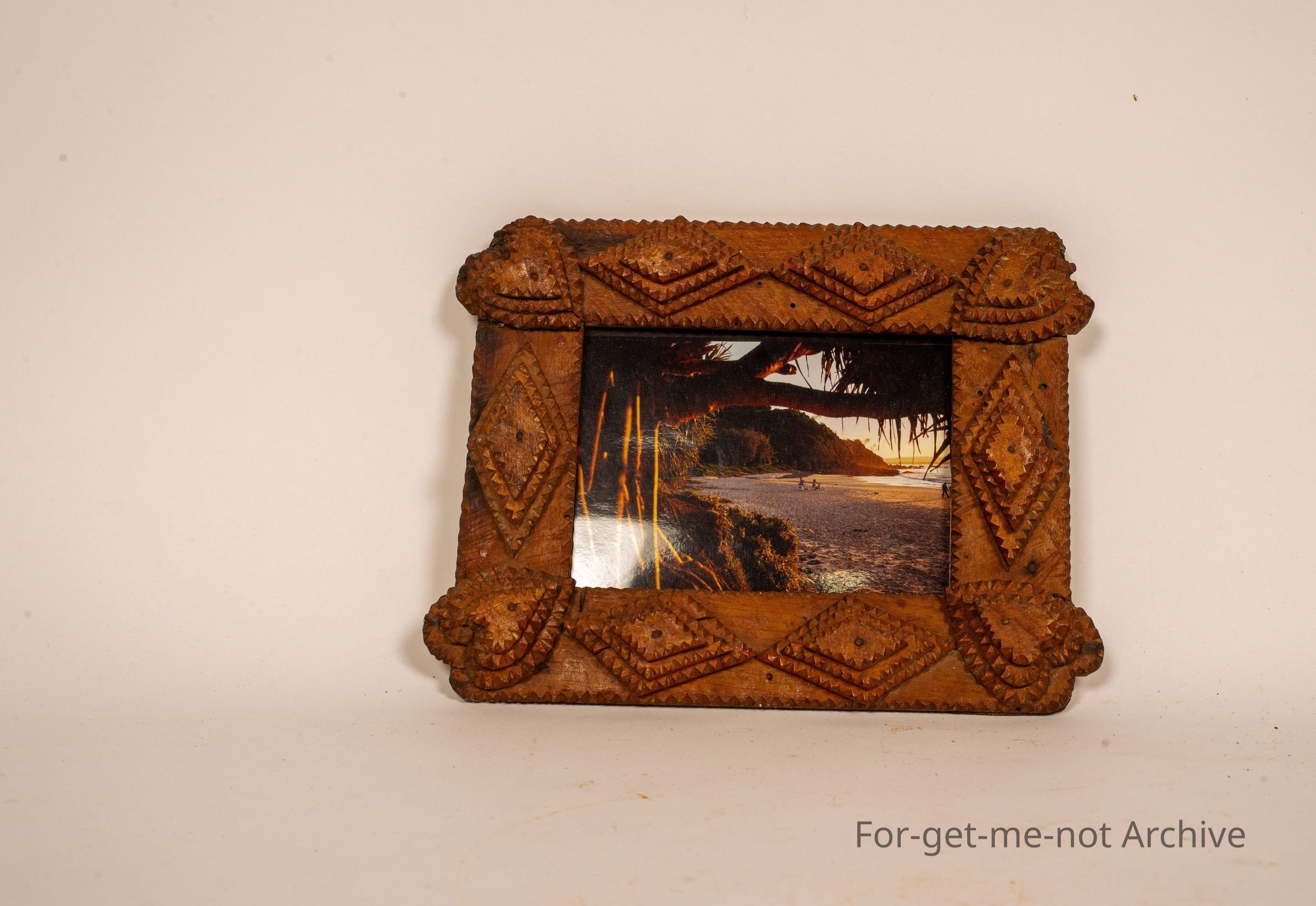 Is a small Tramp art frame, very decorative, with a photograph of, Byron Bay in the evening in in the frame,