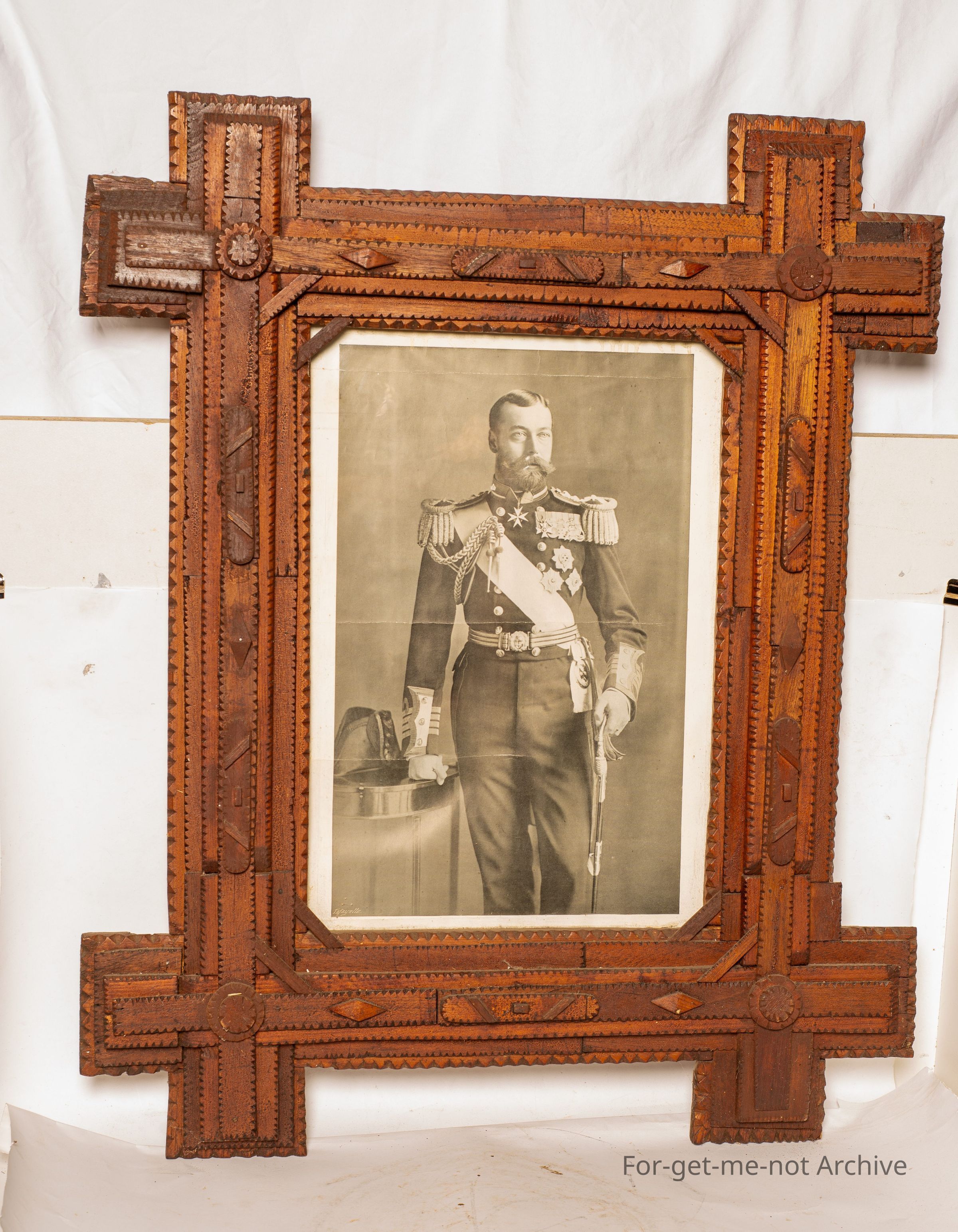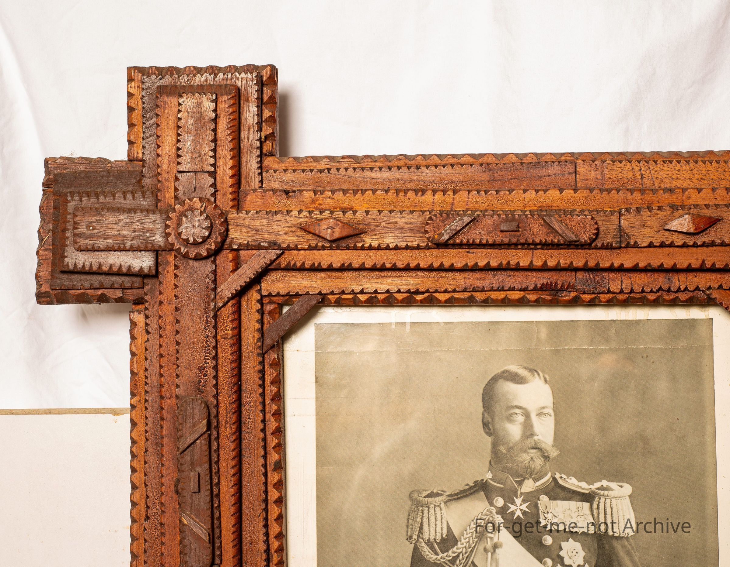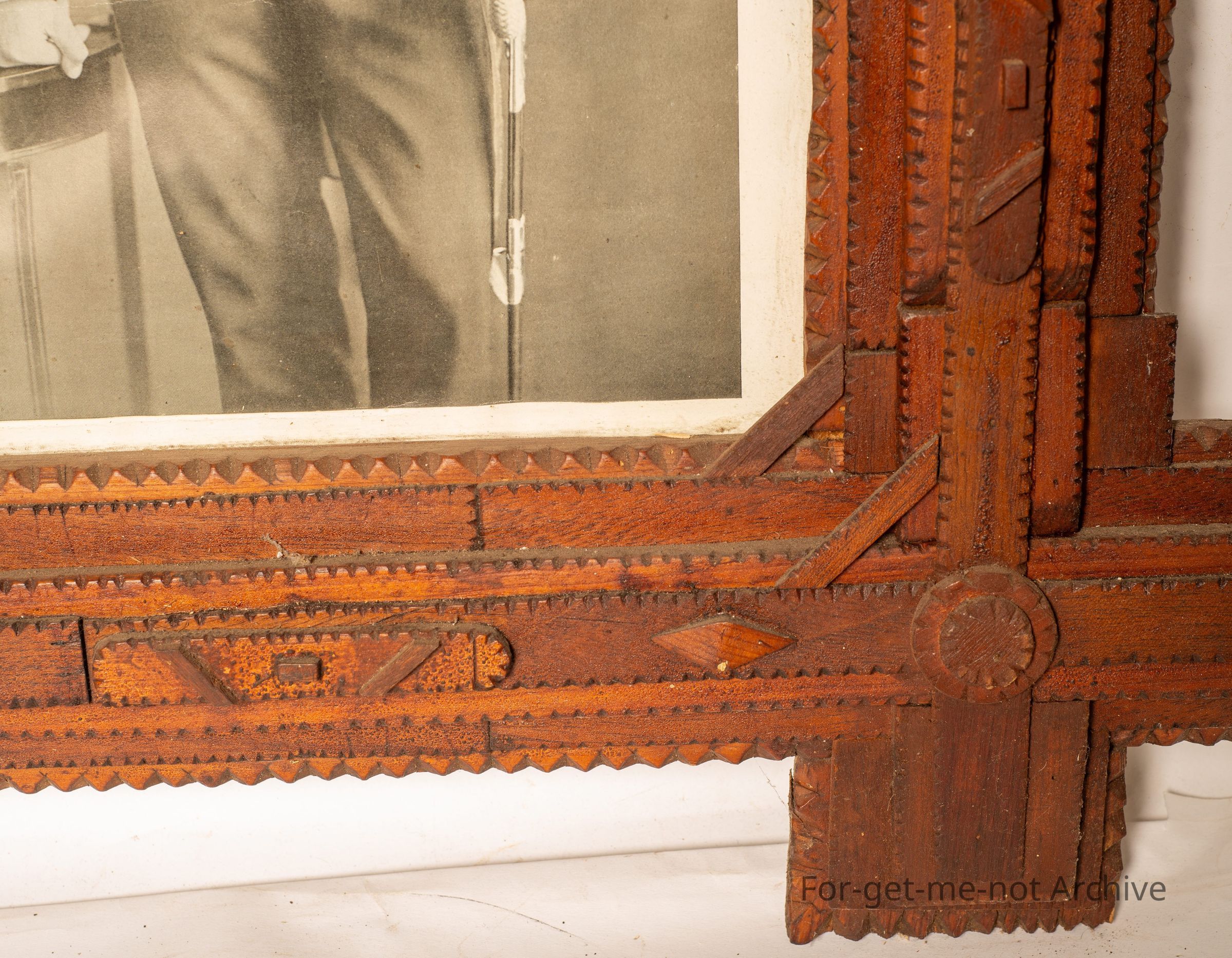 Large ornate tramp art frame. this is a very ornate frame that was put together in an intern camp through the First World War somewhere near Penshurst. An image of Albert, a photograph of Albert, a glorious piece of trampart in near perfect condition.Collection