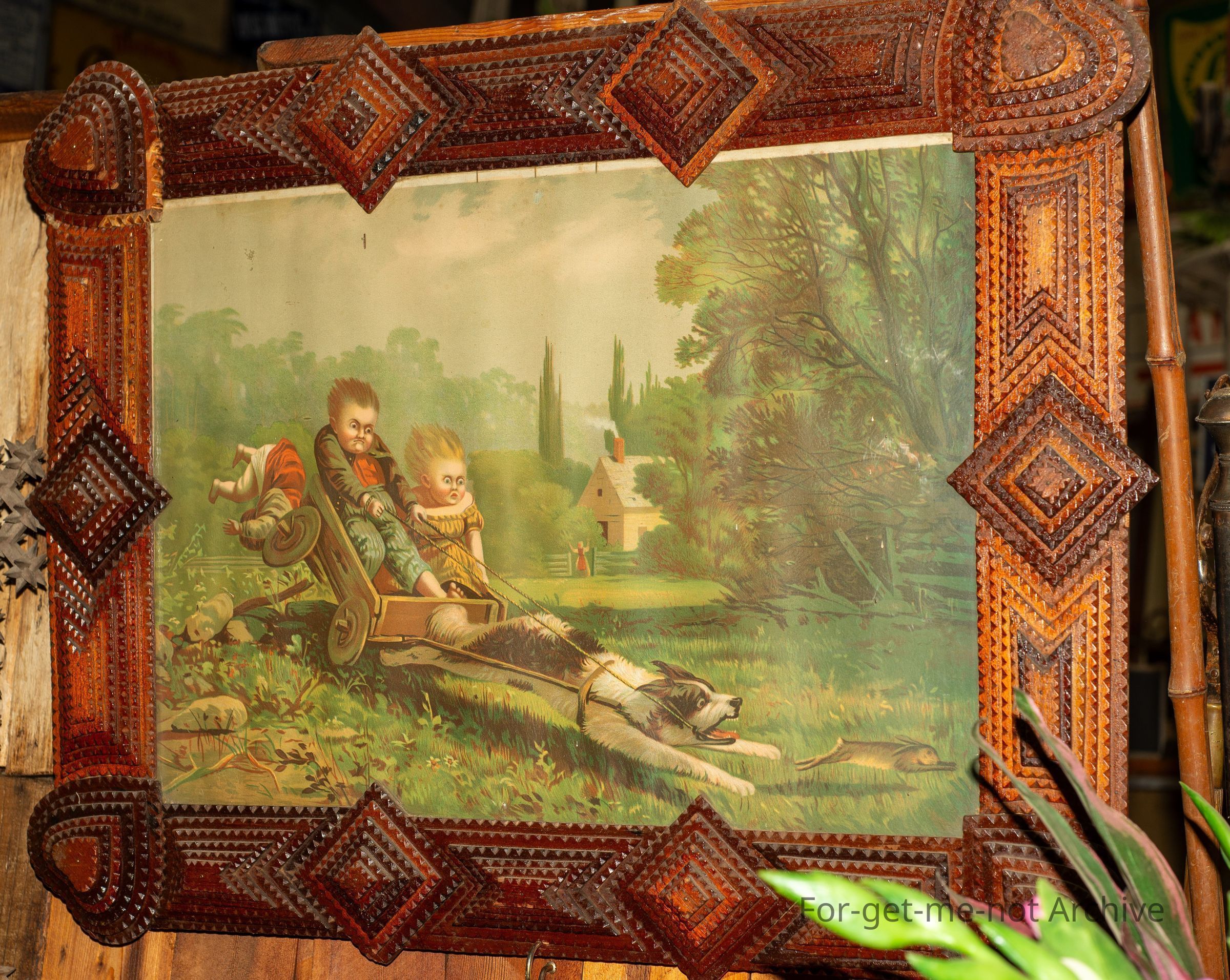 Is another magnificent Trampart picture frame. This is a real craft piece. It has a wonderful early, poster from Pear's Soap, in the frame which is with a very comical image of a dog in a light harness pulling a cart with 3 kids and the dog is in hot pursuit of a rabbit and the kids in a dilemma and nearly getting thrown out. The kids' mother is in the background in total despair.Collection