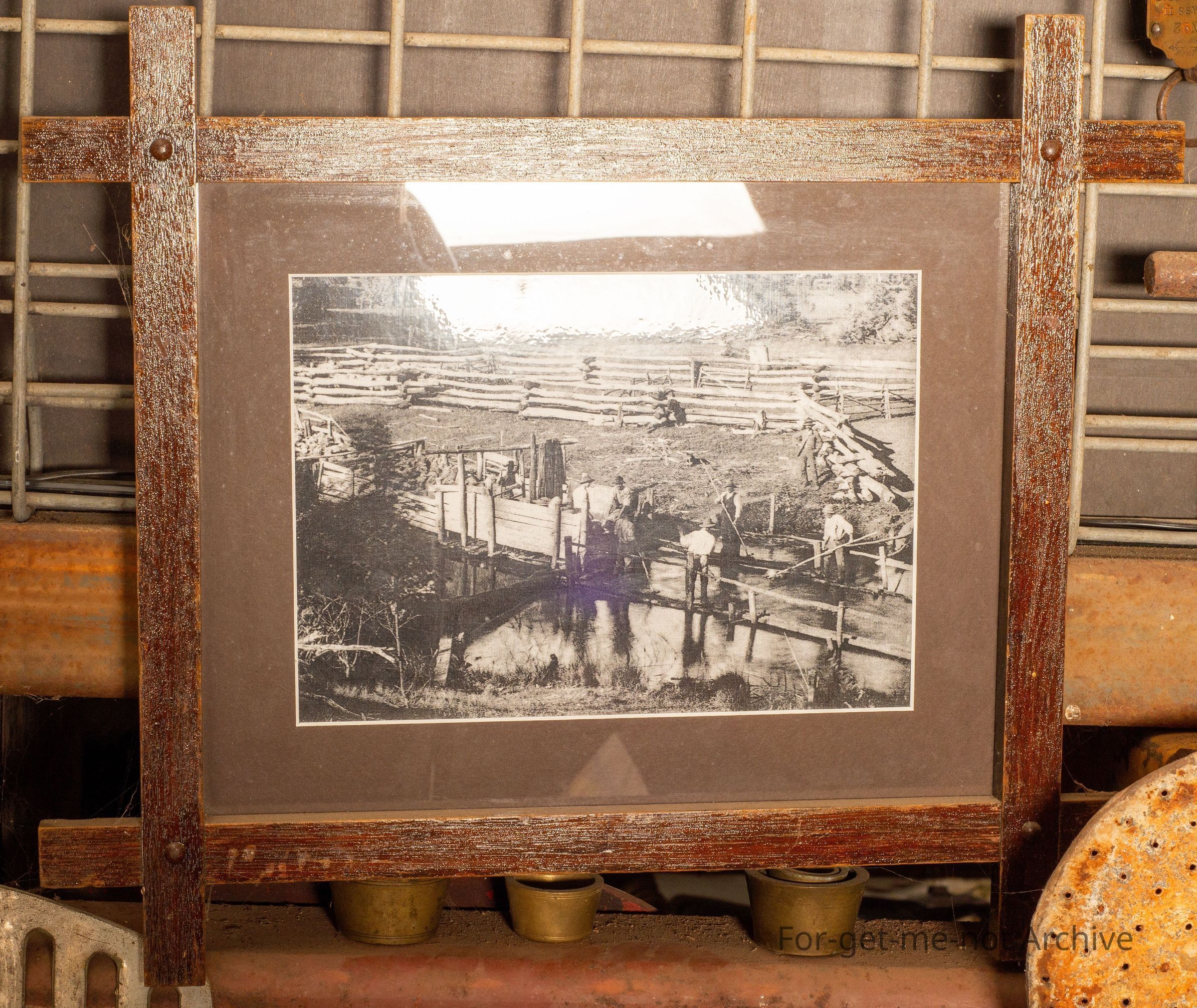 This is a colonial cross cornered picture frame. The photograph is an image of what is believed to be the Woolbrook sheep wash, all constructed. The yards are all constructed from bush poles. A very early scene, a glorious early photograph.Collection