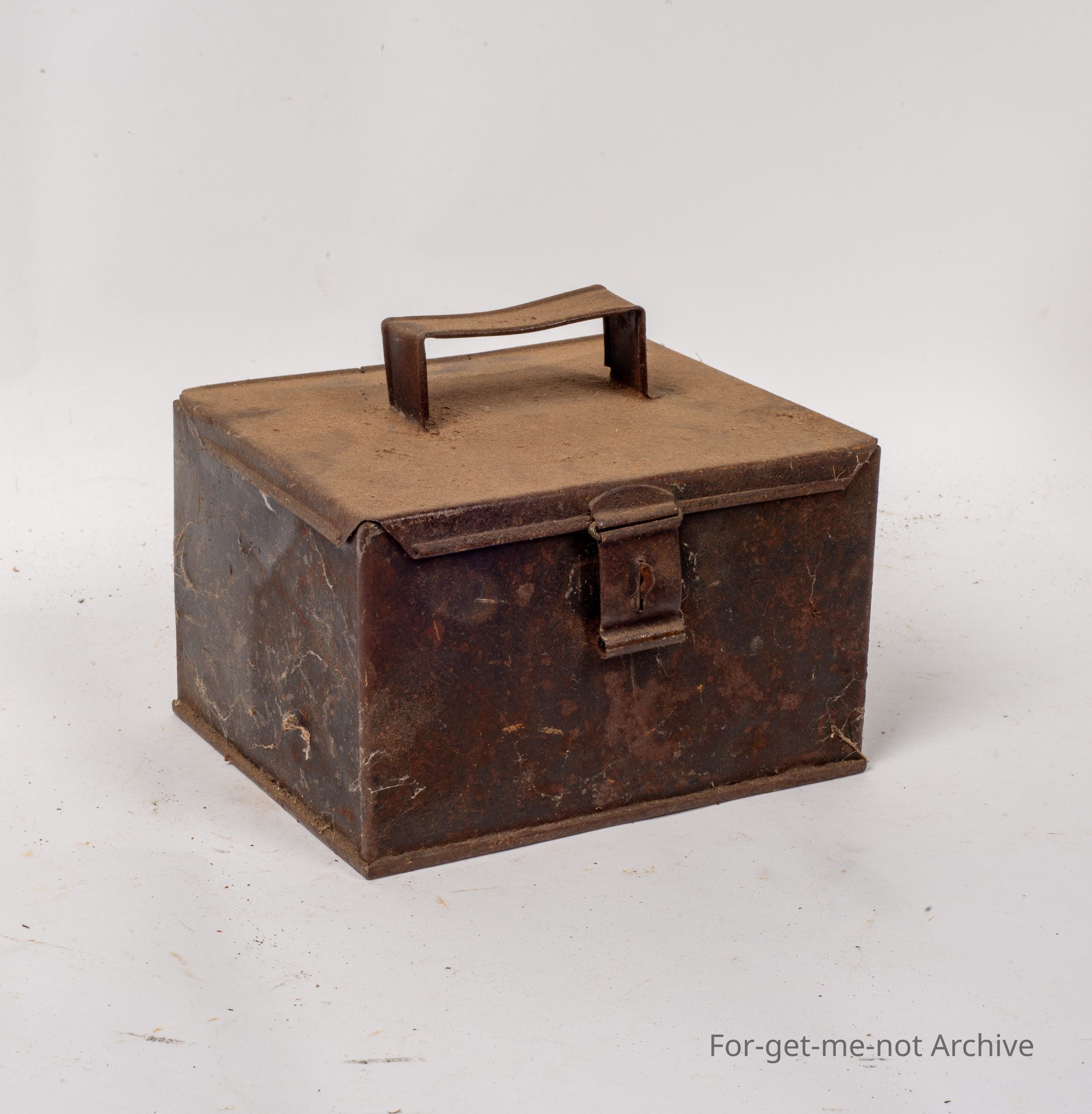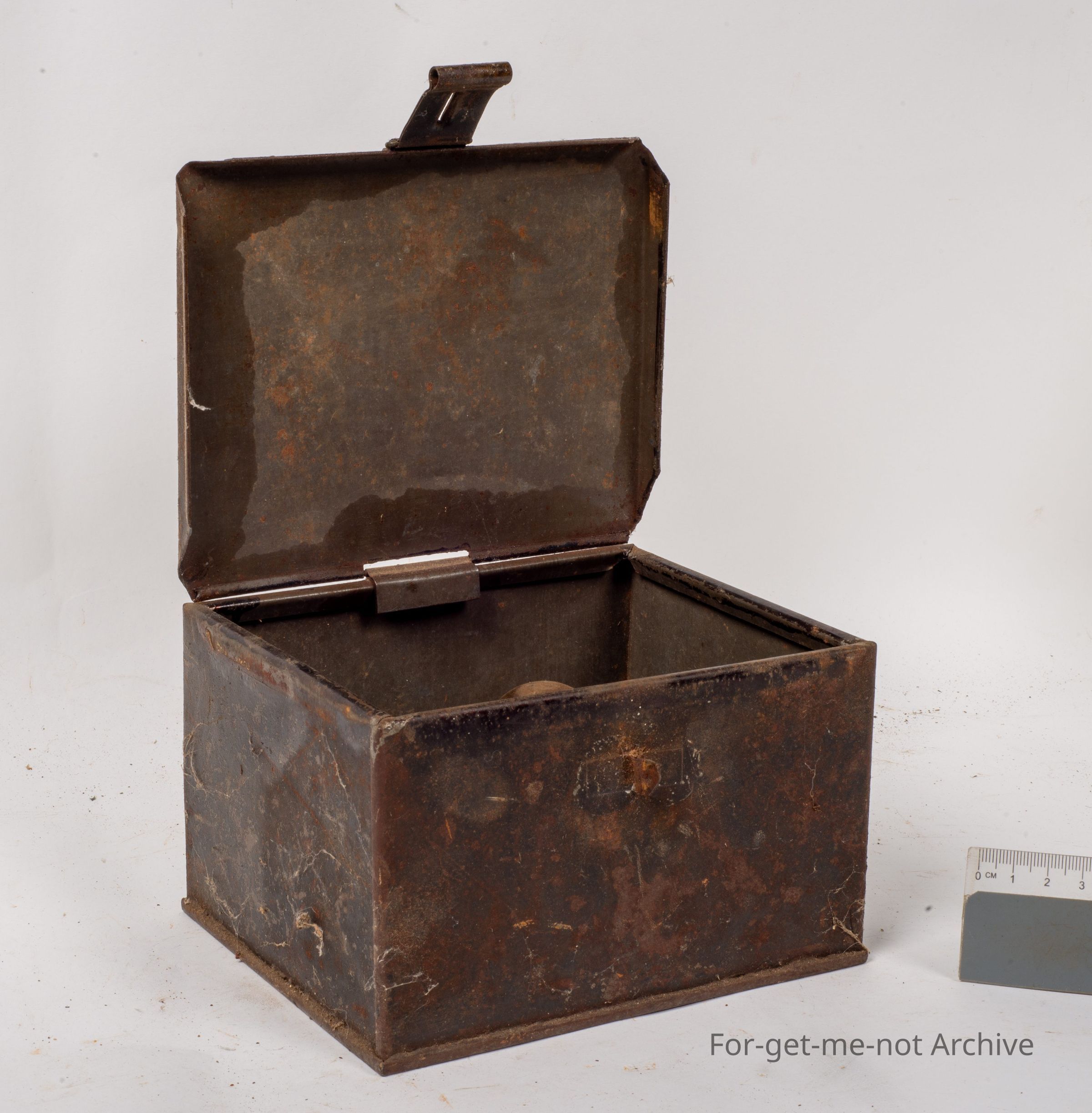 This is another Tinware homemade tool or trinket box, with a little catch or tin handle on the top. Very lightly built, but a depression earpiece,