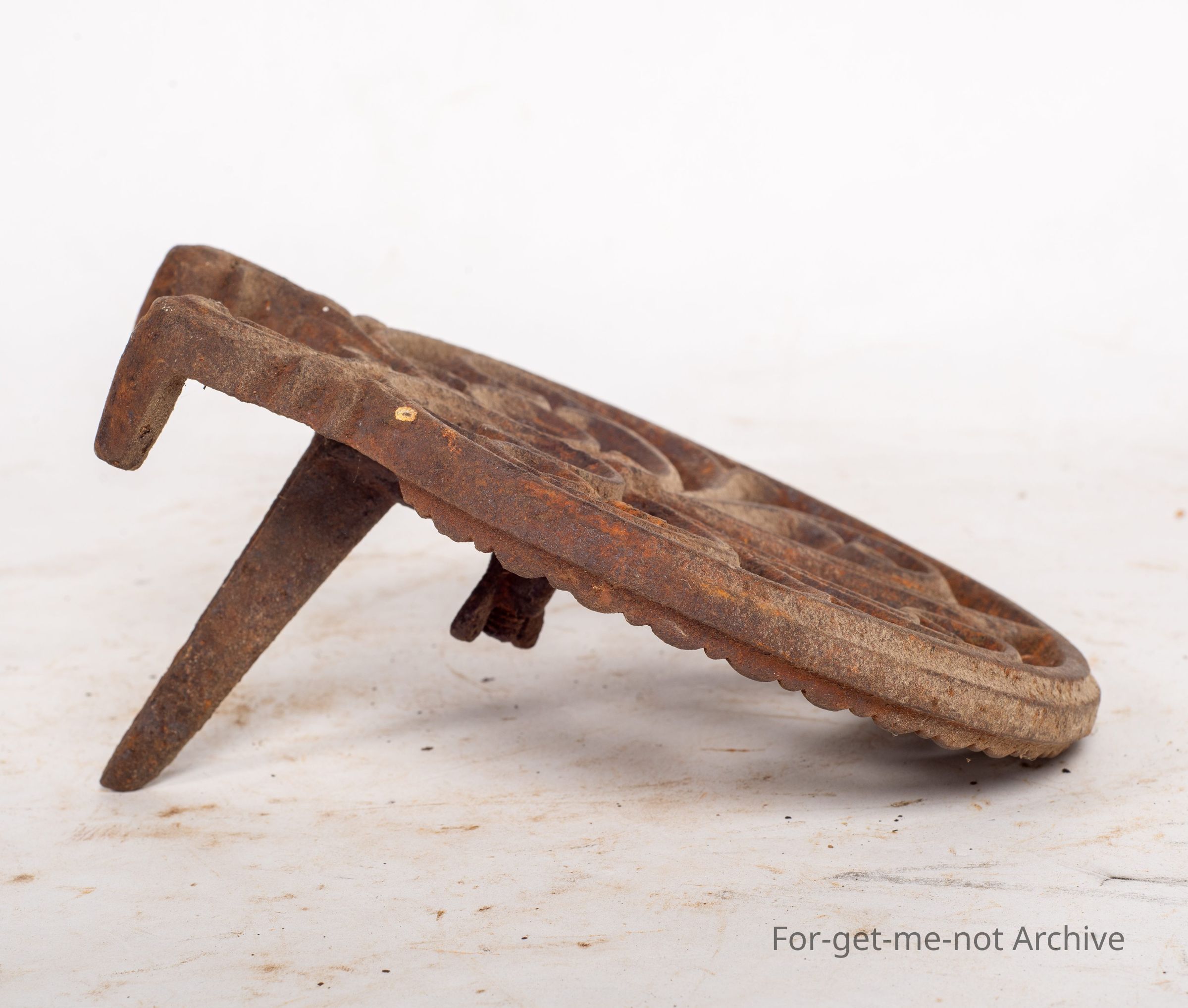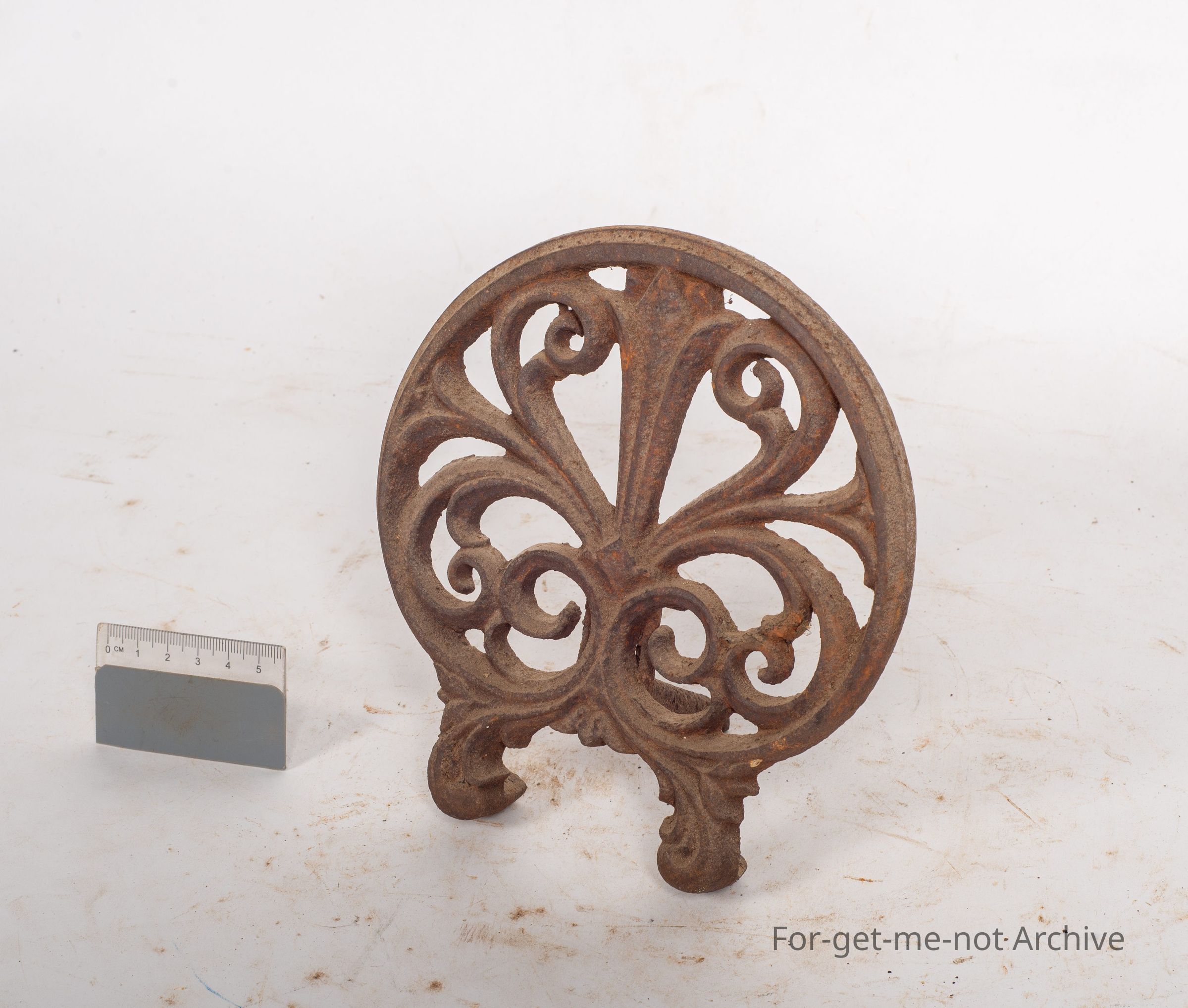 This is a very ornate, cast iron trivet. It would have come out of the of our cast iron fireplace set. A beautiful little piece.