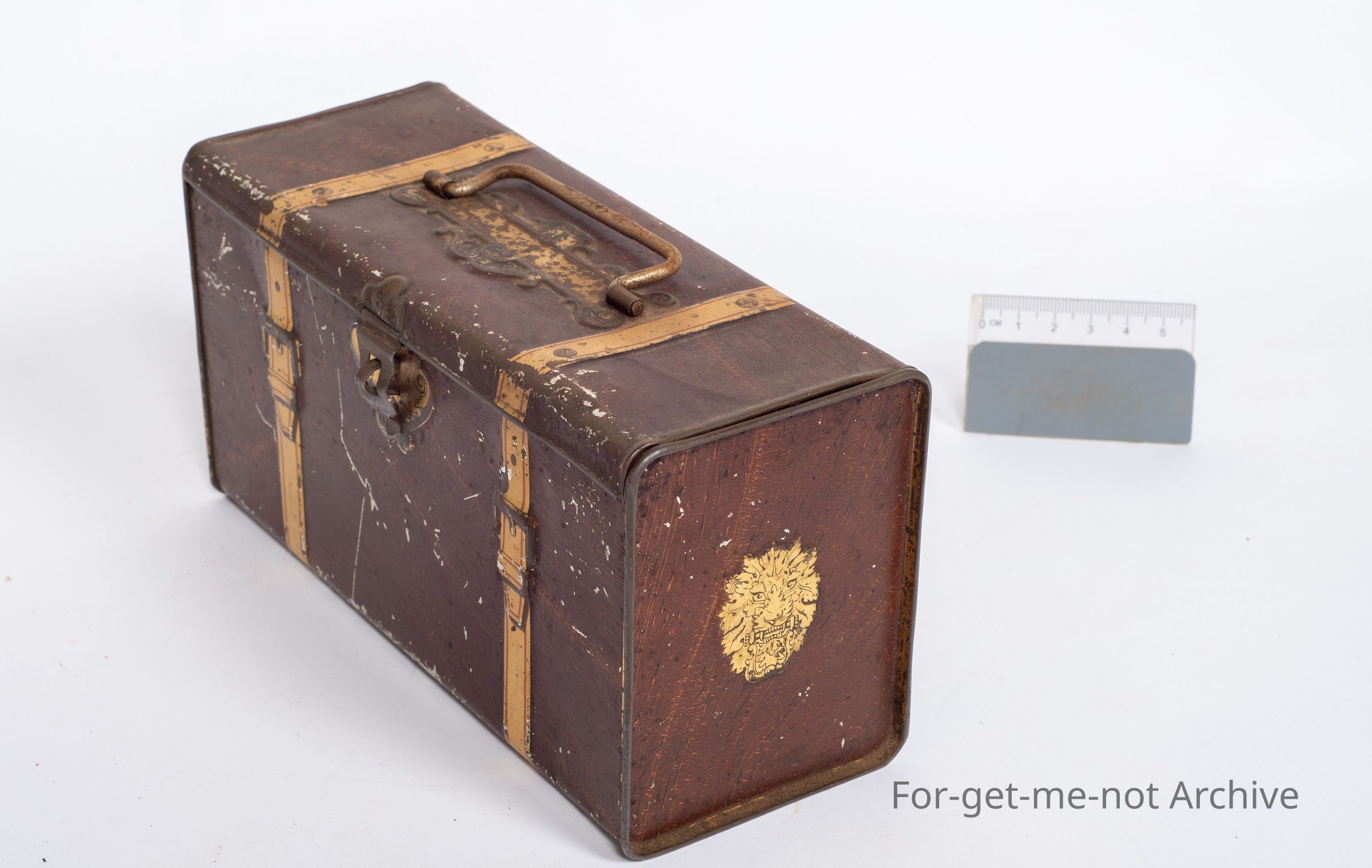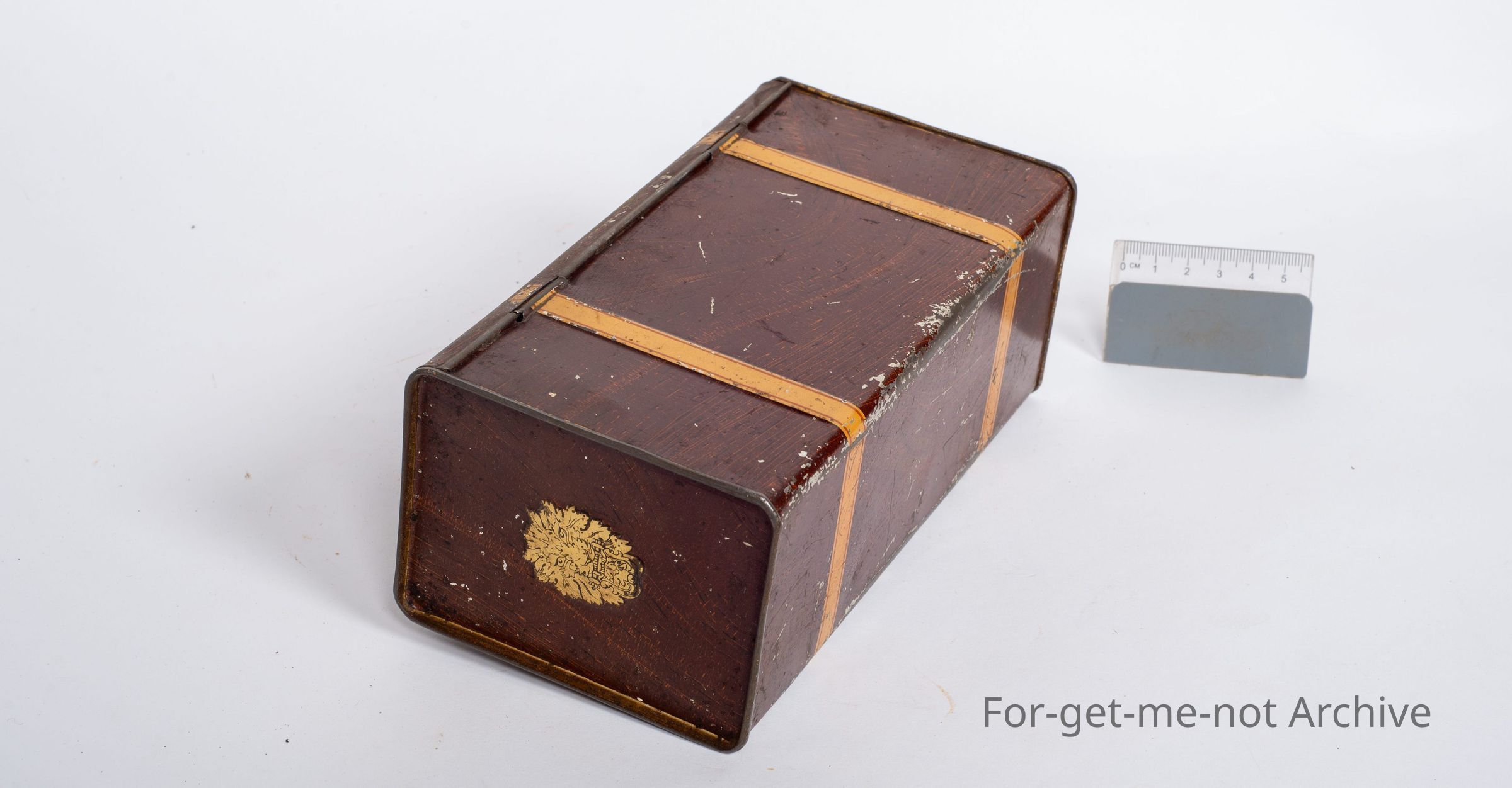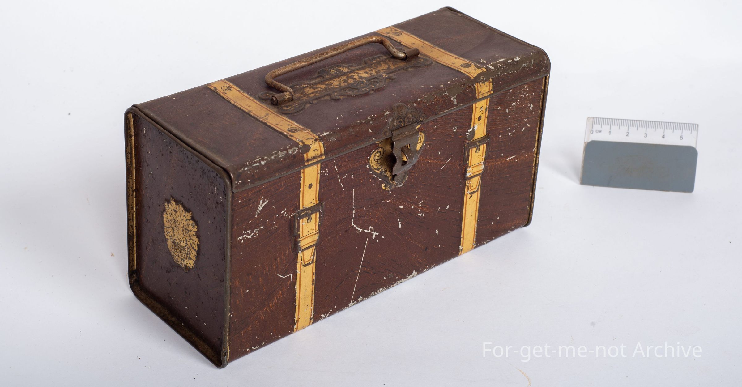 This is a small rectangular tin that's made to look like a tin trunk. No visible name or tin maker on it, possibly being for biscuits.