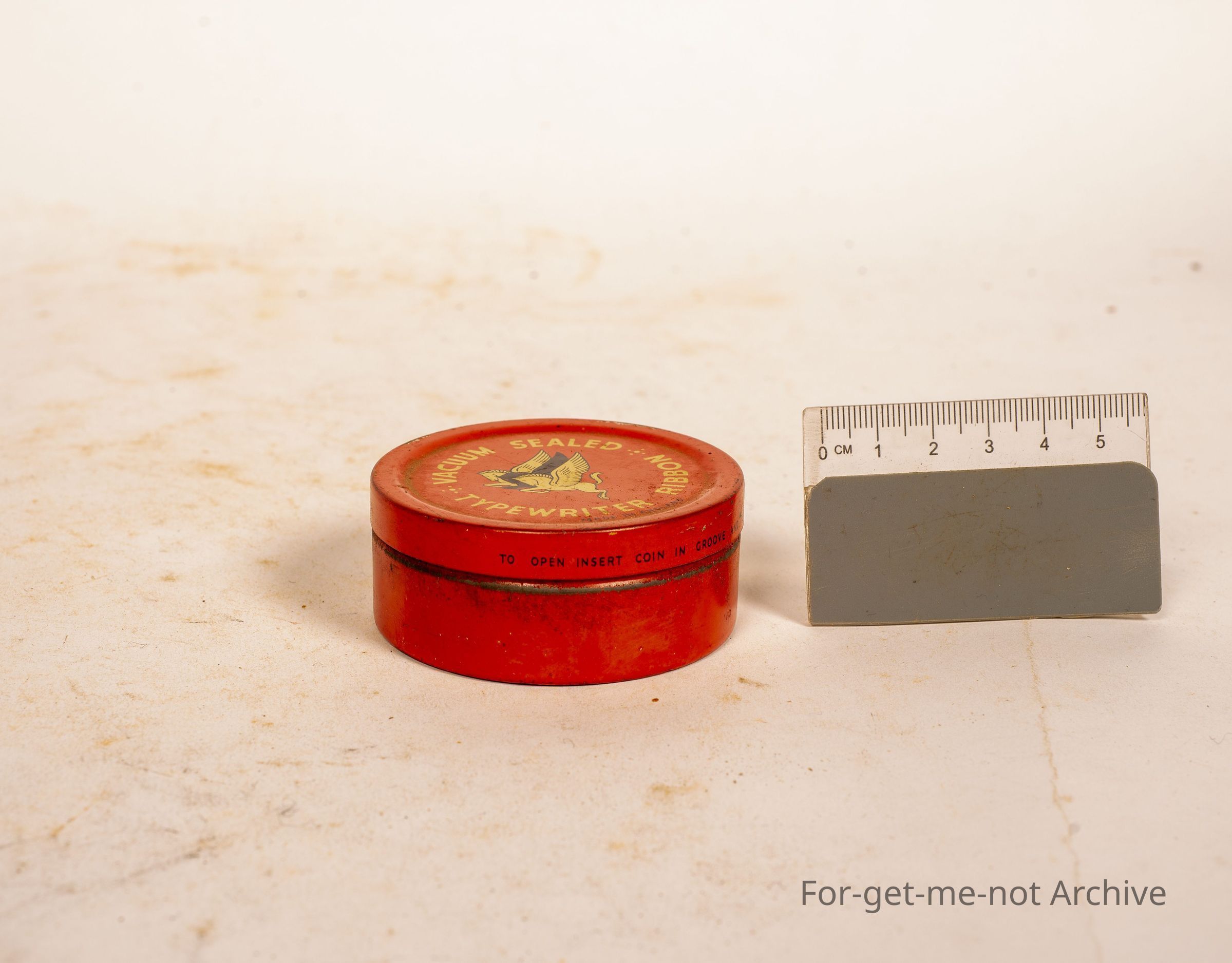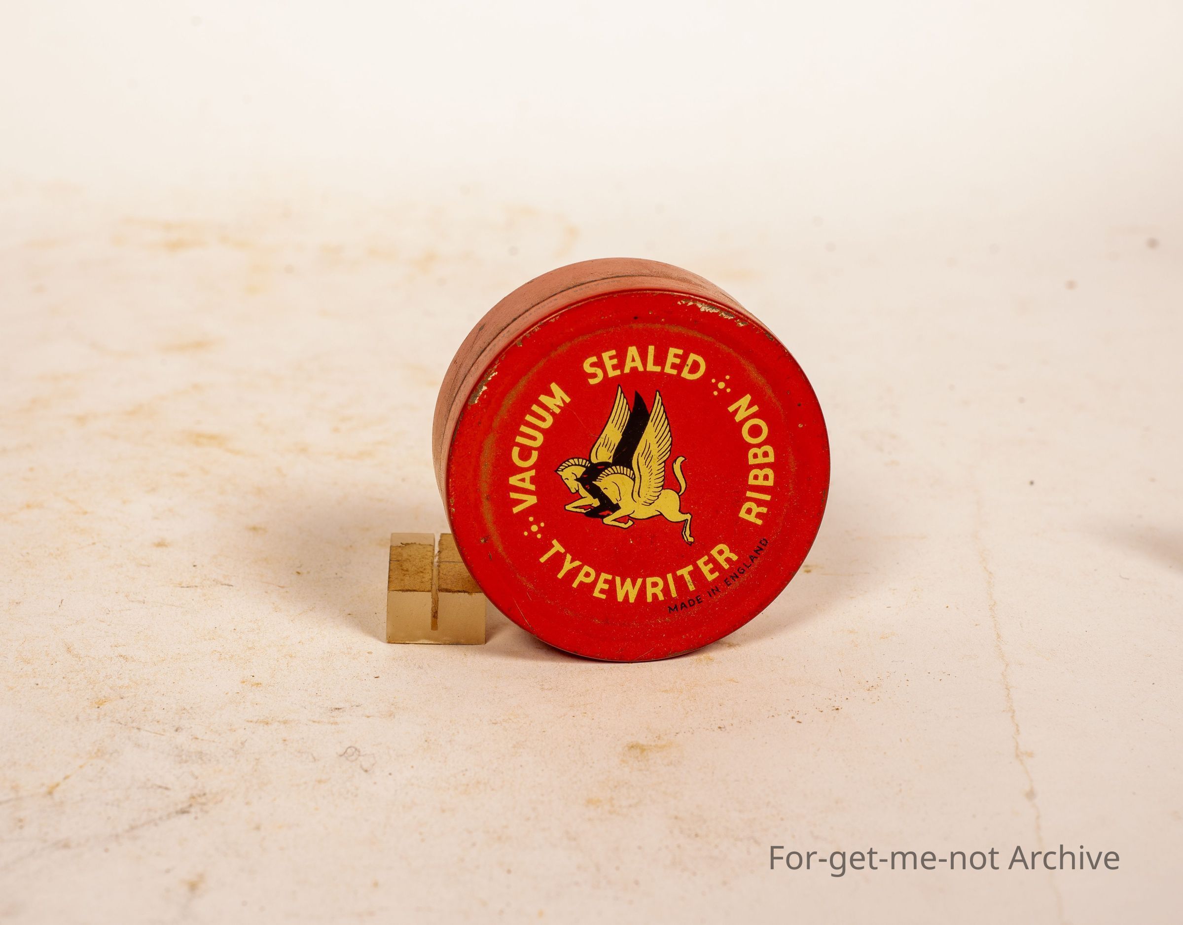 Is a tin of vacuum sealed typewriter ribbon. 2 images of Pegasus on the front.