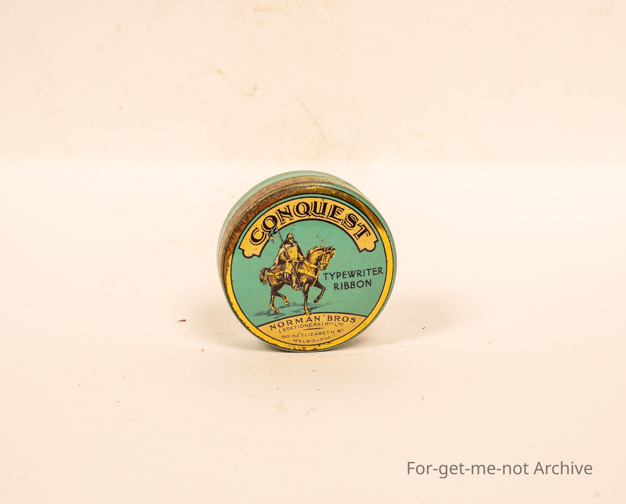 Type of a tin titled Conquest with Norman Soldier on Horseback. Elizabeth Street, put out by Norman Brothers Elizabeth Street, Melbourne.