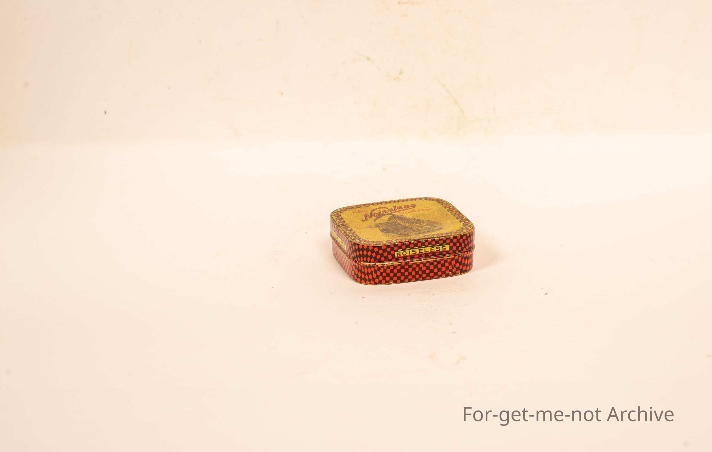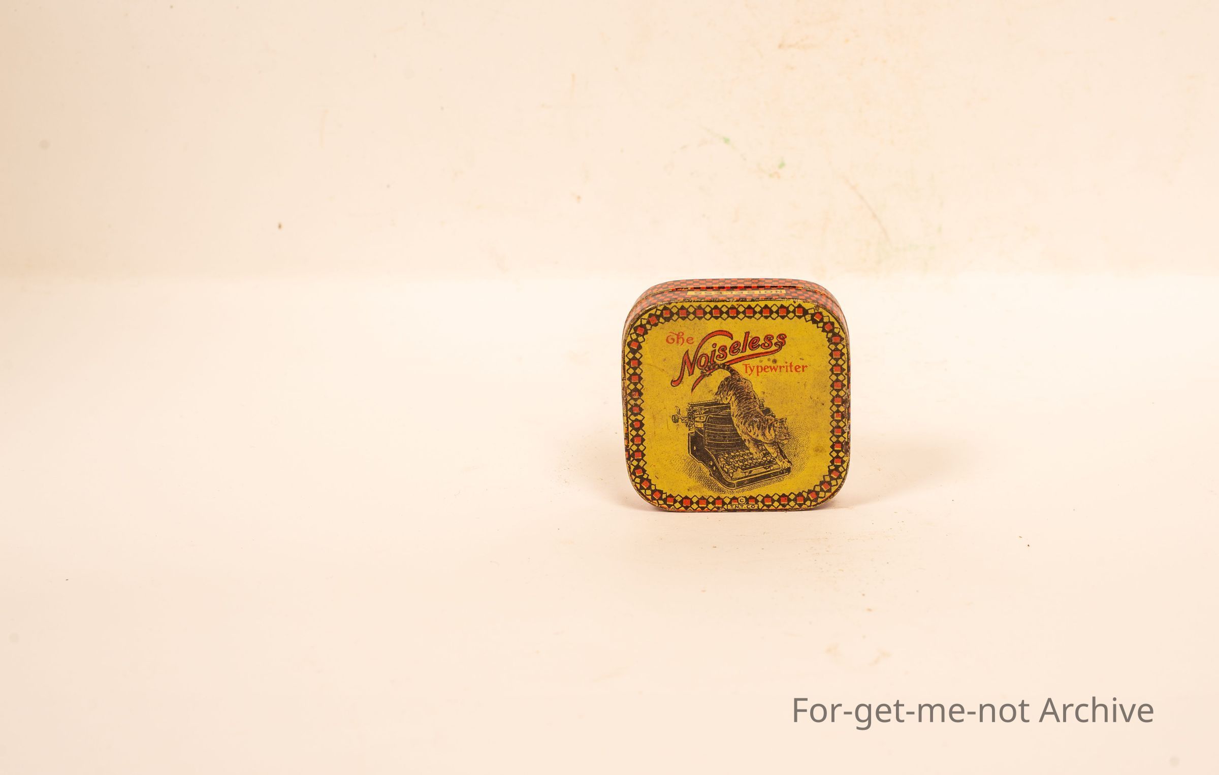 Typewriter tin, titled Noiseless Typewriter. Image of cat climbing over the keyboard found on the floor in Grandma's, High Street, Armadale. Wonderful Tin