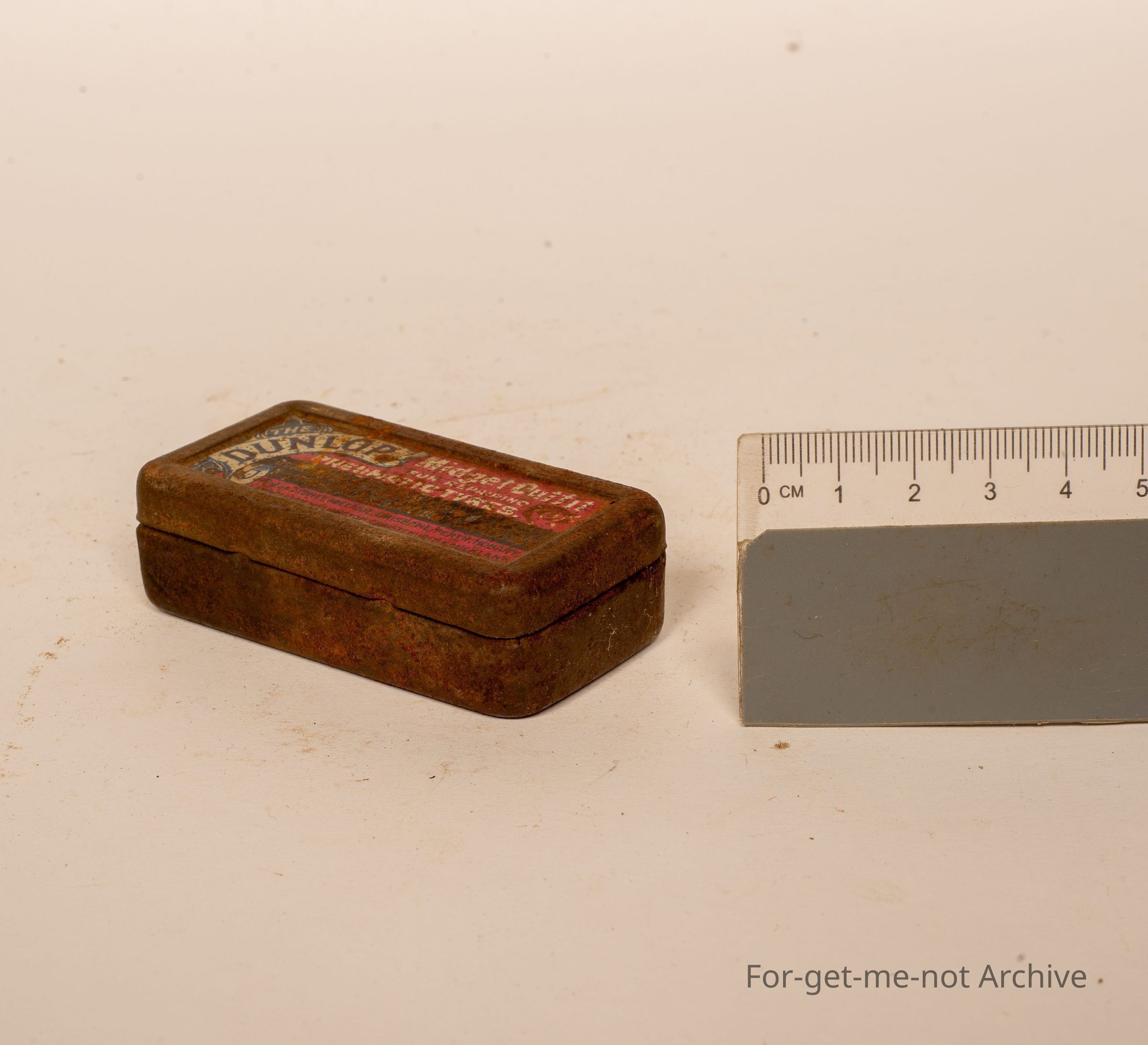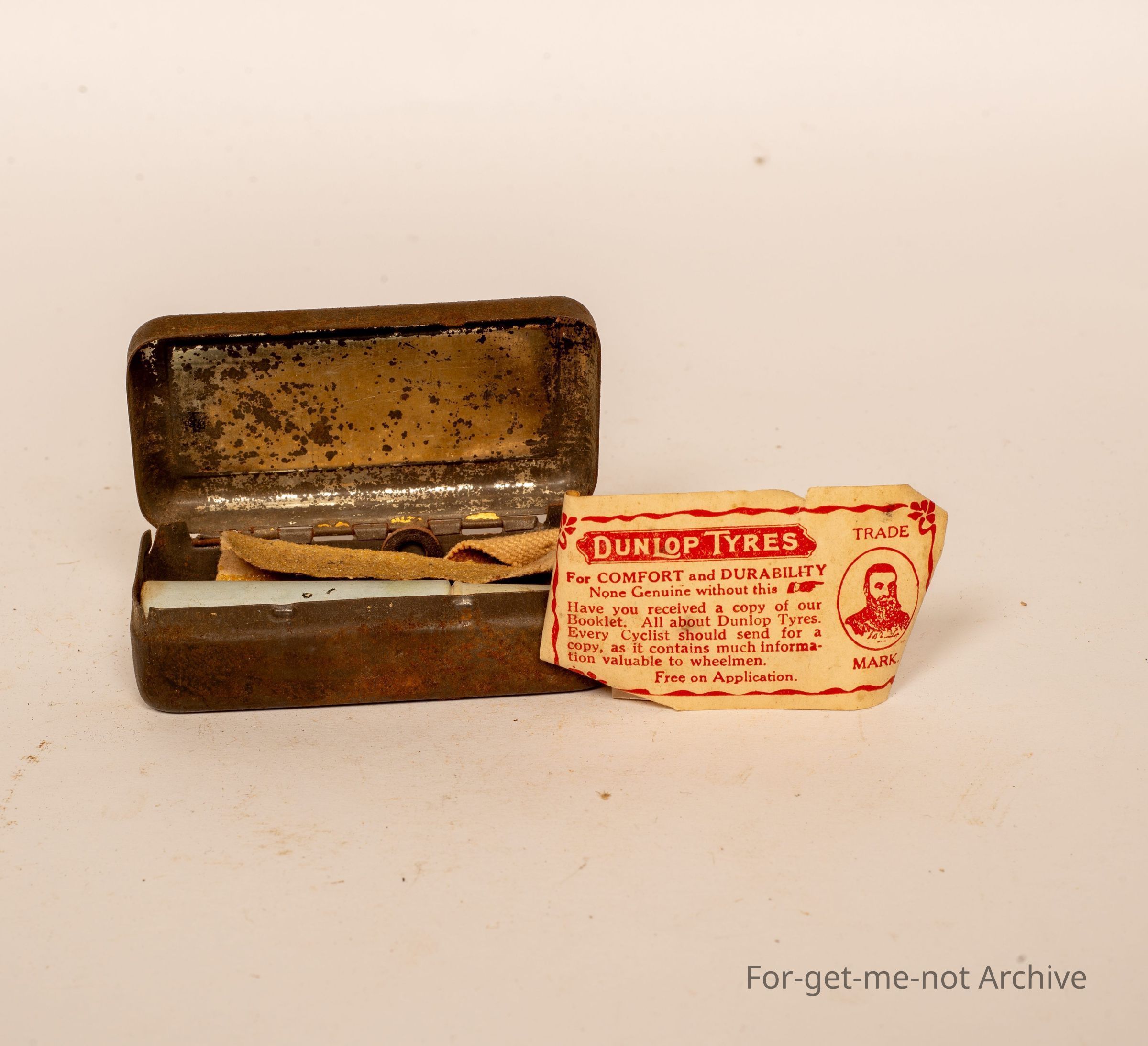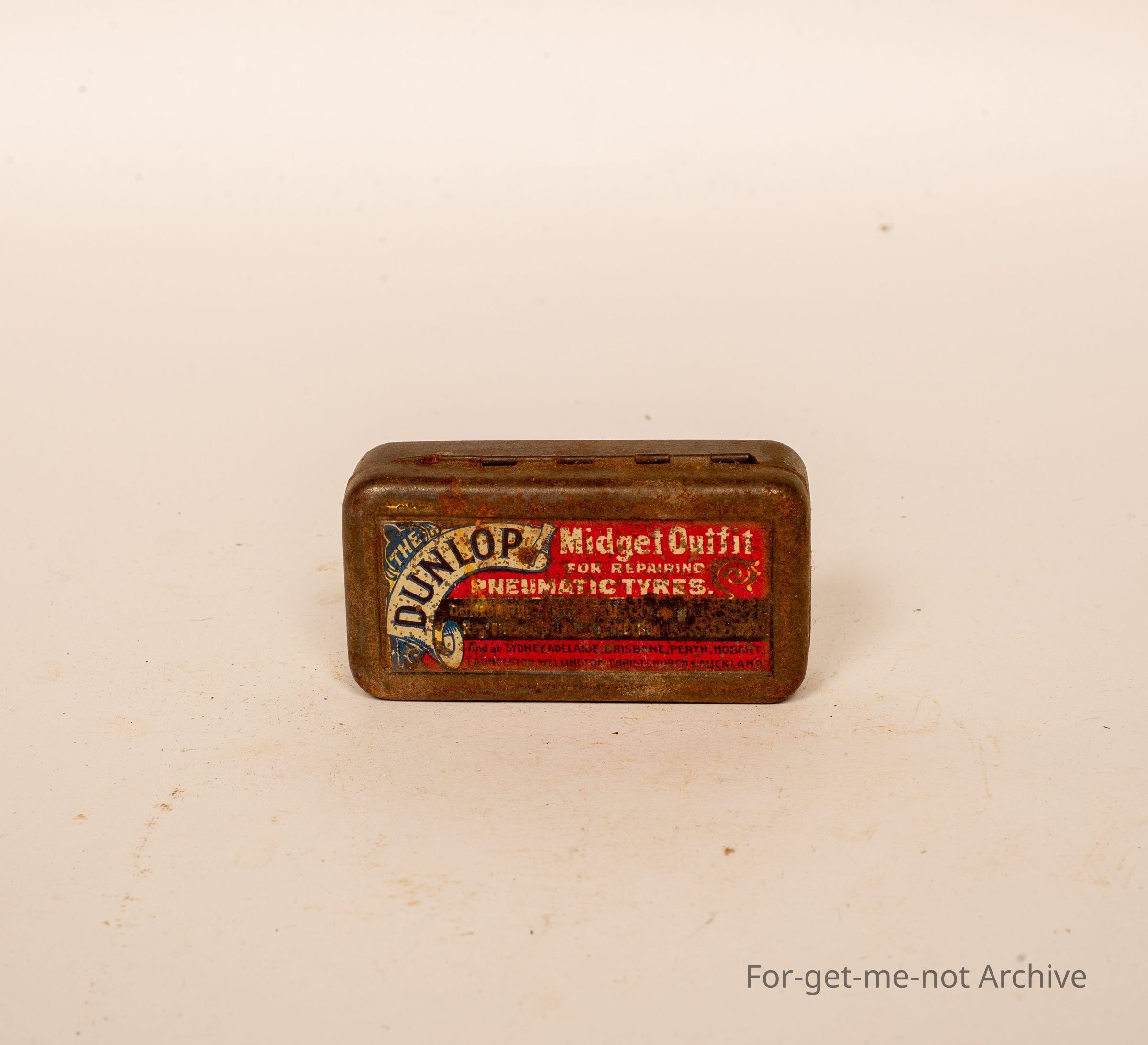Small repair outfit tin for pushbike Tires. this is a Dunlop Midget Outfit fit for Pneumatic Tires, not in good condition but still an example of