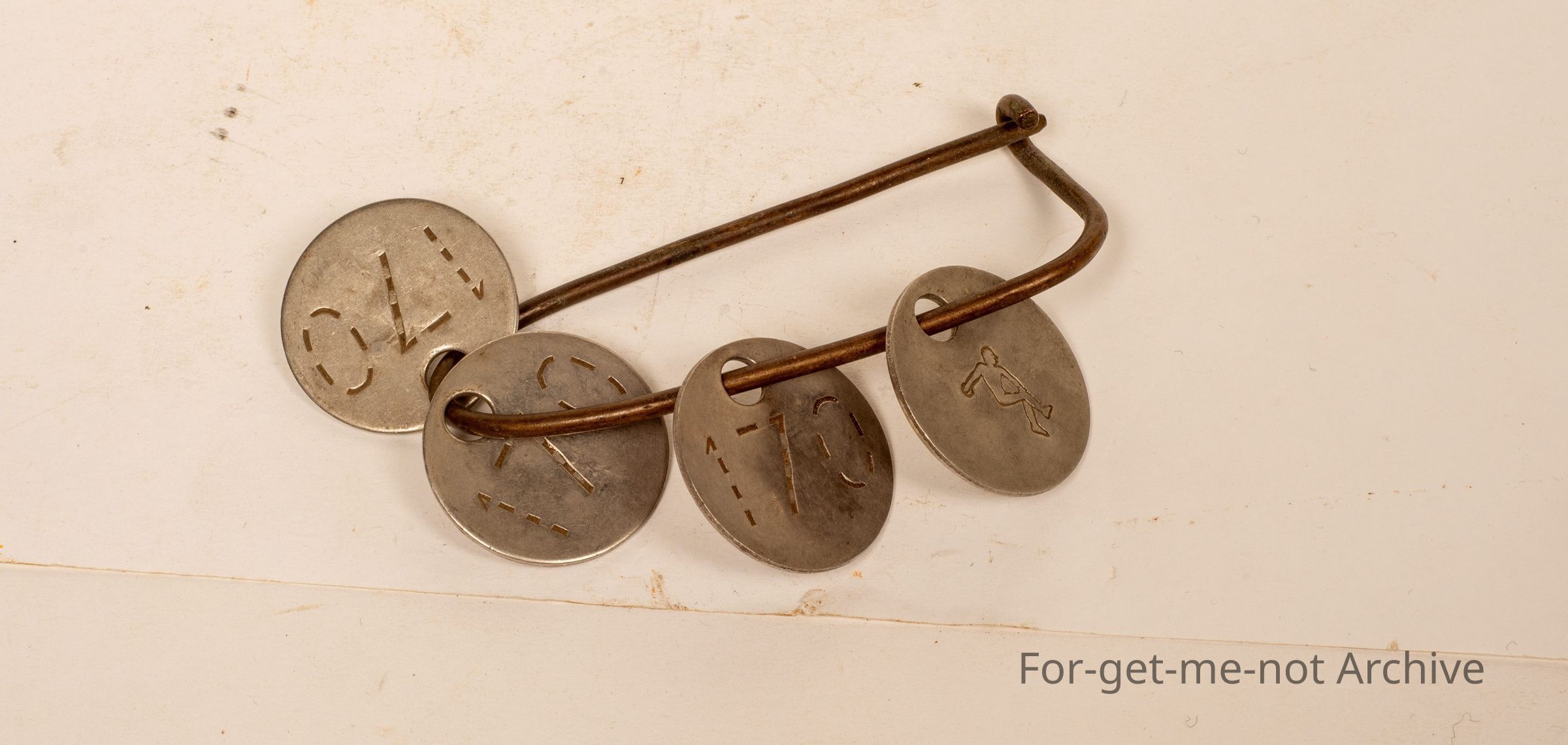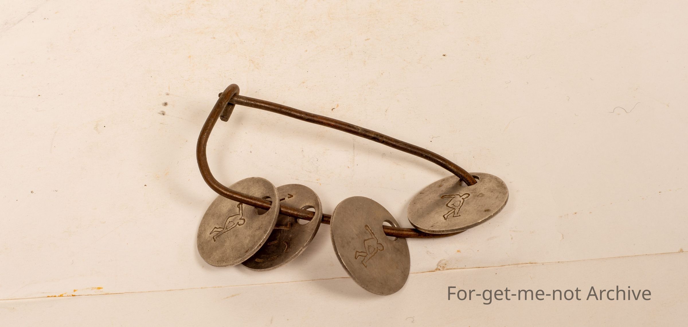 Is a group of metal discs with, probably a discus or a bowls figure numbered on the back on a little rack. Don't know what these are for. Another in the category of what is it?