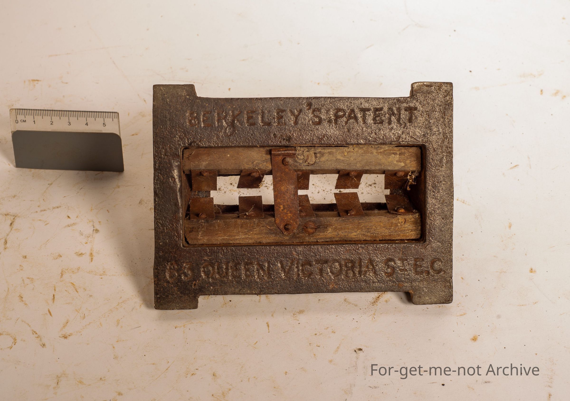 Graphics on the base for Berkeley Street in London. This is quite a heavy piece. Spring loaded to hold something. Berkeley's Patent. Queen Street. Oh. Oh. Berkeley's Patent, Queen Victoria Street, which was in London. The it's unknown what it was holding to display.Collection