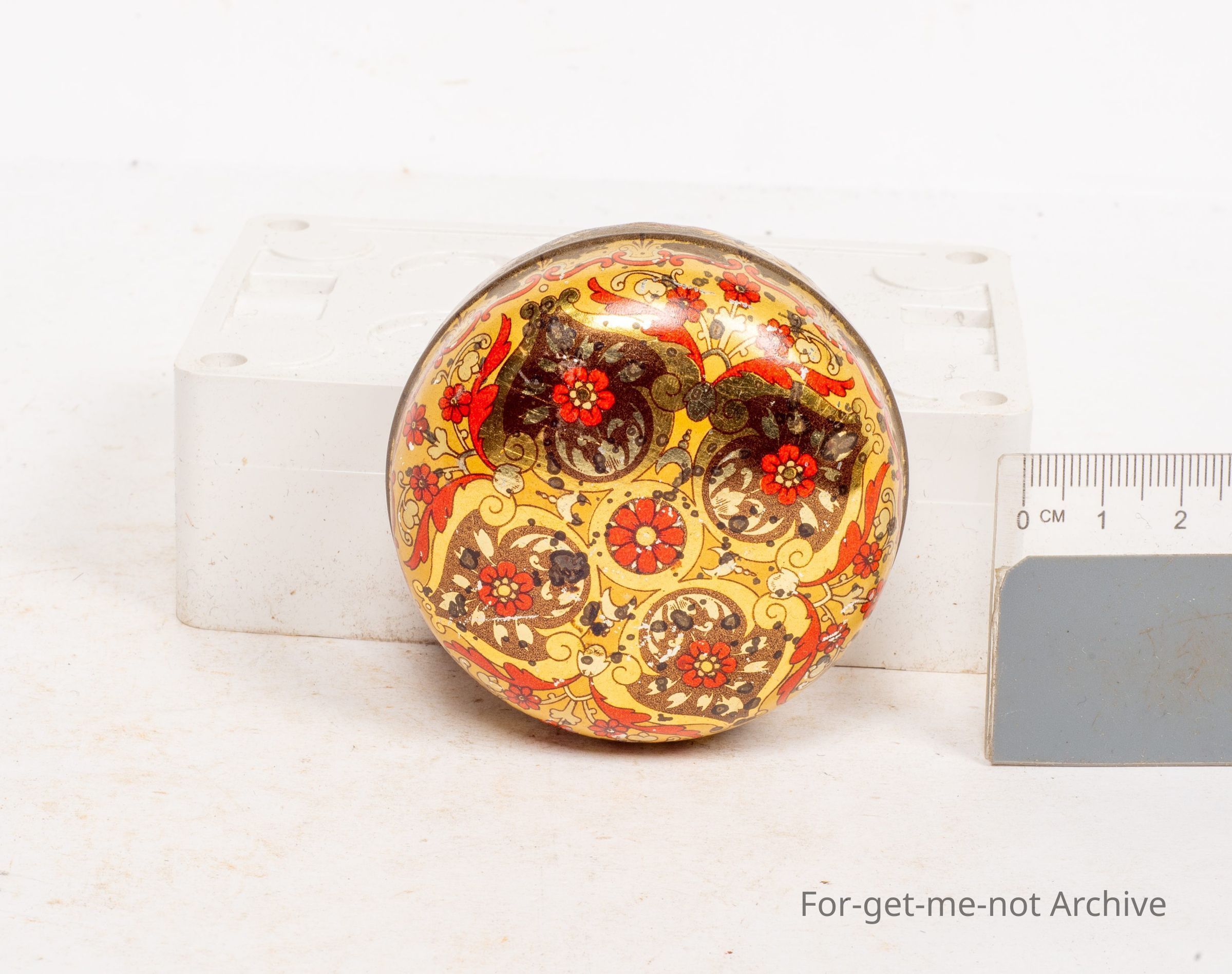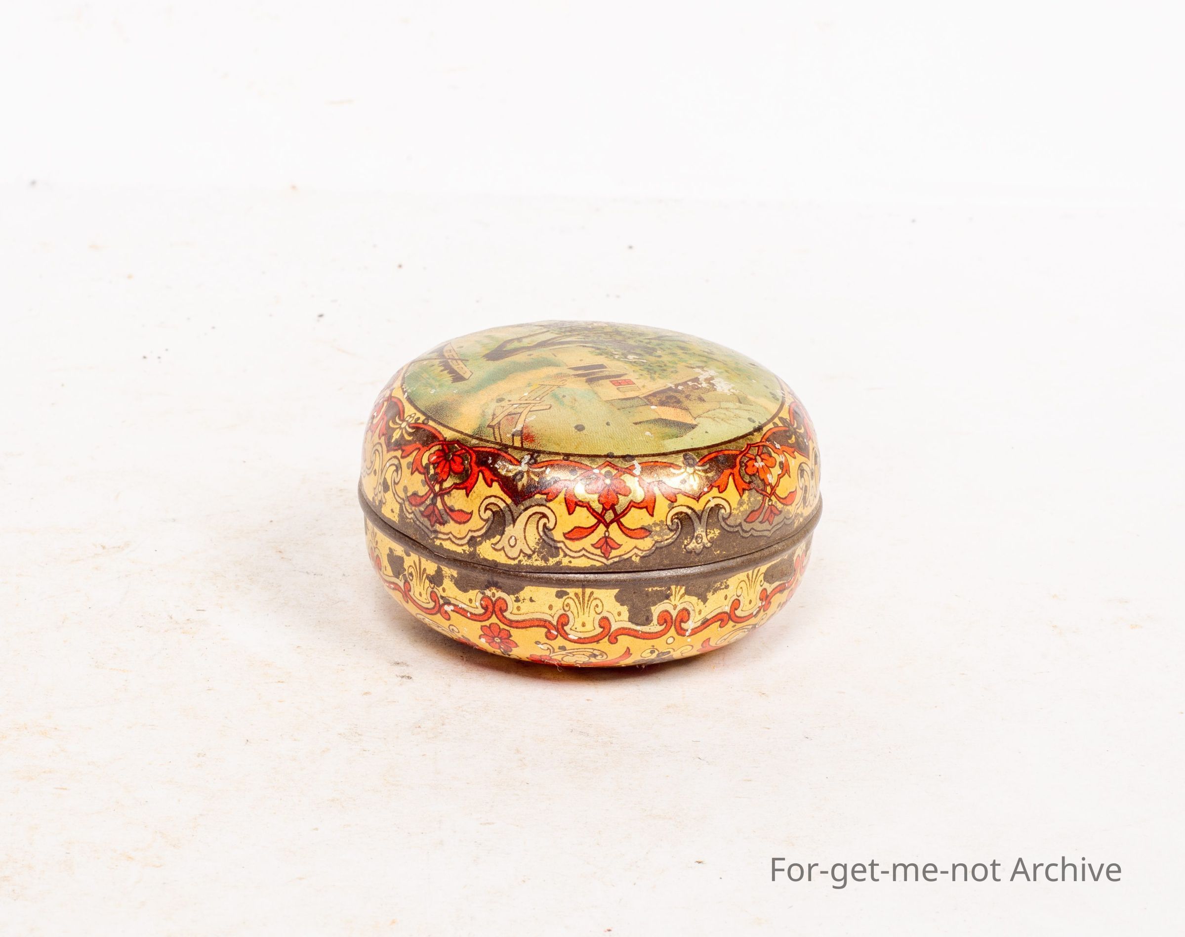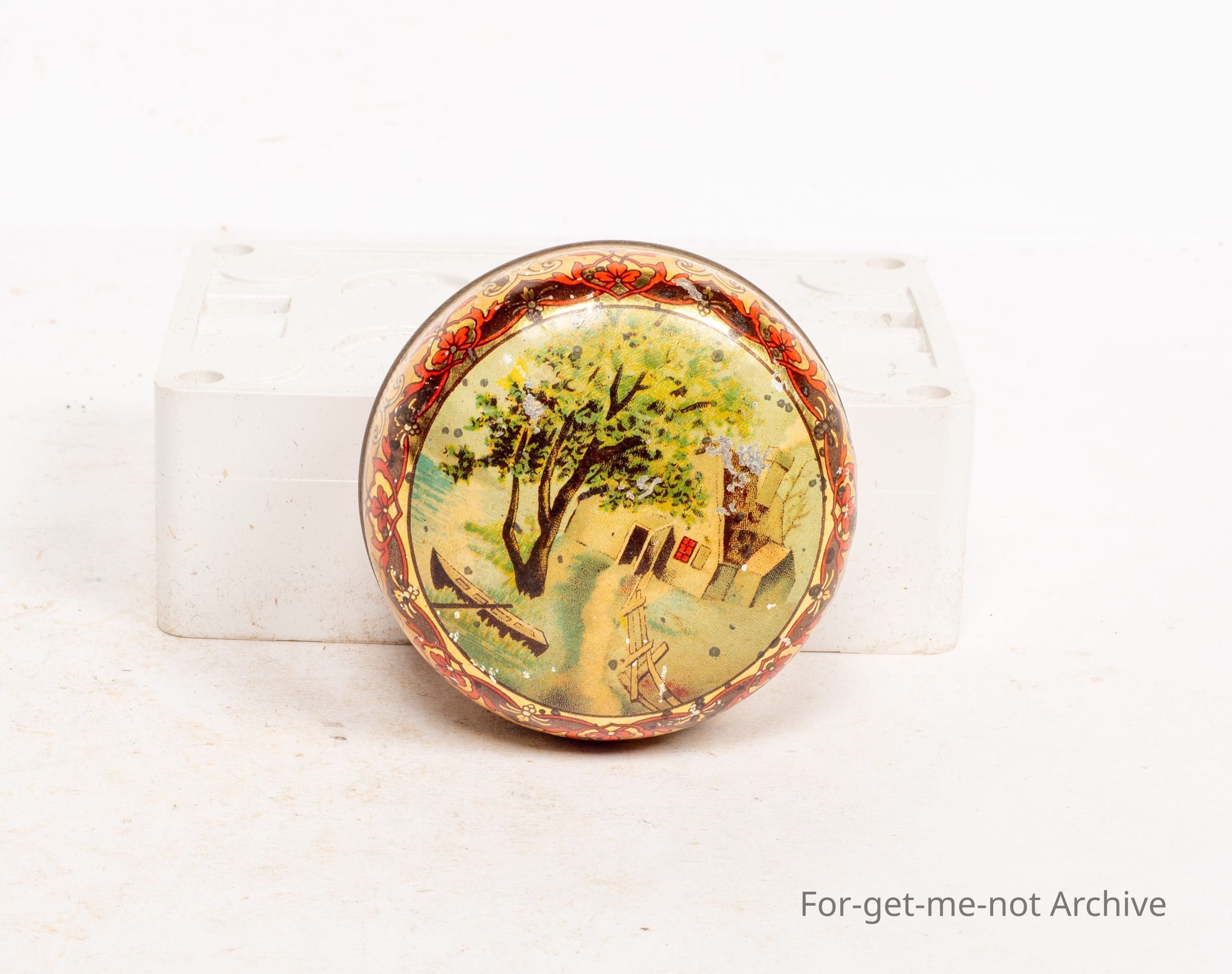 A small, very decorative tin of a country scene with a boat besides water. Very ornate, possibly early. No information supplied whatsoever. Maybe it should go into the what is it category.Collection