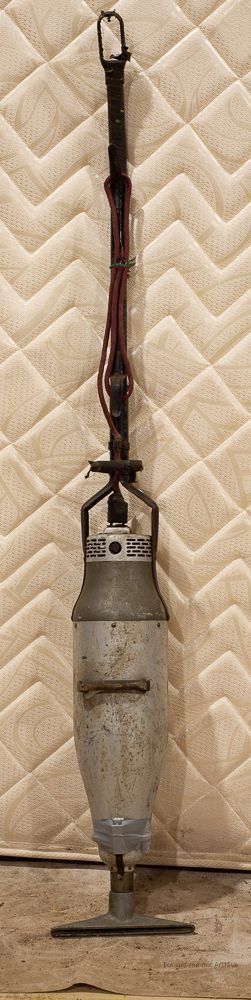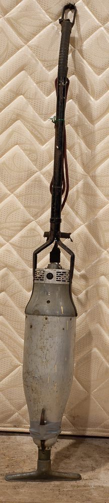 electric motor, very early primitive type vacuum cleaner, probably small capacity metal base, hand pushed