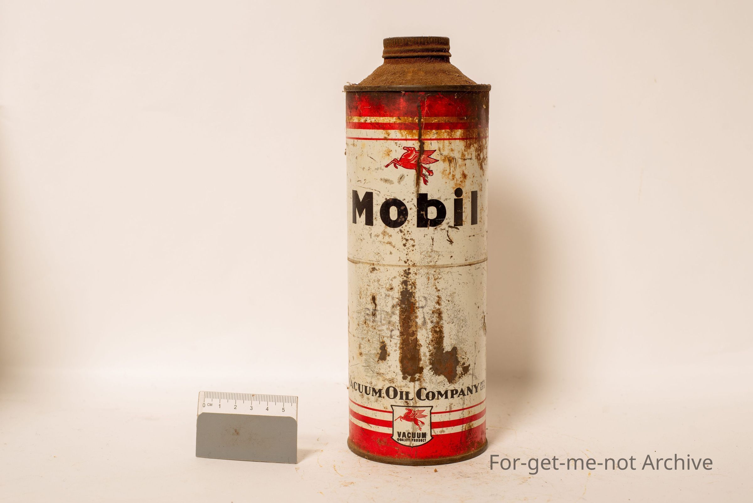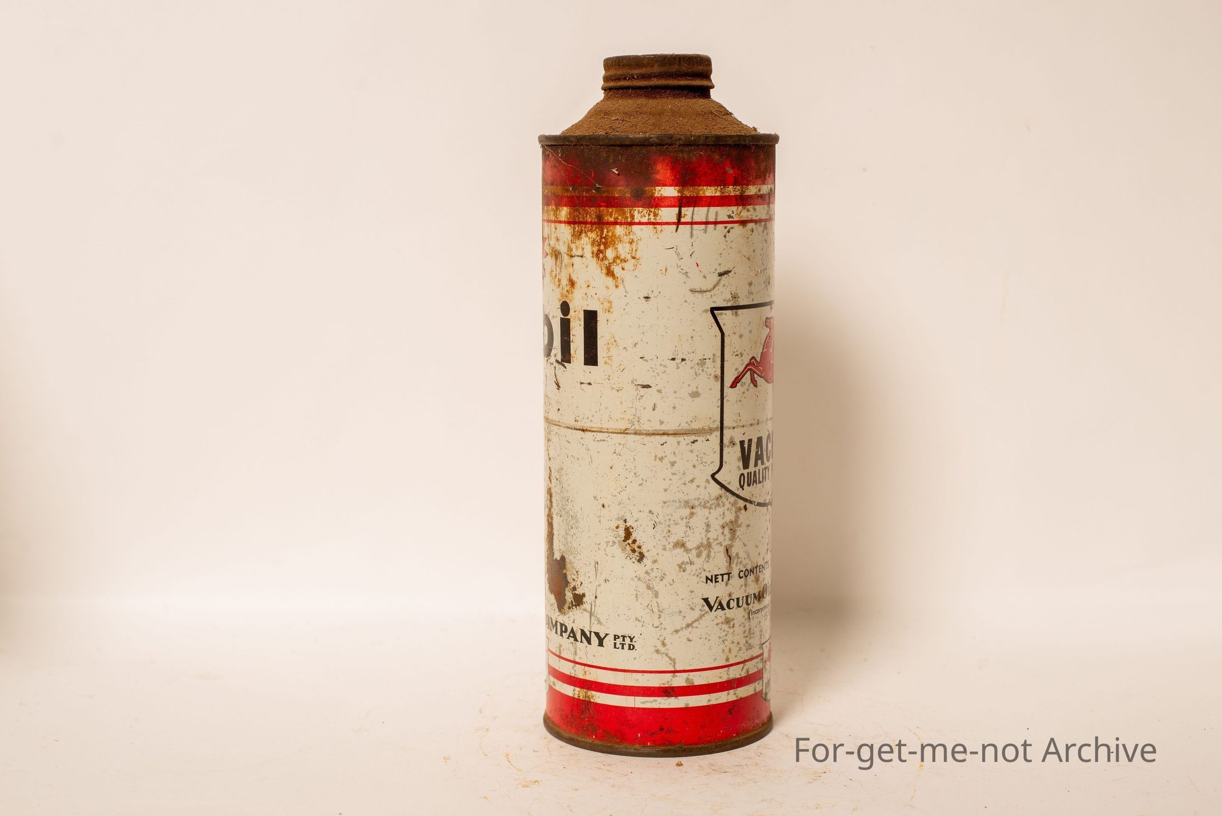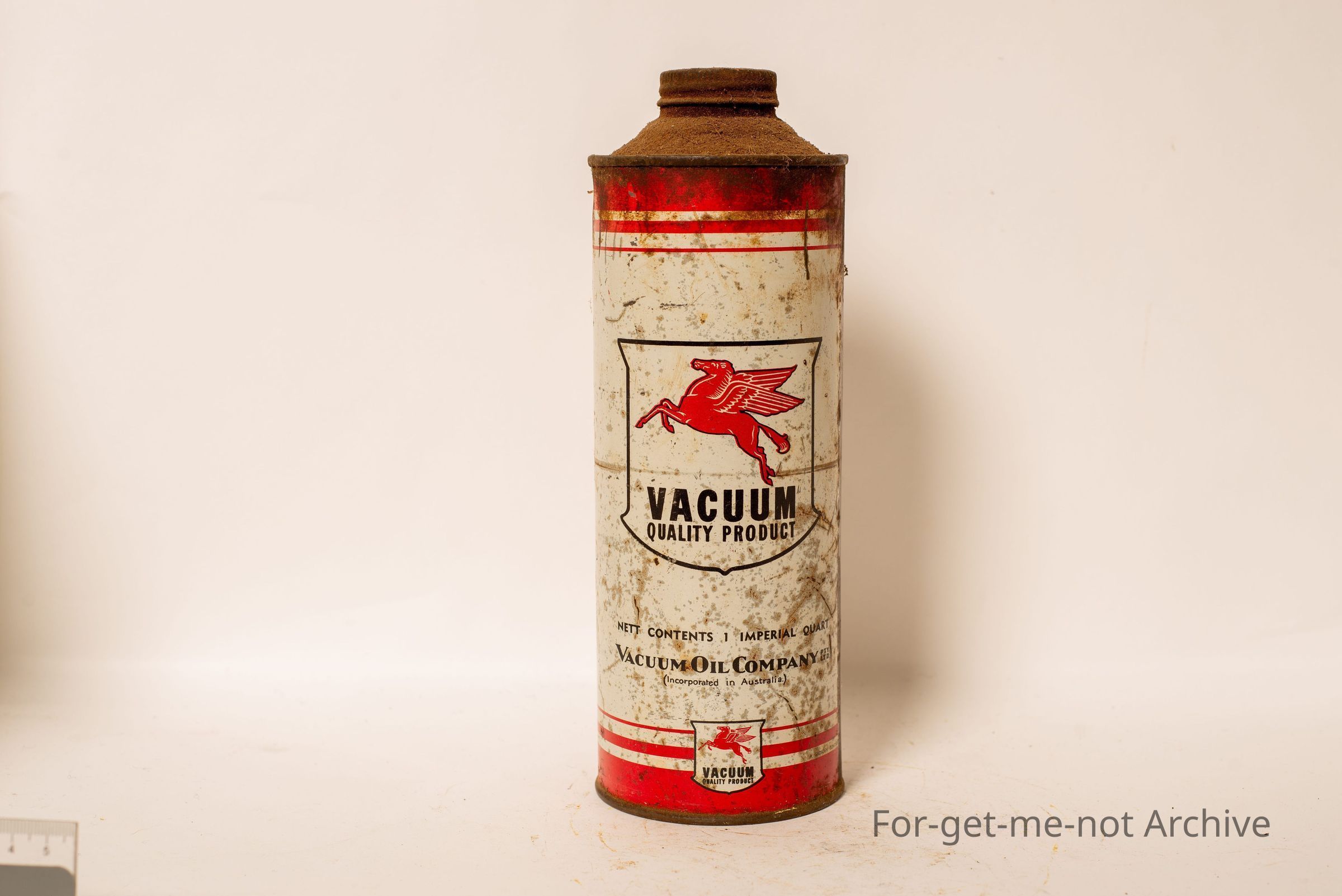 A tin of Vacuum oil Company, contents 1 imperial quart of oil, in pretty good condition. This is the period when Mobil had taken over Vacuum Oil Company and was using the sales symbol of Pegasus.Collection
