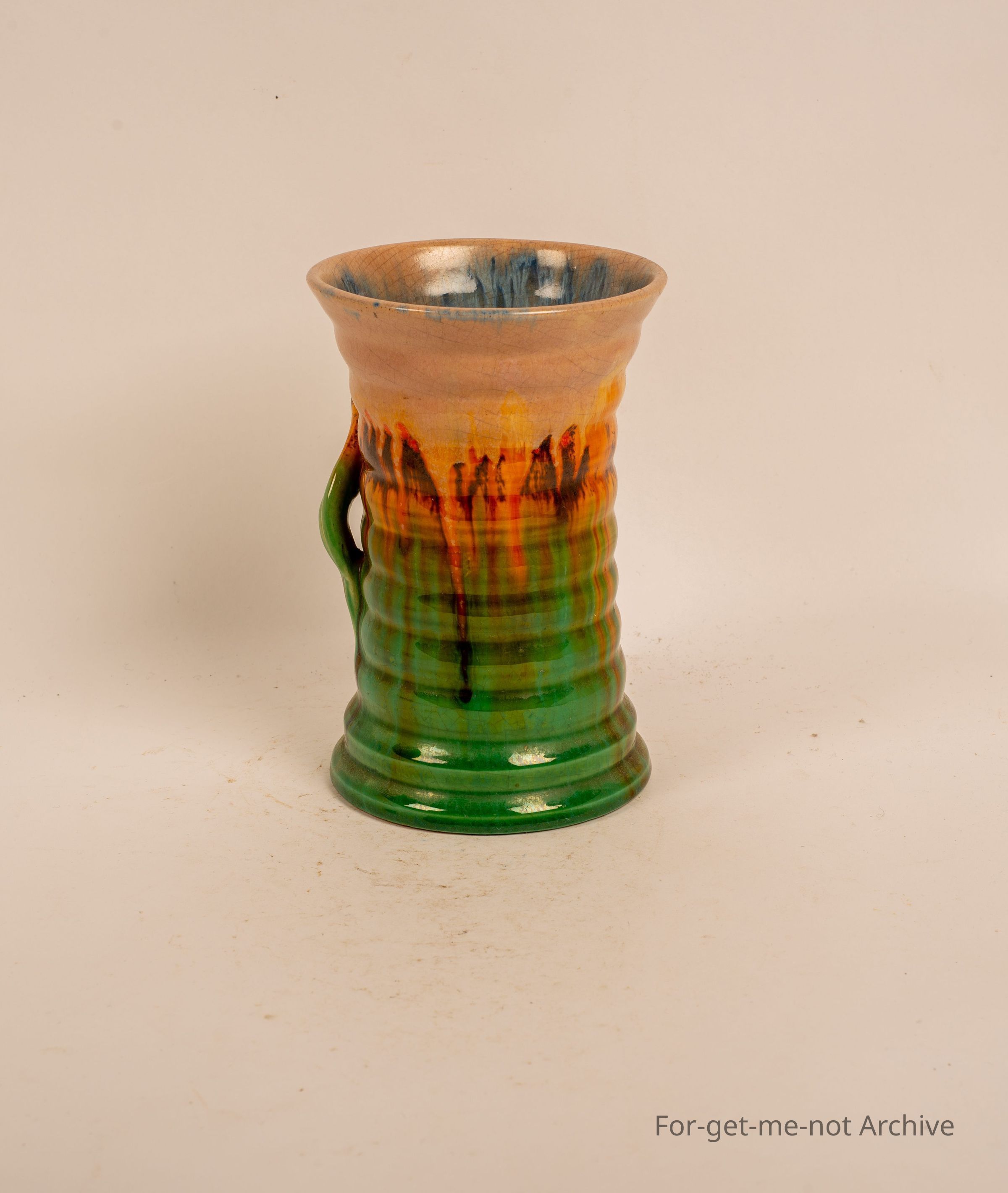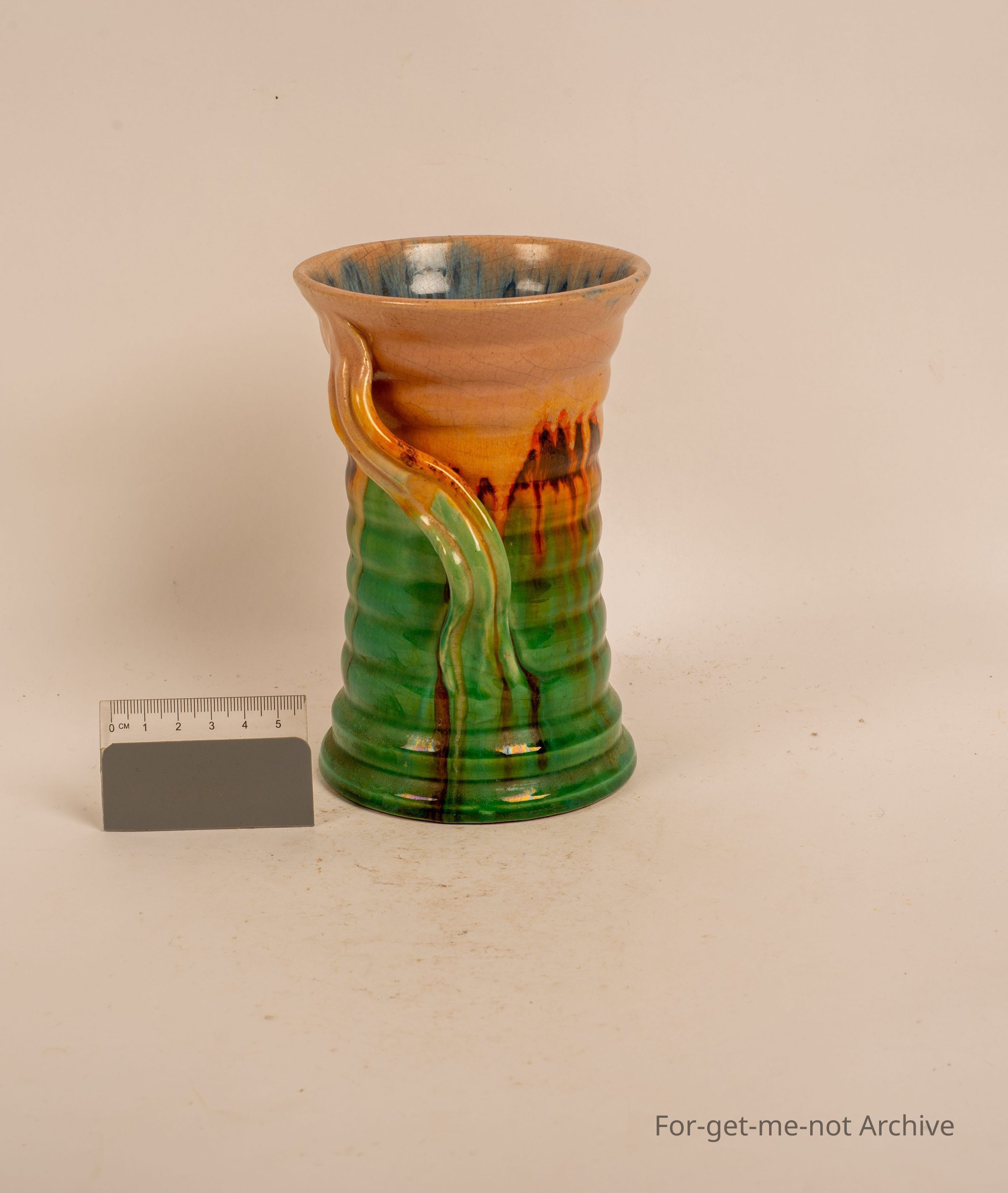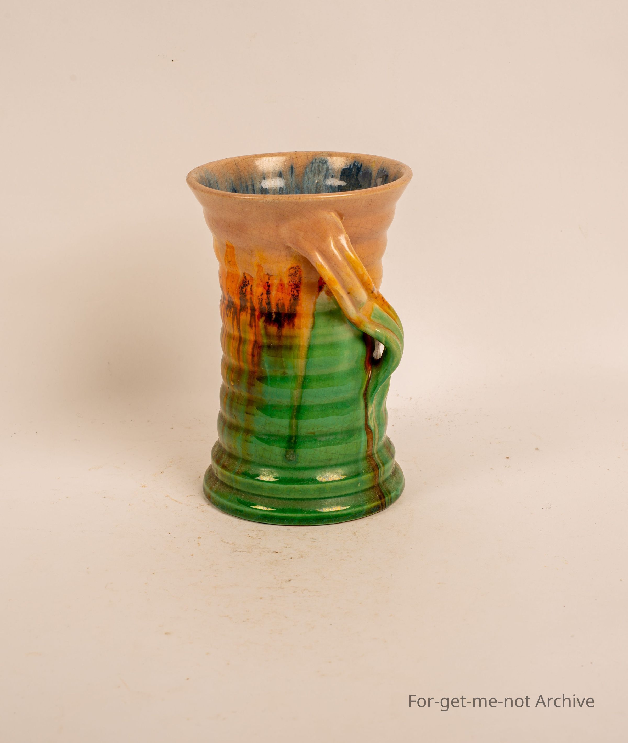 Beautifully colourful, well made vase with twisted handle, 4 different coloured glazes on it with blue interior green on the externals. Lovely piece of Remued in excellent order