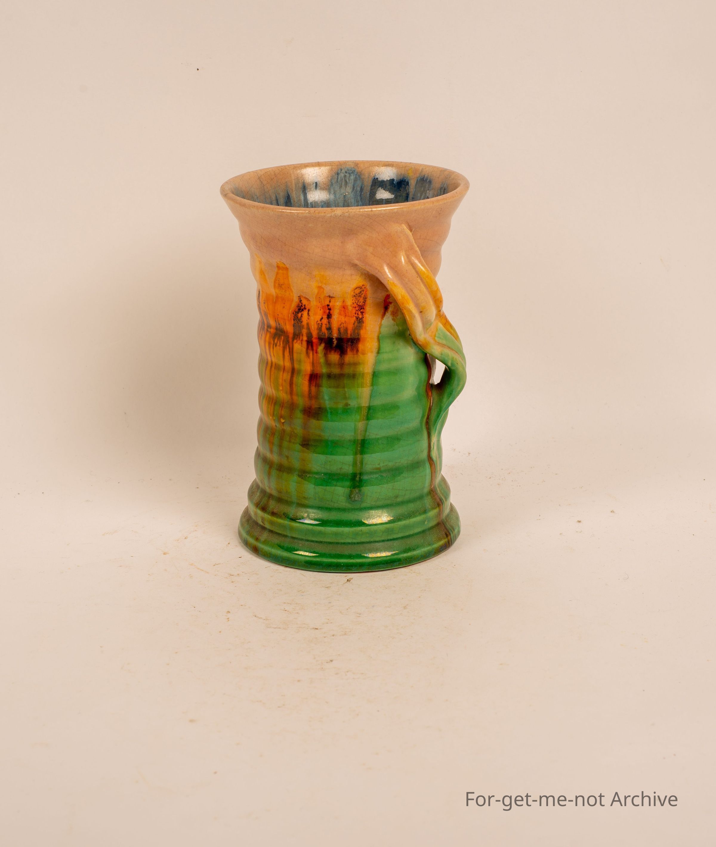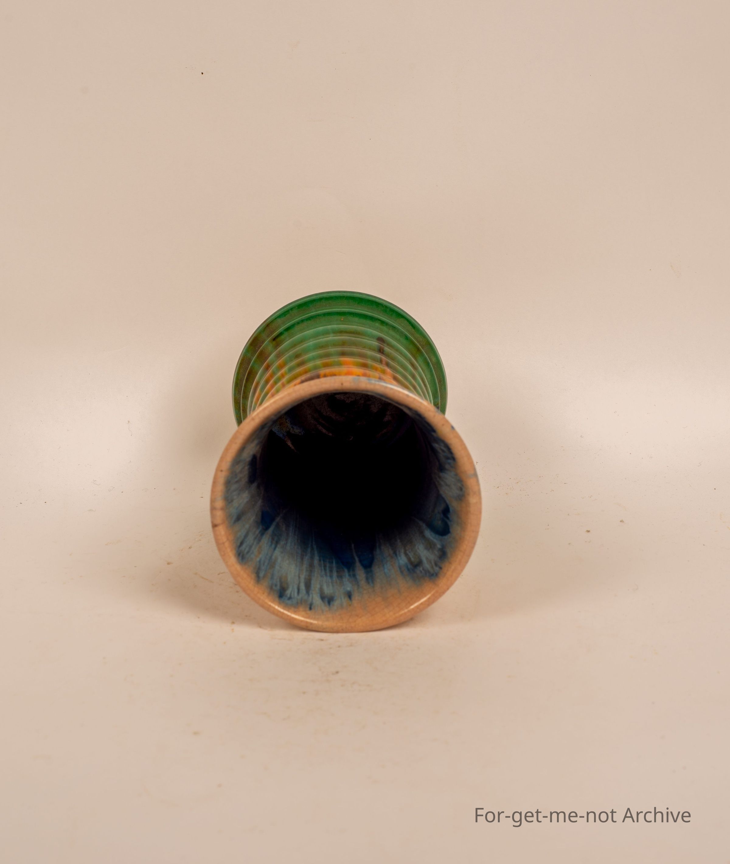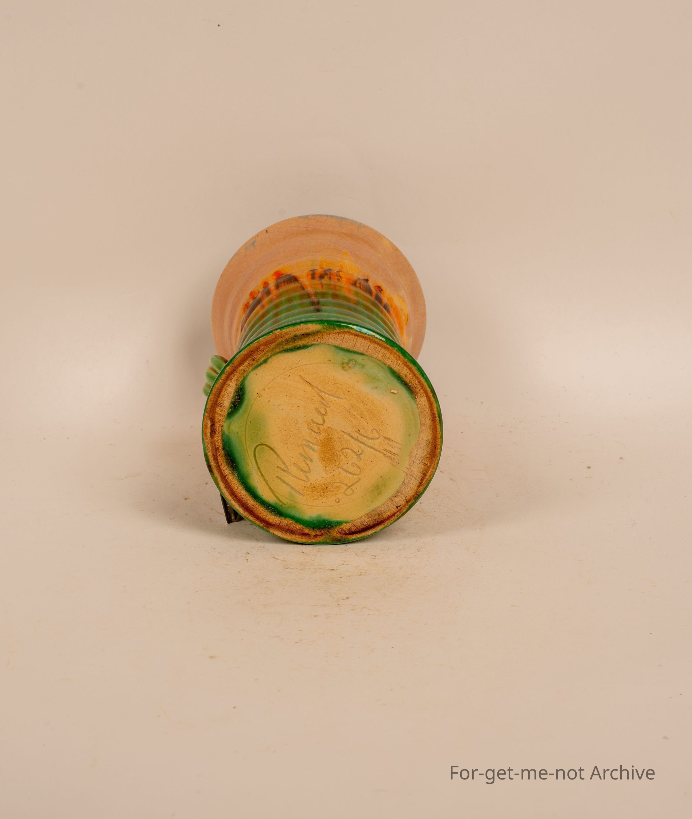 Beautifully colourful, well made vase with twisted handle, 4 different coloured glazes on it with blue interior green on the externals. Lovely piece of Remued in excellent order