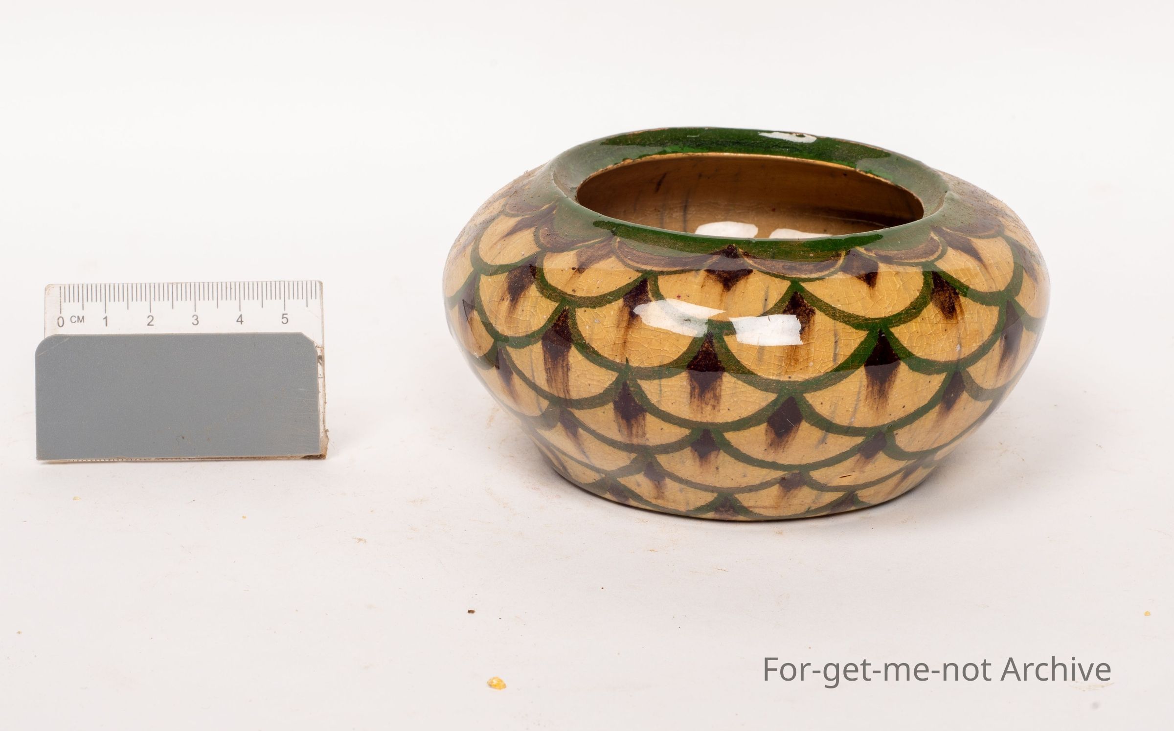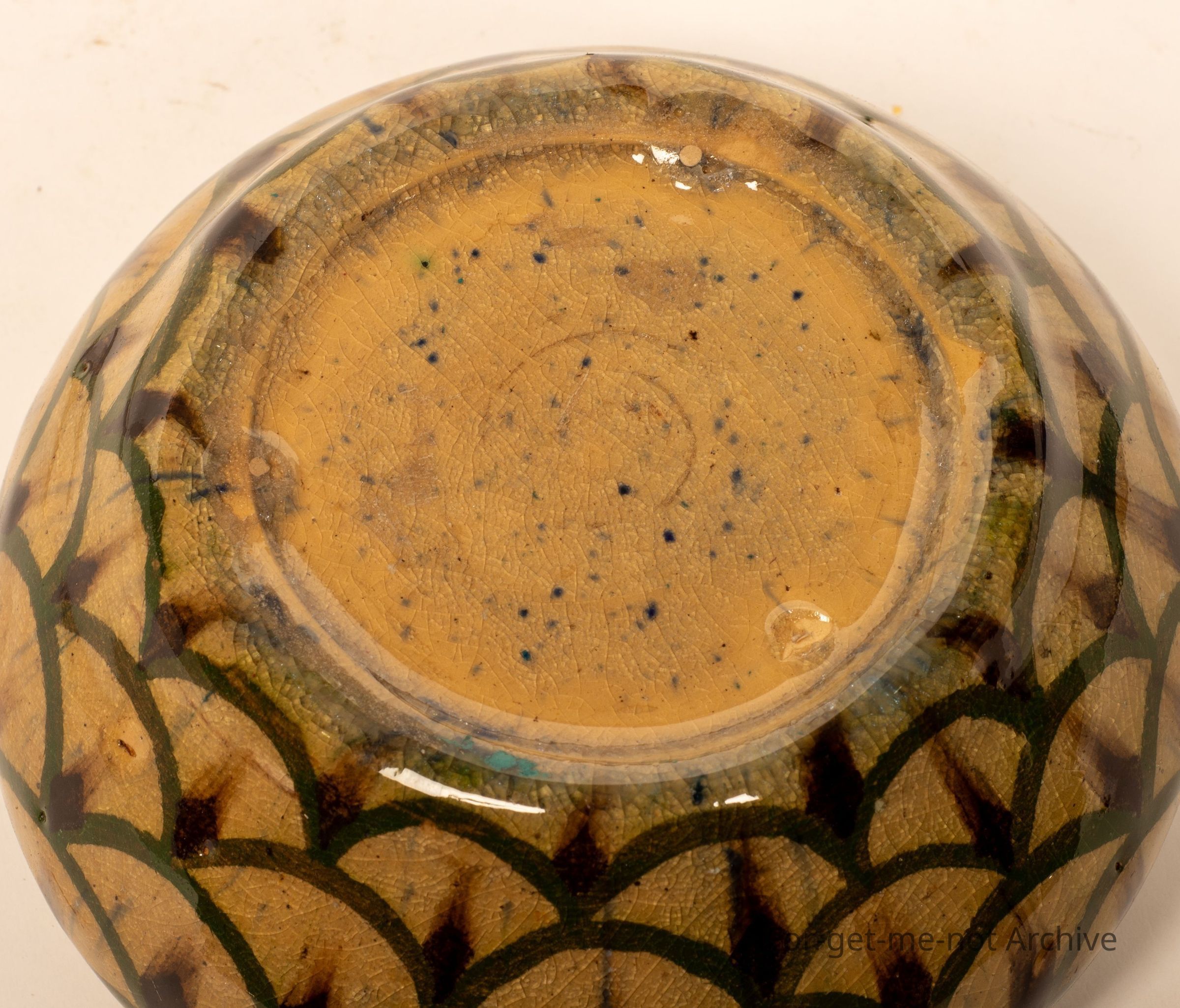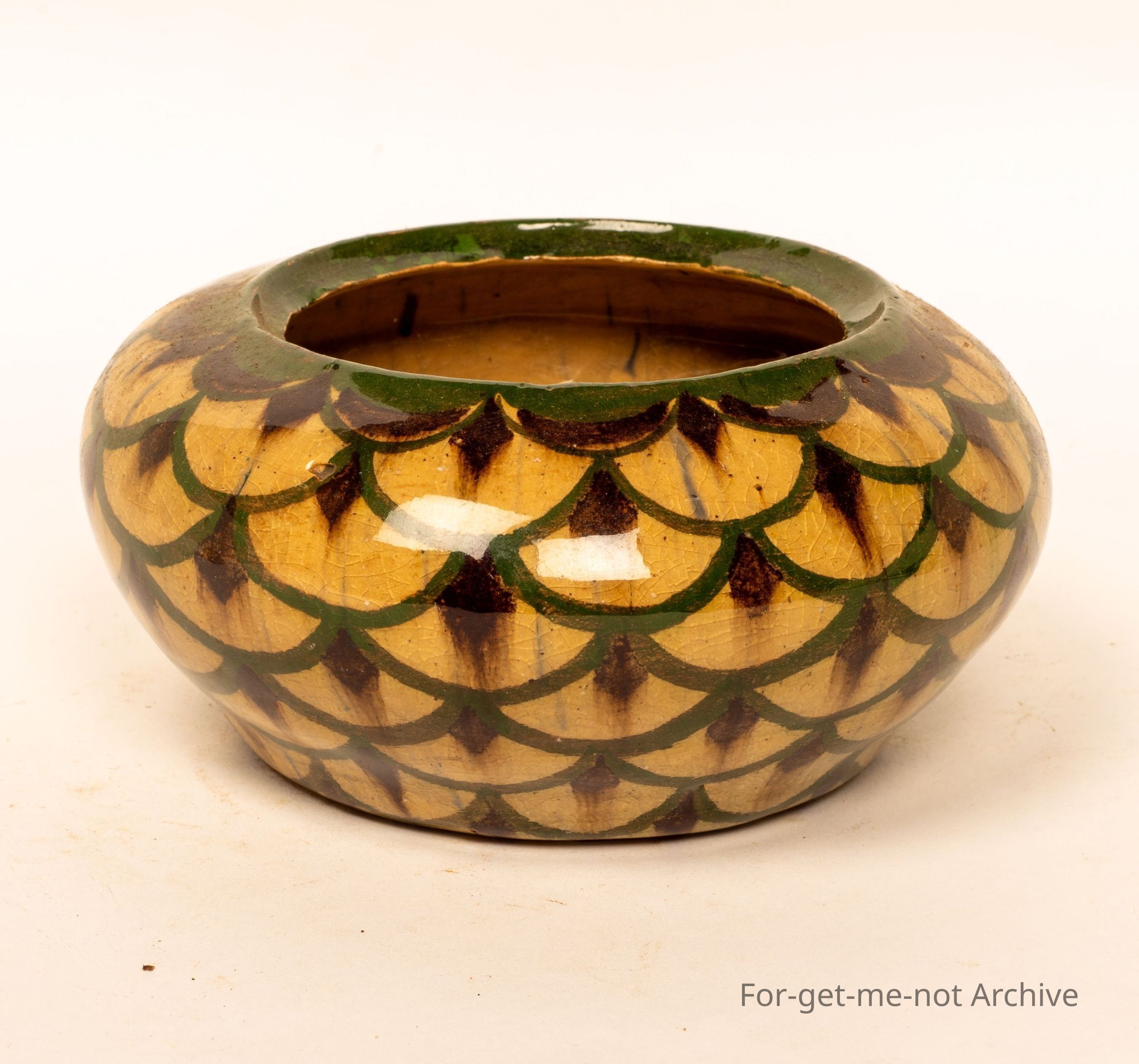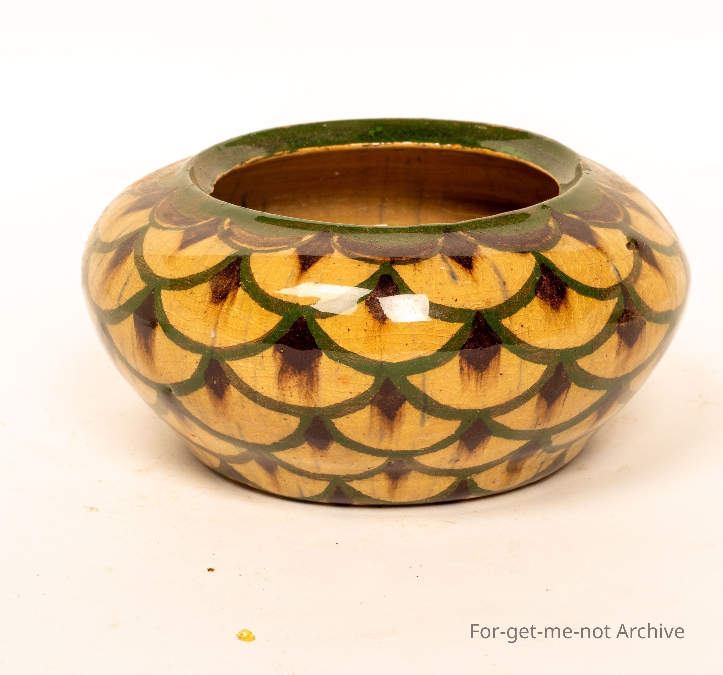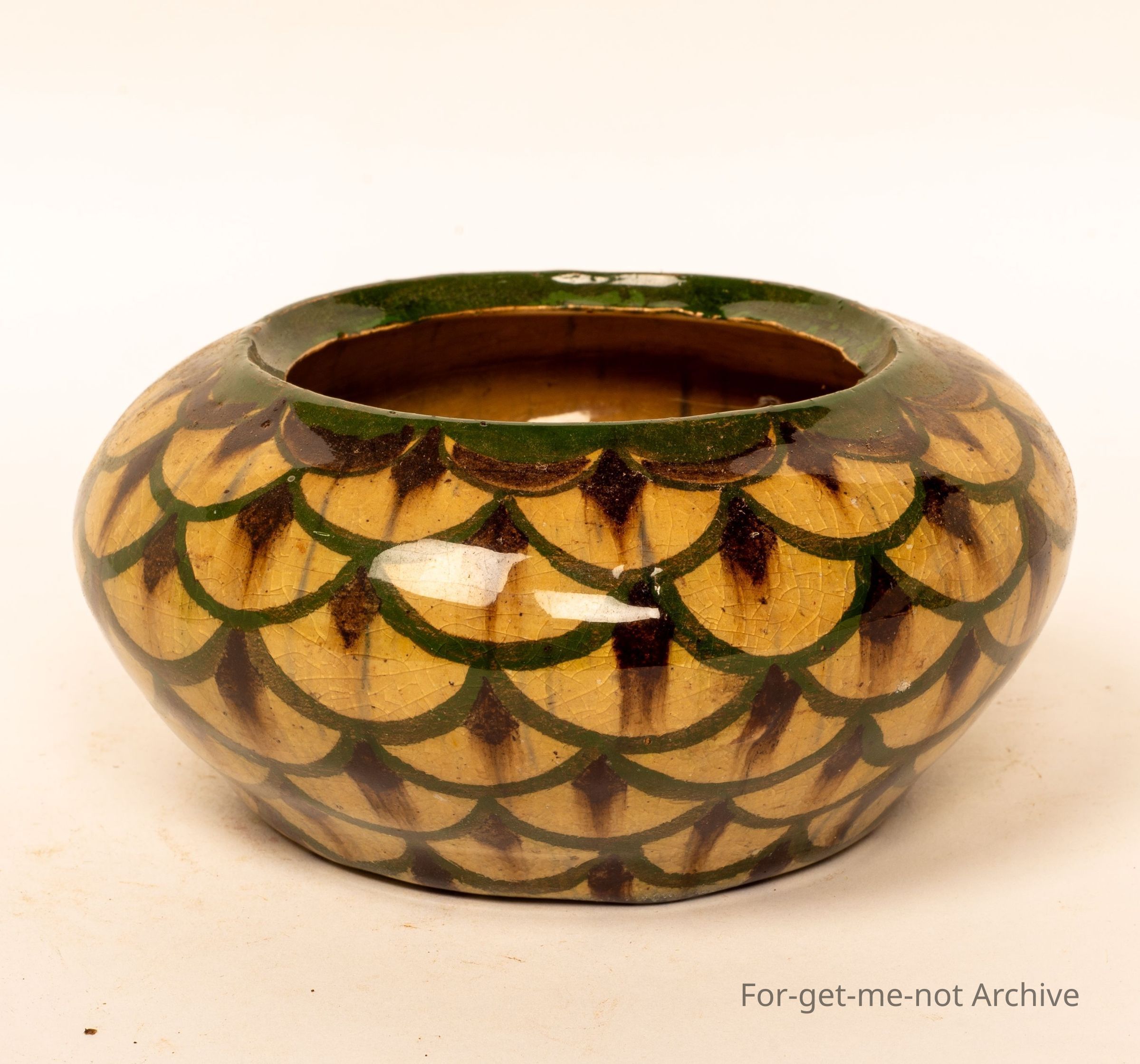This is a small, squat vase, beautifully decorated, glorious glaze. The decoration is like snake skin, in fact, all the way around. An unusual piece for Fowler's Pottery Sydney