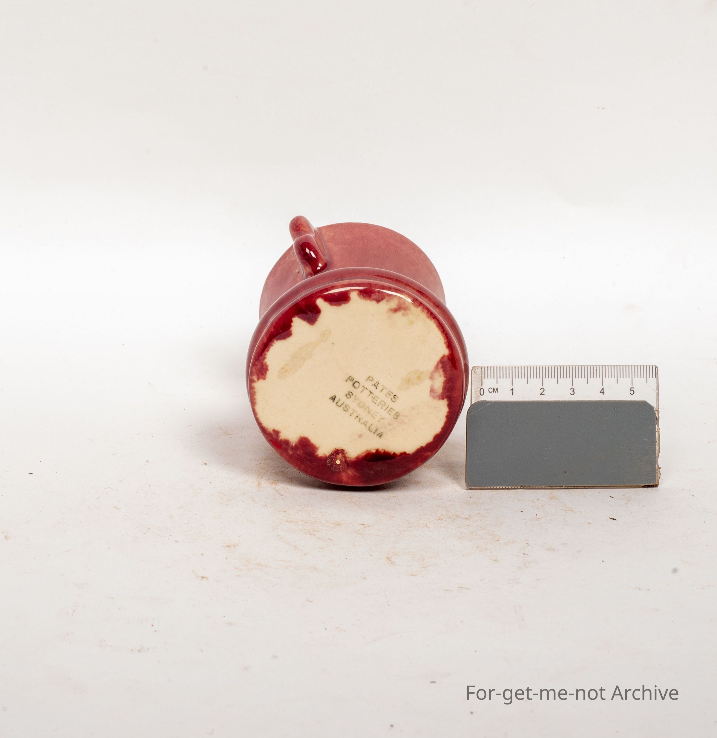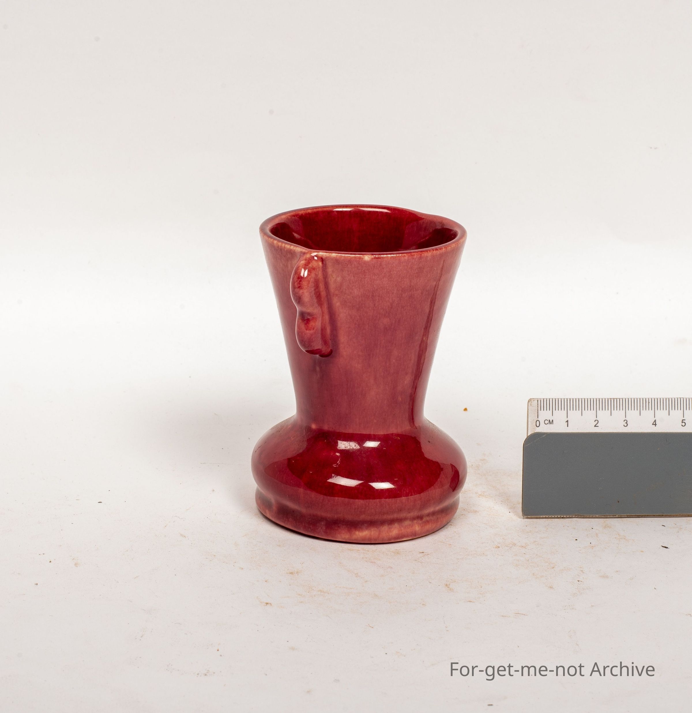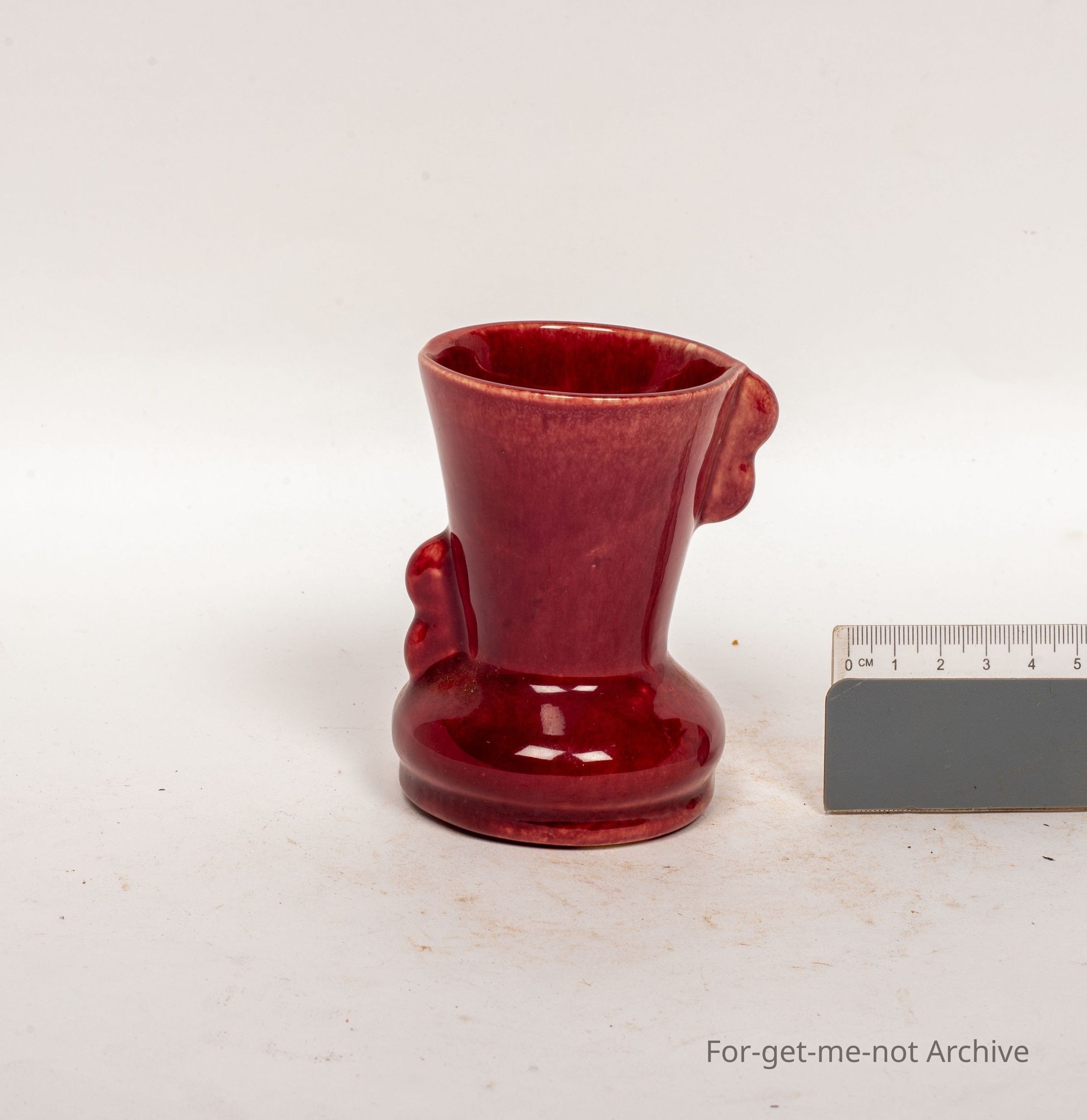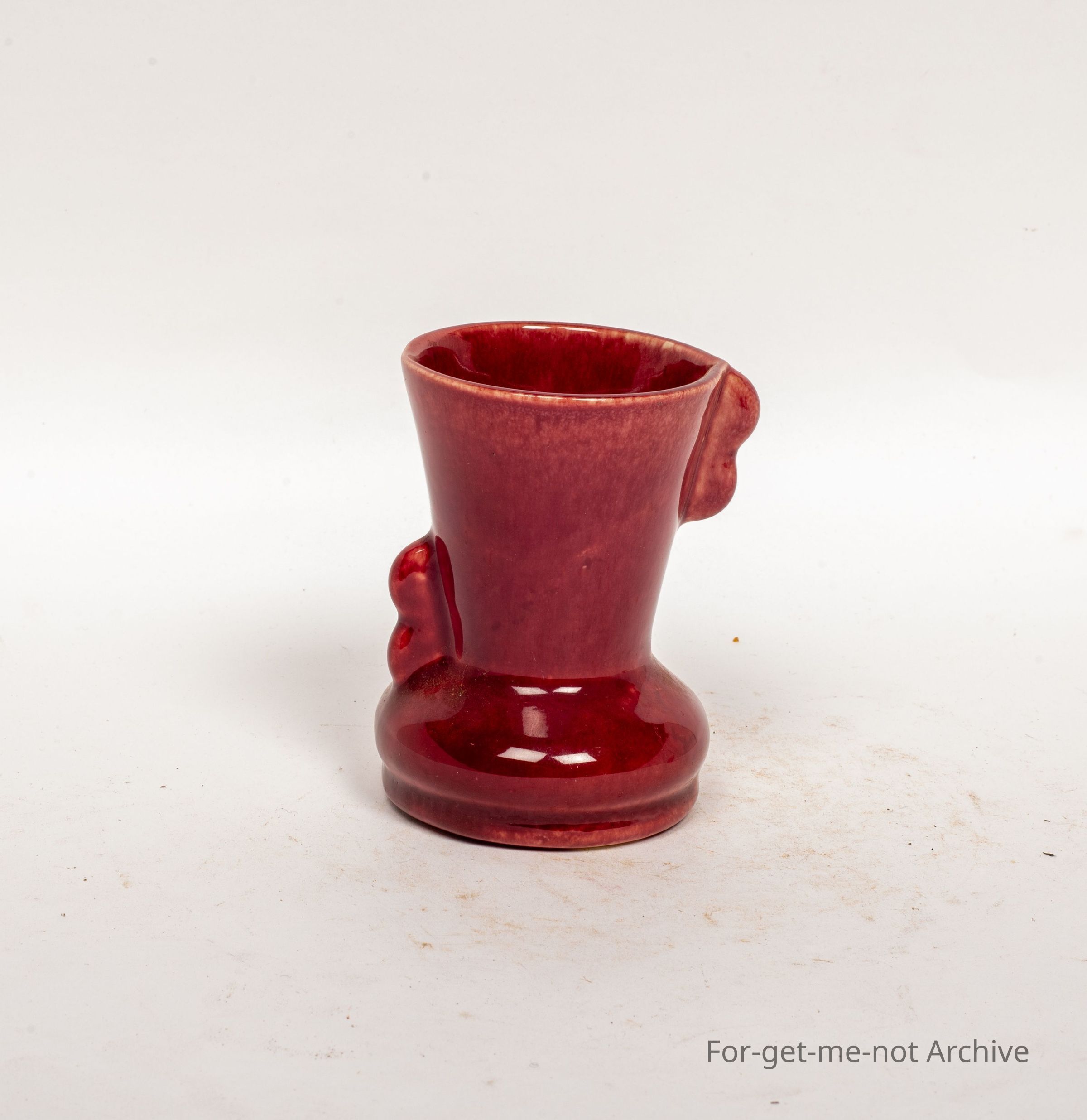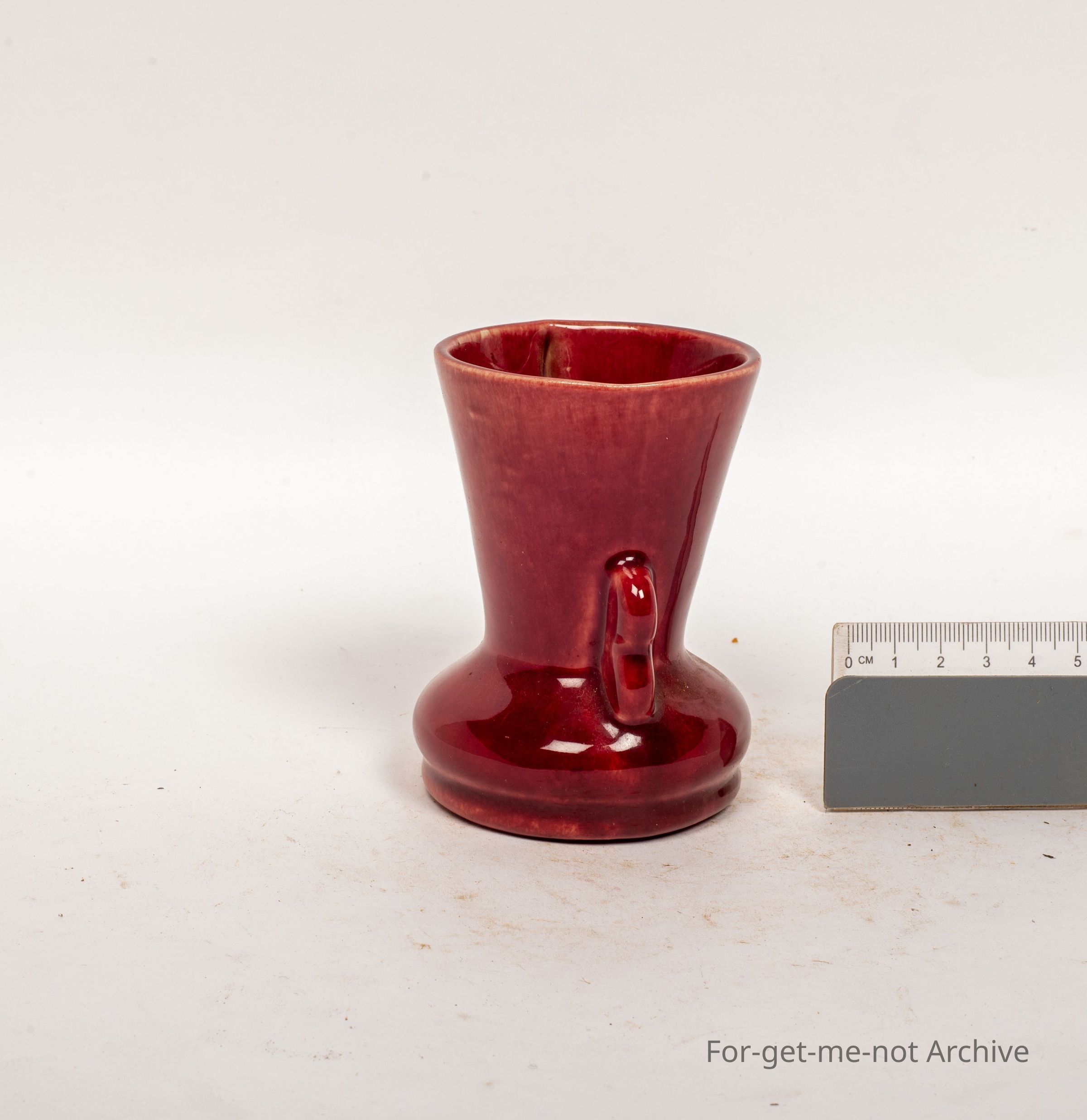 This is a small burgundy glazed vase offset handles, 1 high, 1 low, ink stamp on the base, Pate's Pottery Sydney, Australia