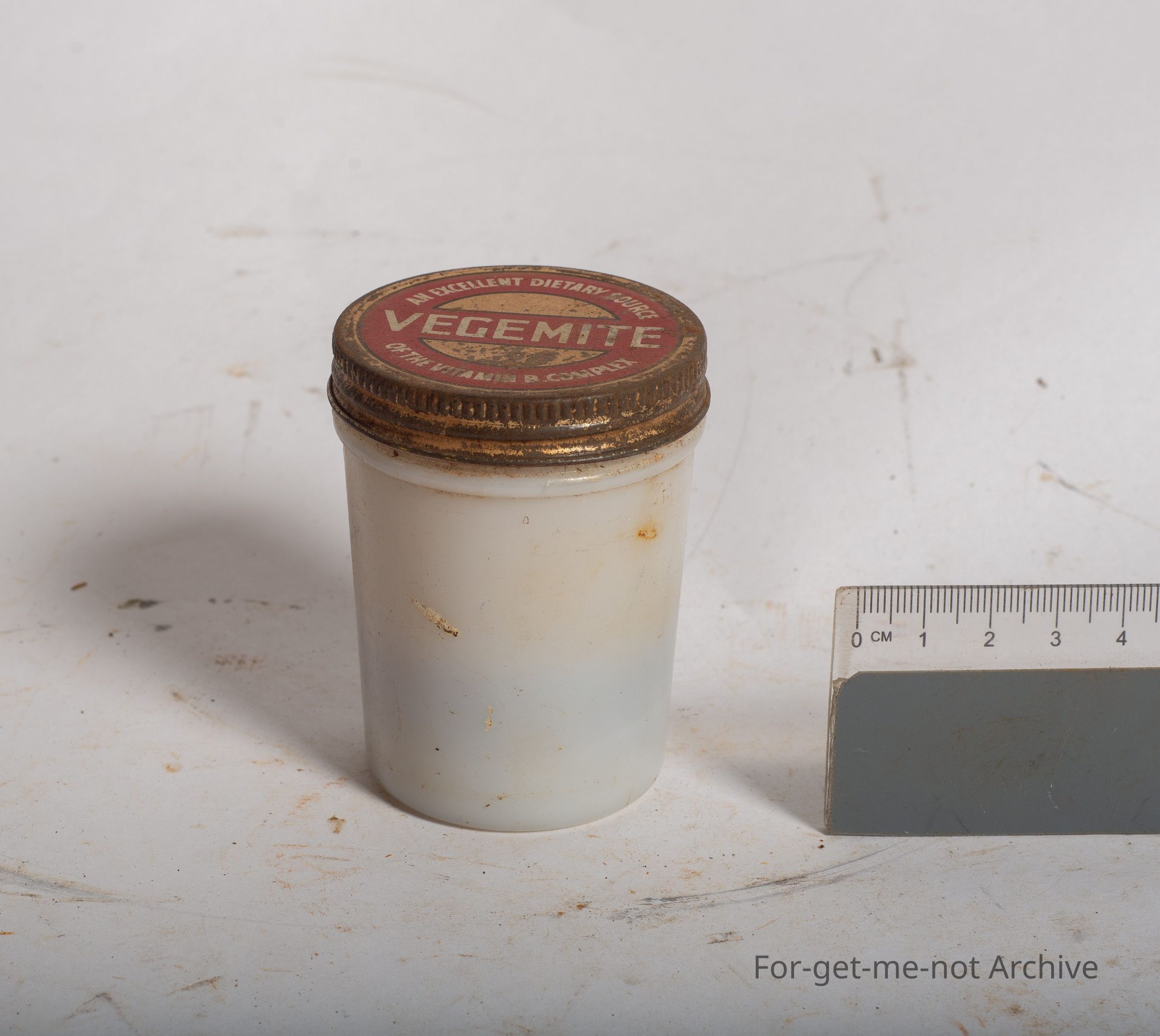 This is another milk glass jar. This time, an excellent dietary source. Vegemite, vitamin b complex, original lid, vegemite in the bottom of the milk glass jar, some content still in it.Collection
