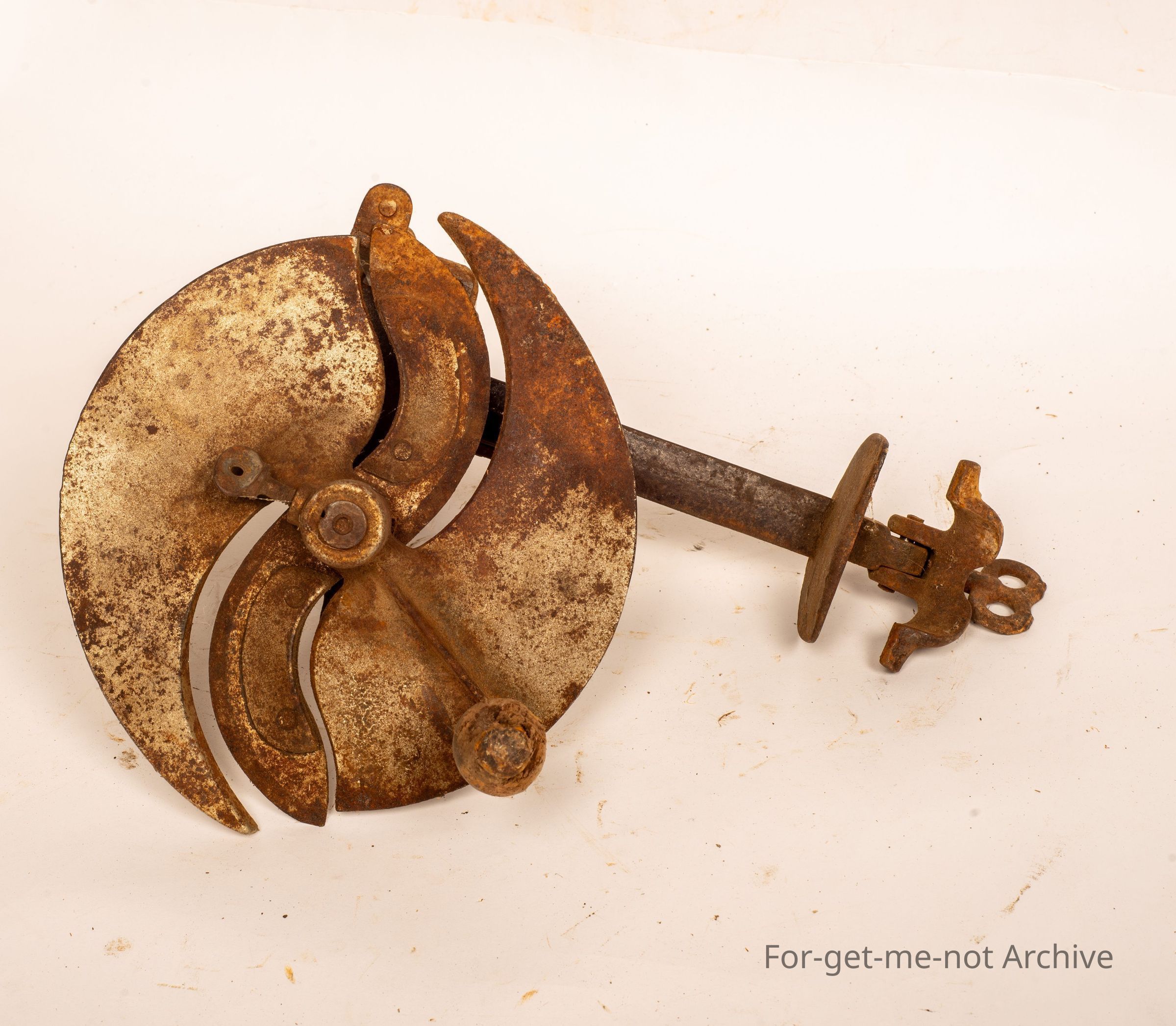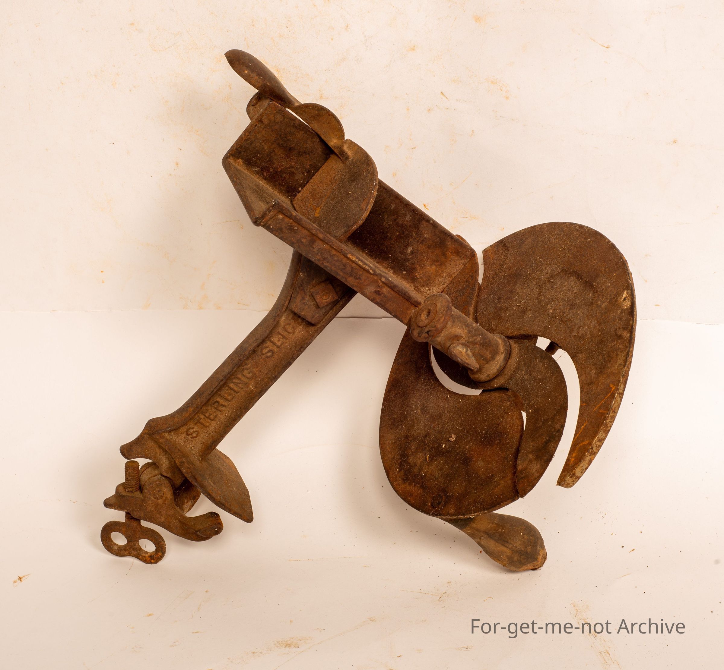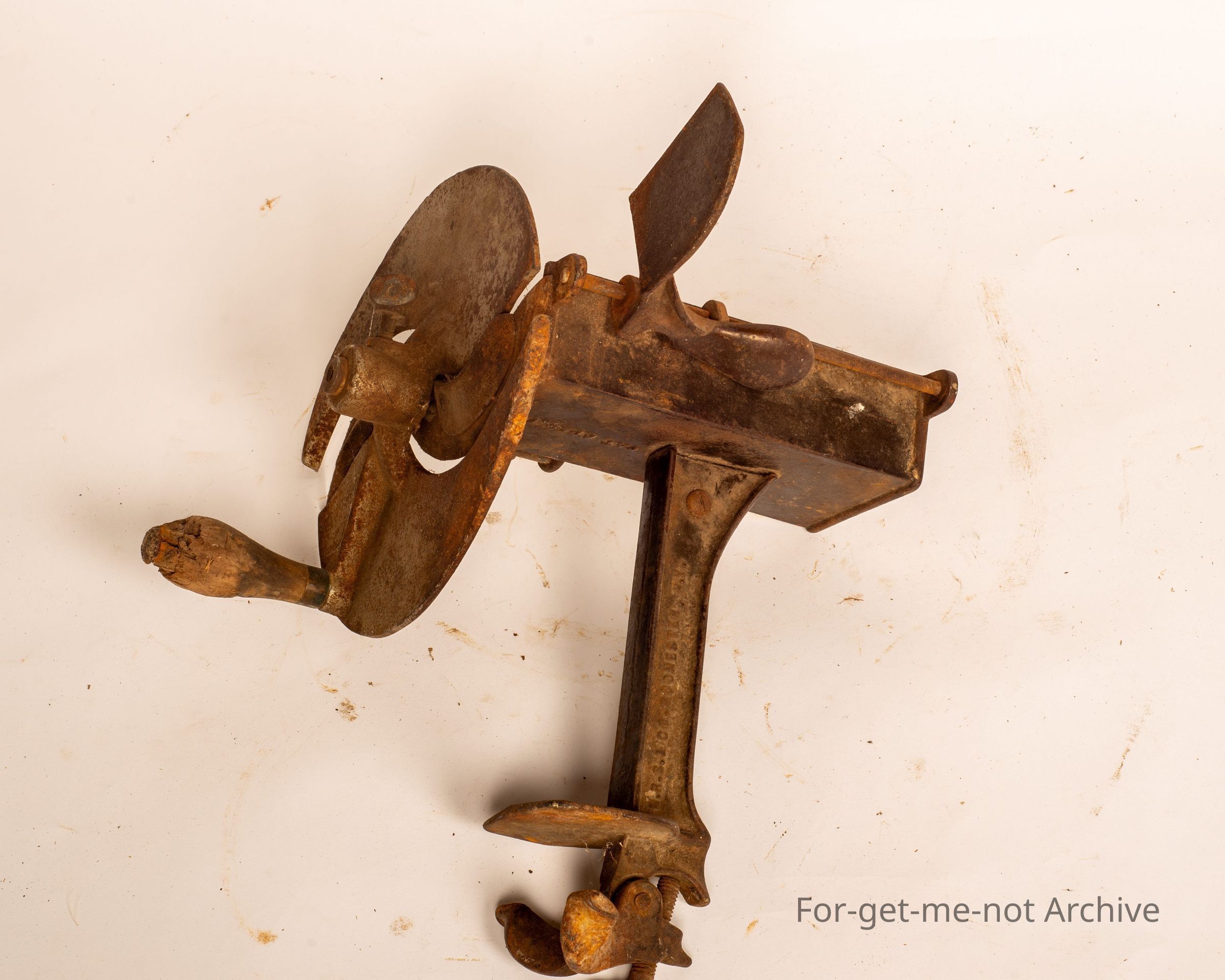 This is, an apparatus that clamps to a bench or a table. A large cutting wheel with a tray to push the item through with either sliced cheese, meat, or perhaps vegetables.