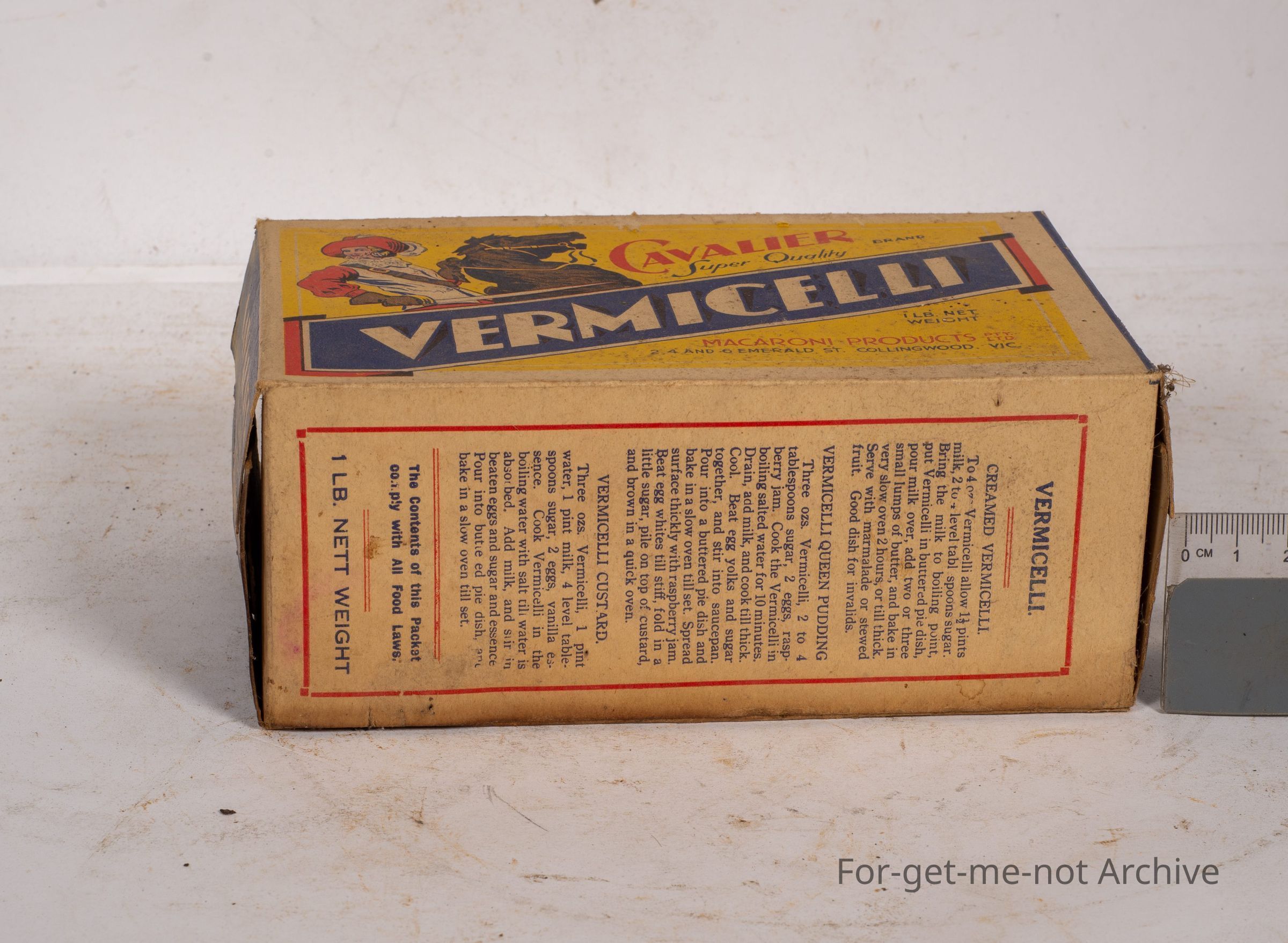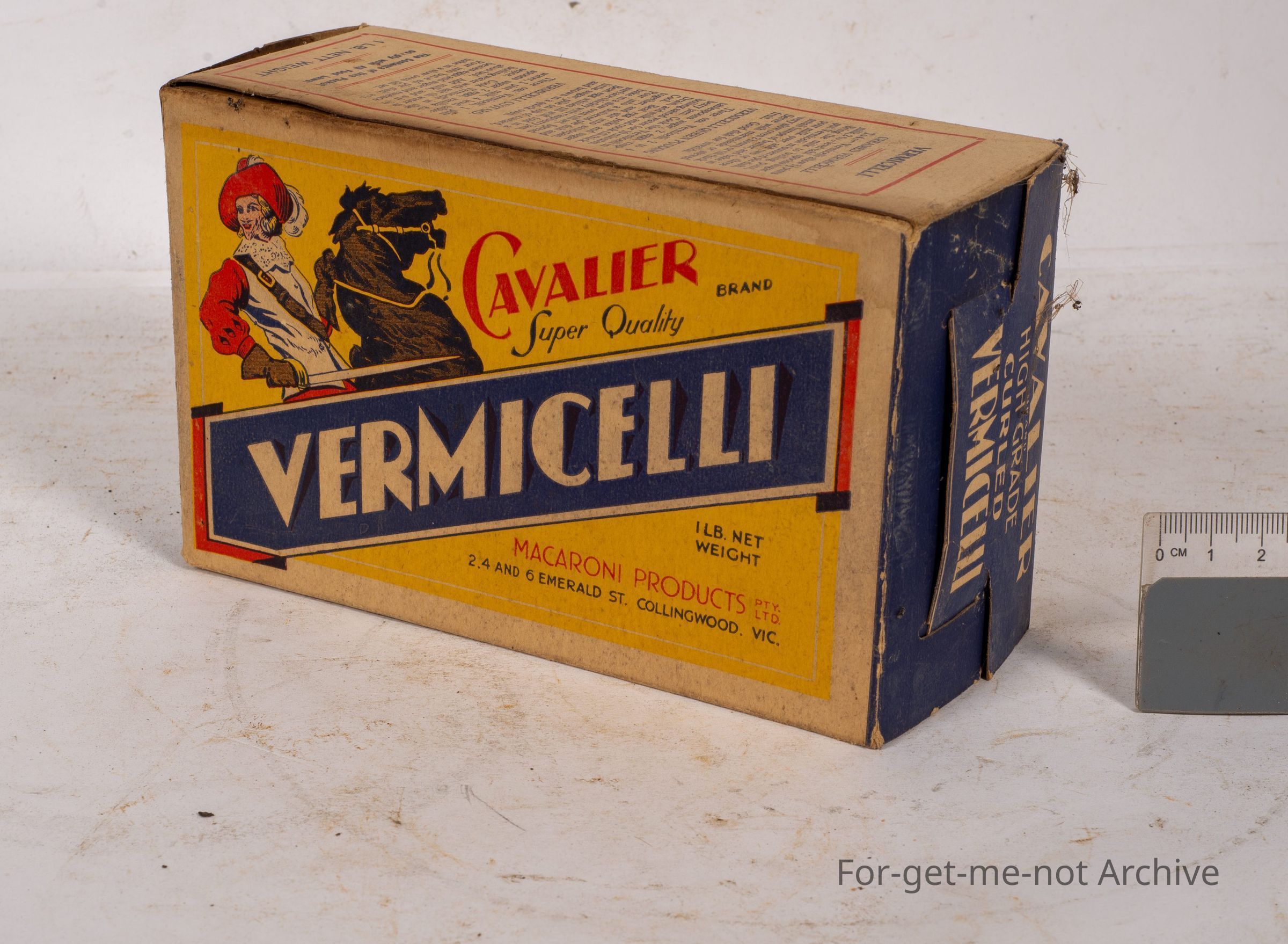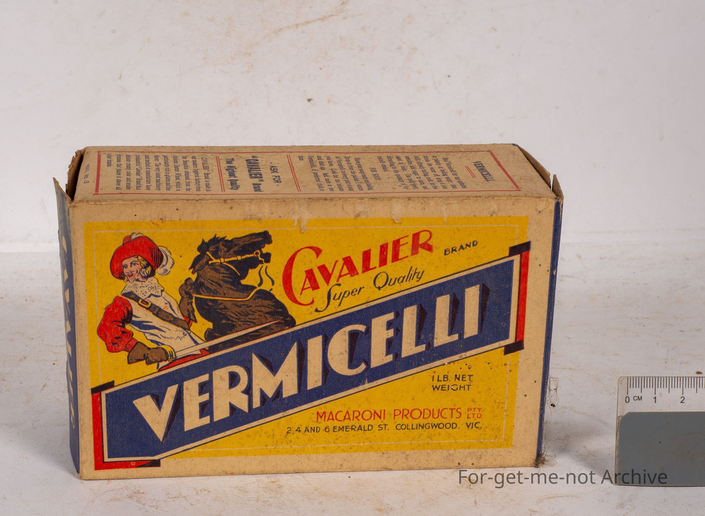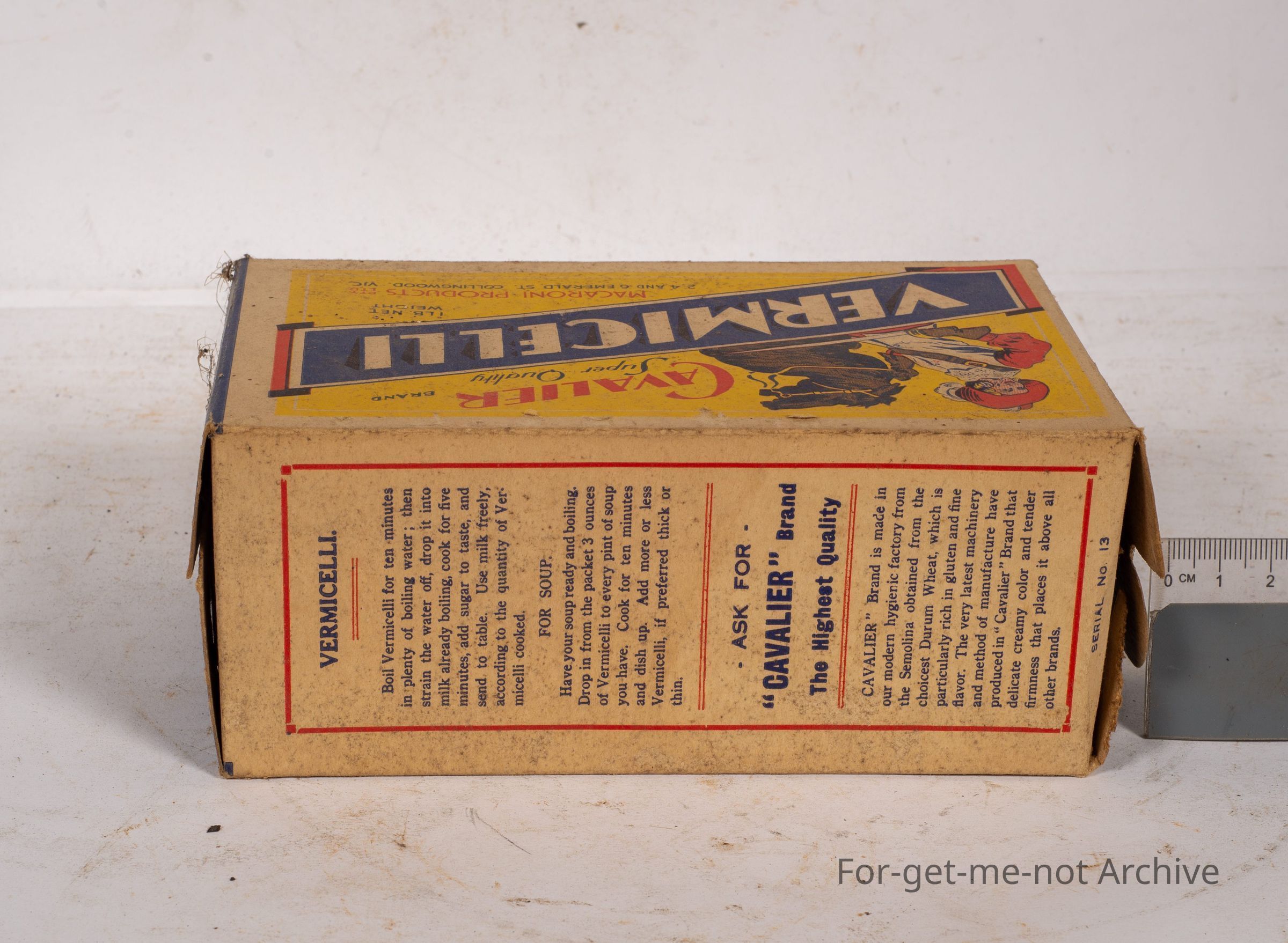 This is a packaging box for Cavalier Vermicelli. 1 pound net weight. This is from Macaroni Products, Emerald Street, Collingwood. This box, once again, is in excellent condition. Given to us many years ago by Nancy Stewart.Collection