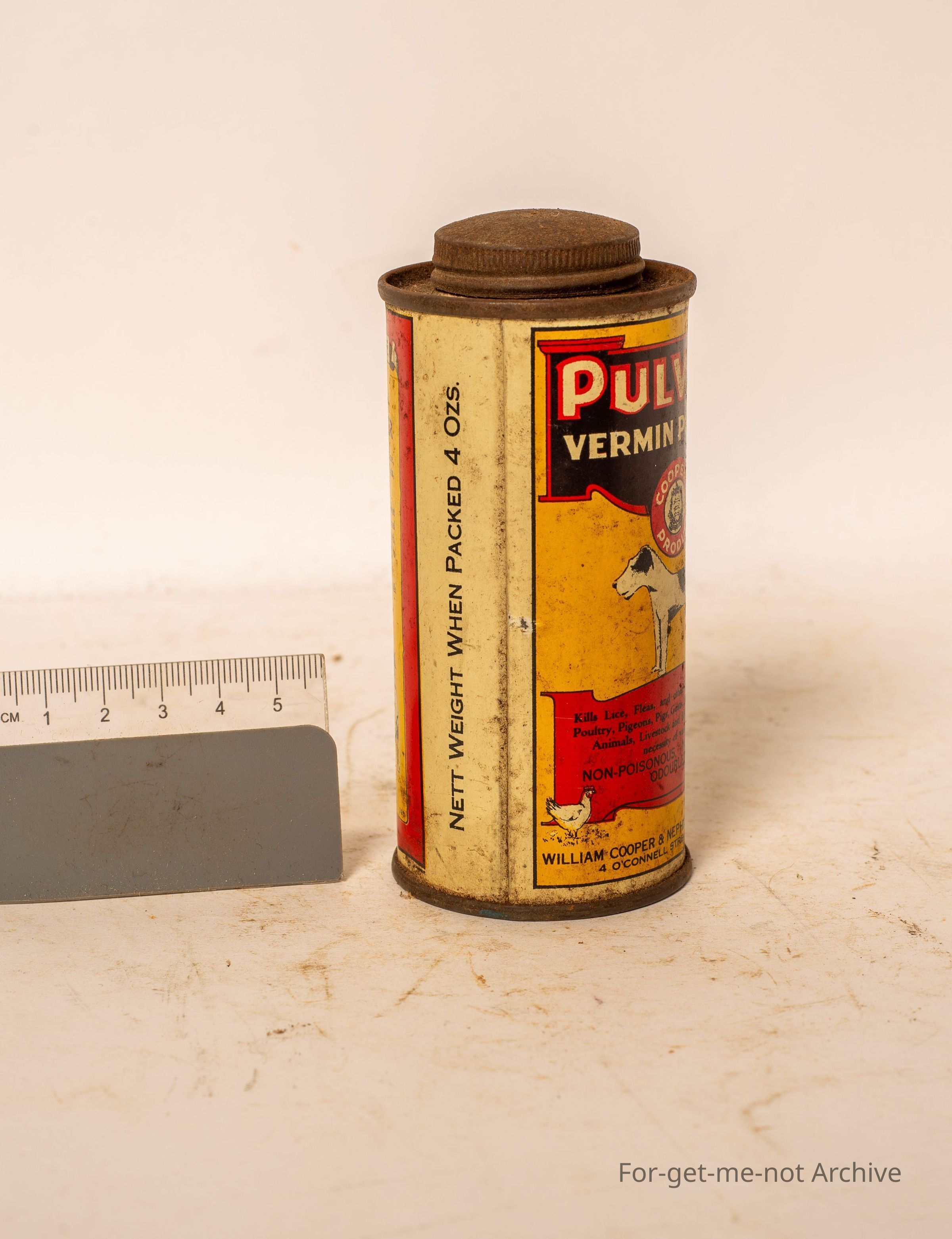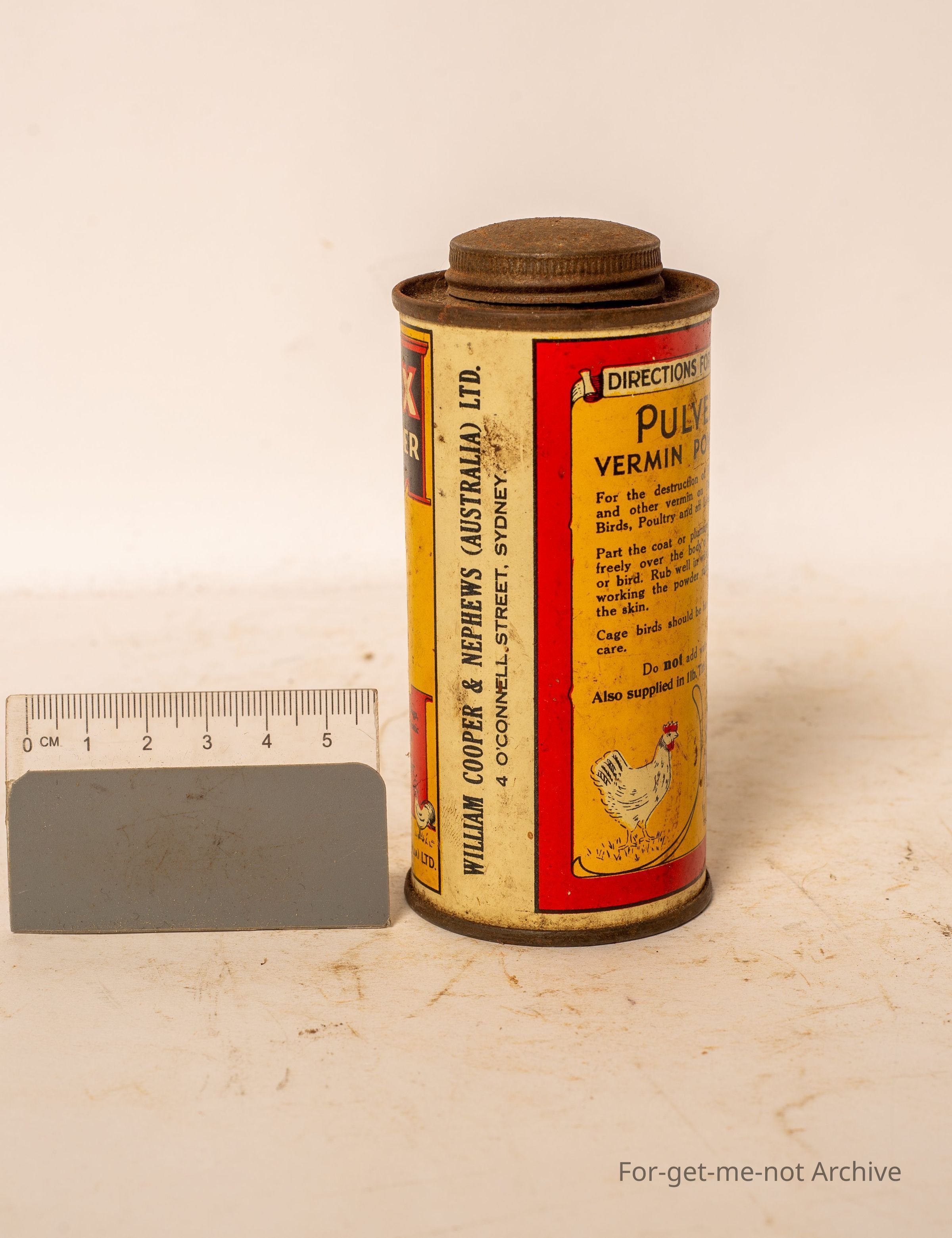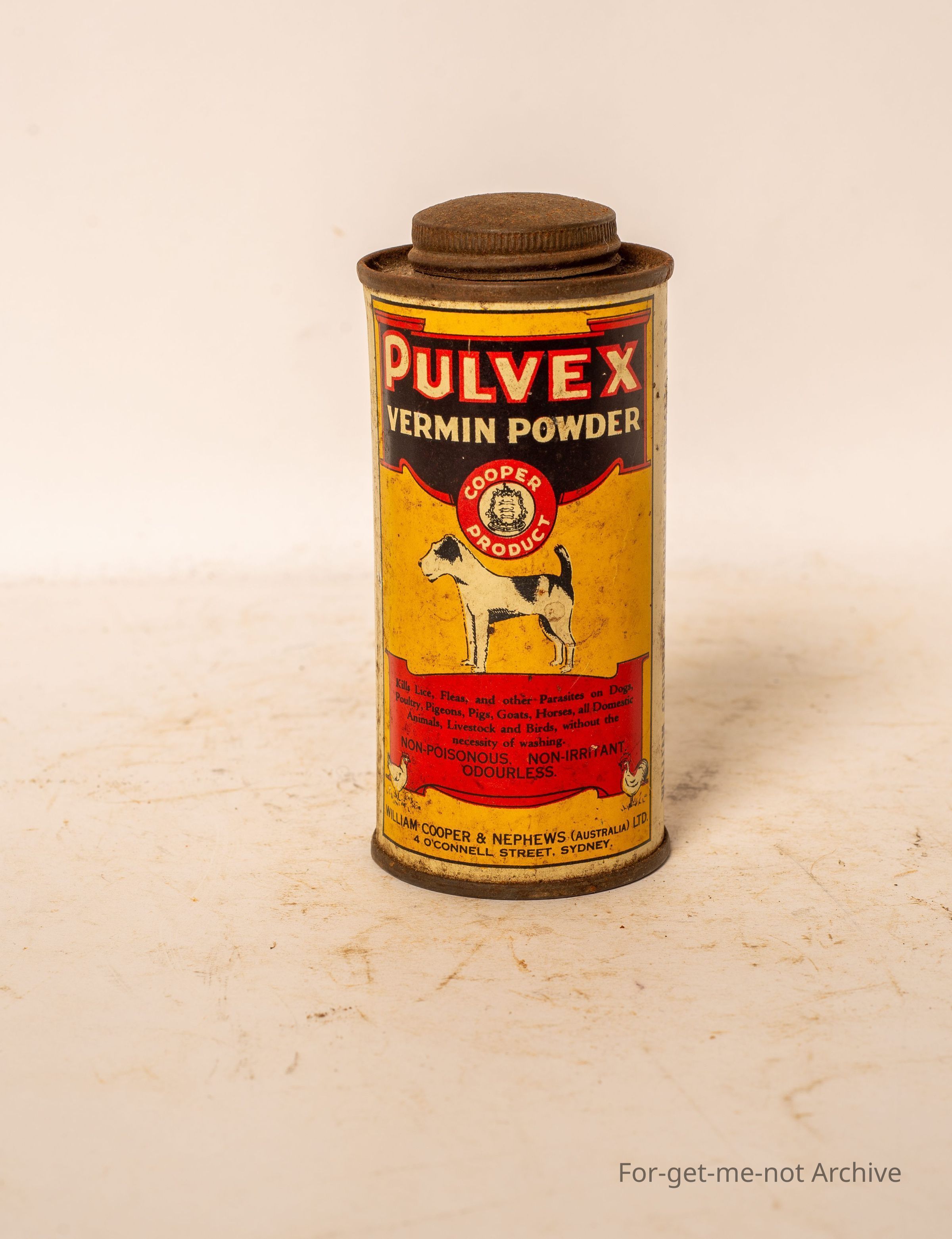 Is a tin of Purvex Vermin Powder for dogs made by the William Cooper and Nephews, Connell Street Sydney. In good nick, contents in box
