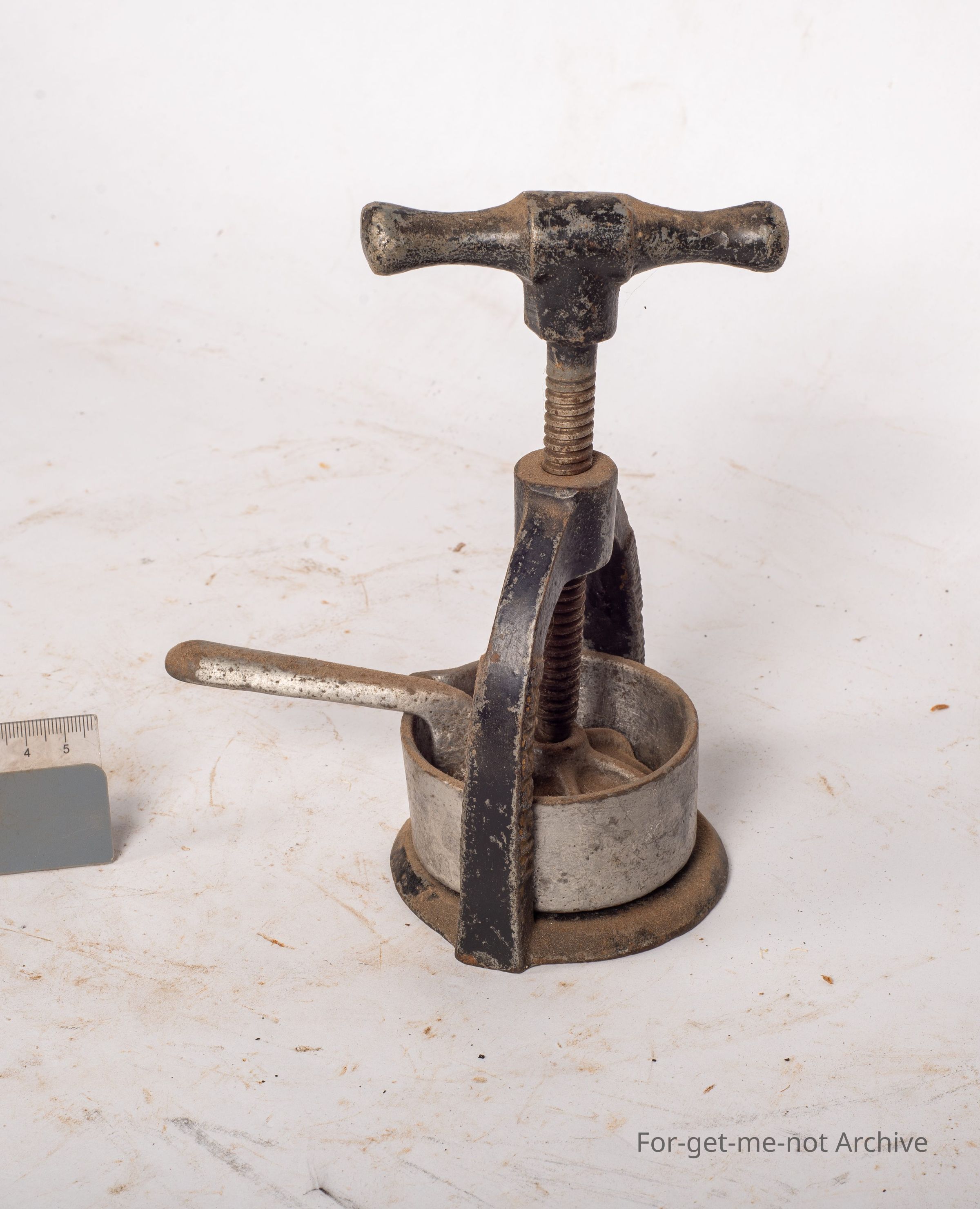 Vertical squeezer of oranges or lemons, perhaps. Little tin cup at the bottom to pour the juice from, has a screw type plunger at the top to force the juice out. Good working orderCollection