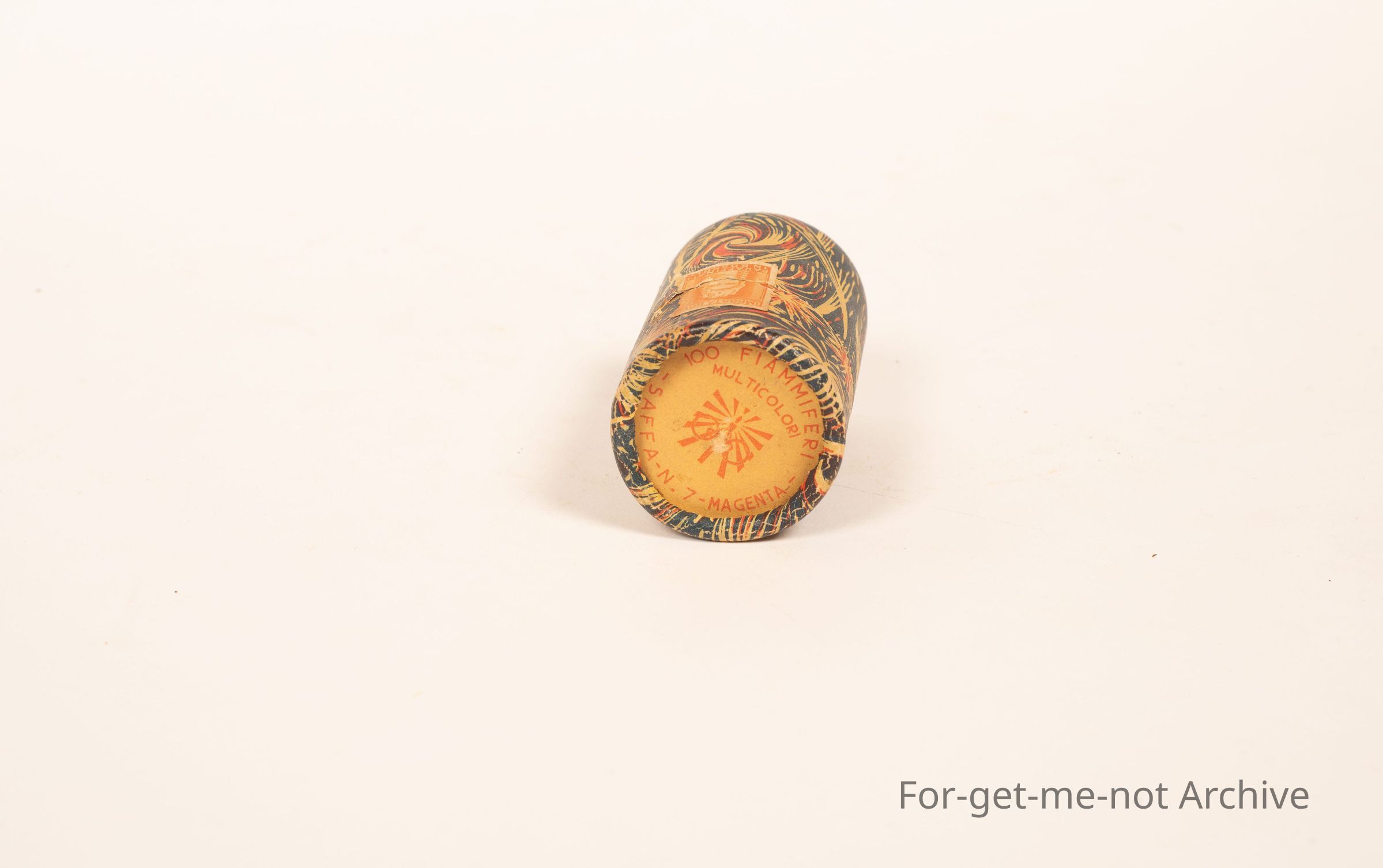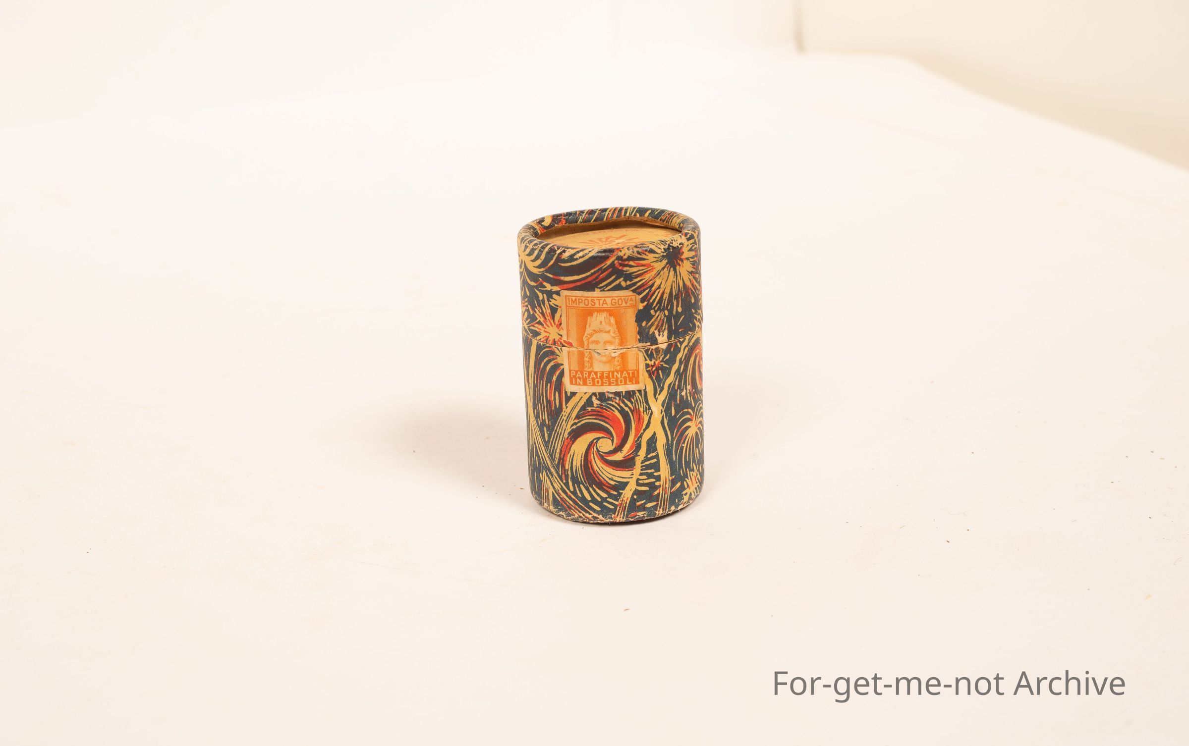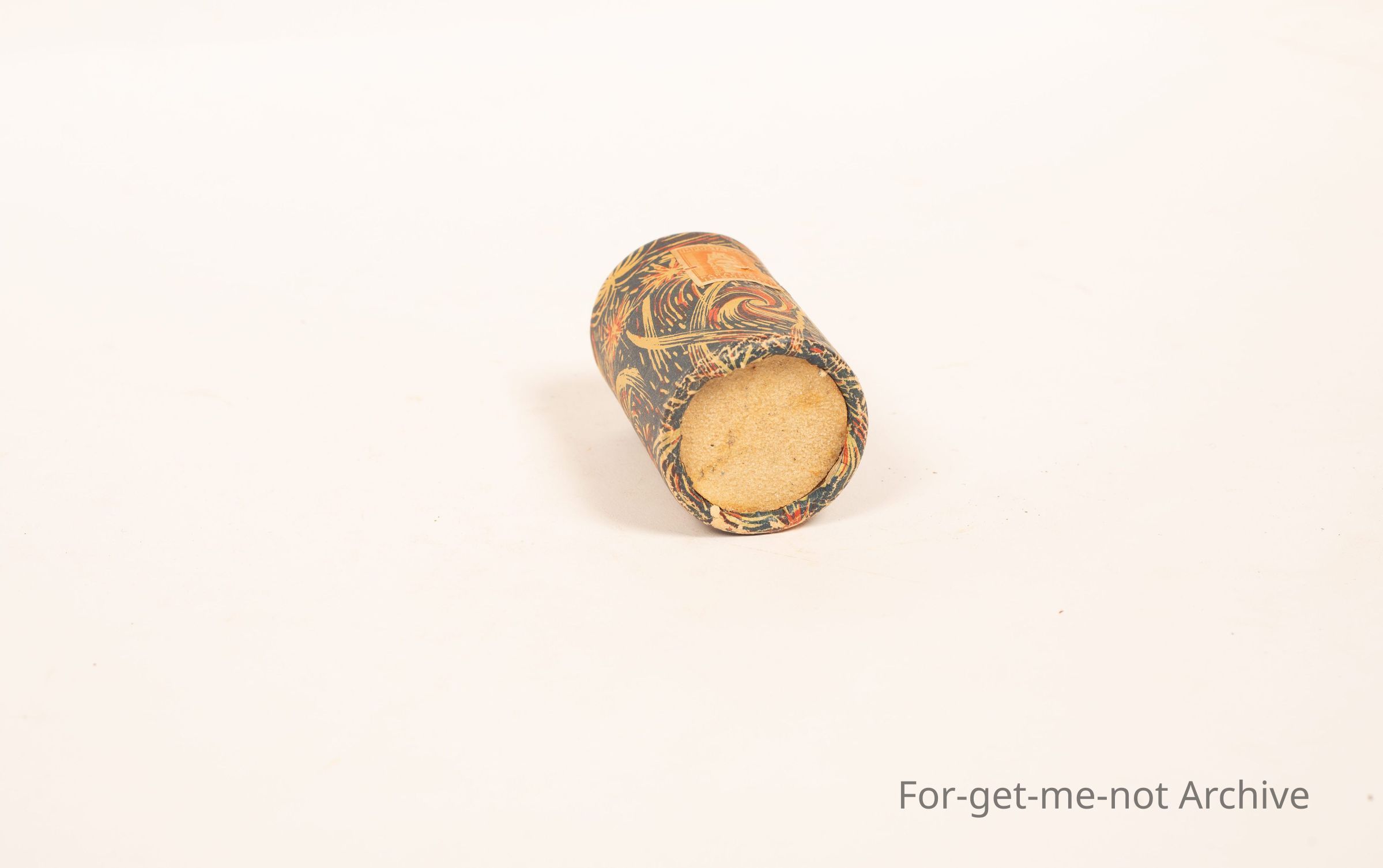 Is a Harlequin Vester case. Beautiful swirling figures with a stamp postage of a woman. Not certain what country, but a lovely piece, striker on the base.