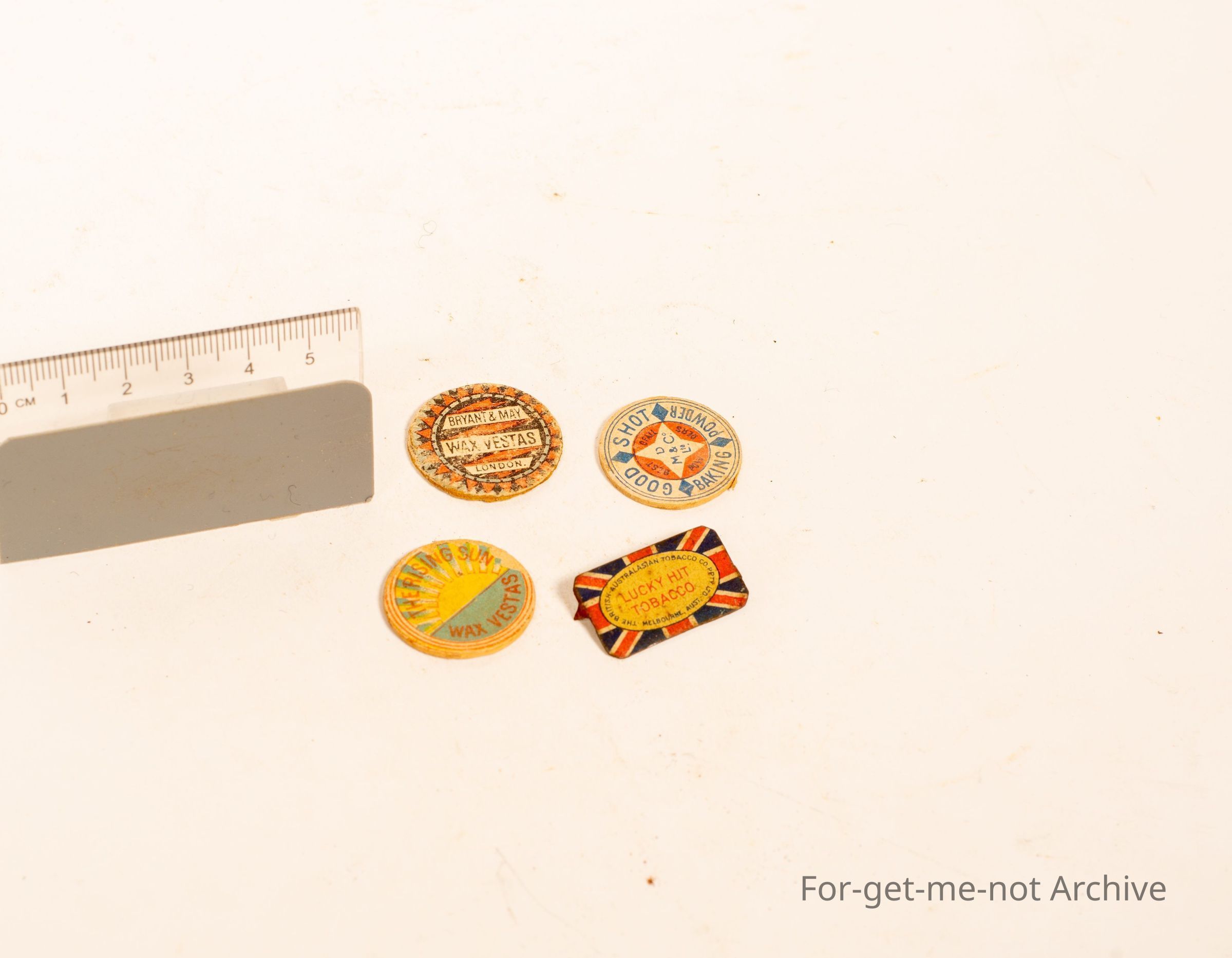 A group of Vesta holder, cardboard plugs from the top advertising. Bryant and May, Good shot baking powder, and The rising sun - wax restors plus Lucky Hit Tobacco. Little GroupCollection