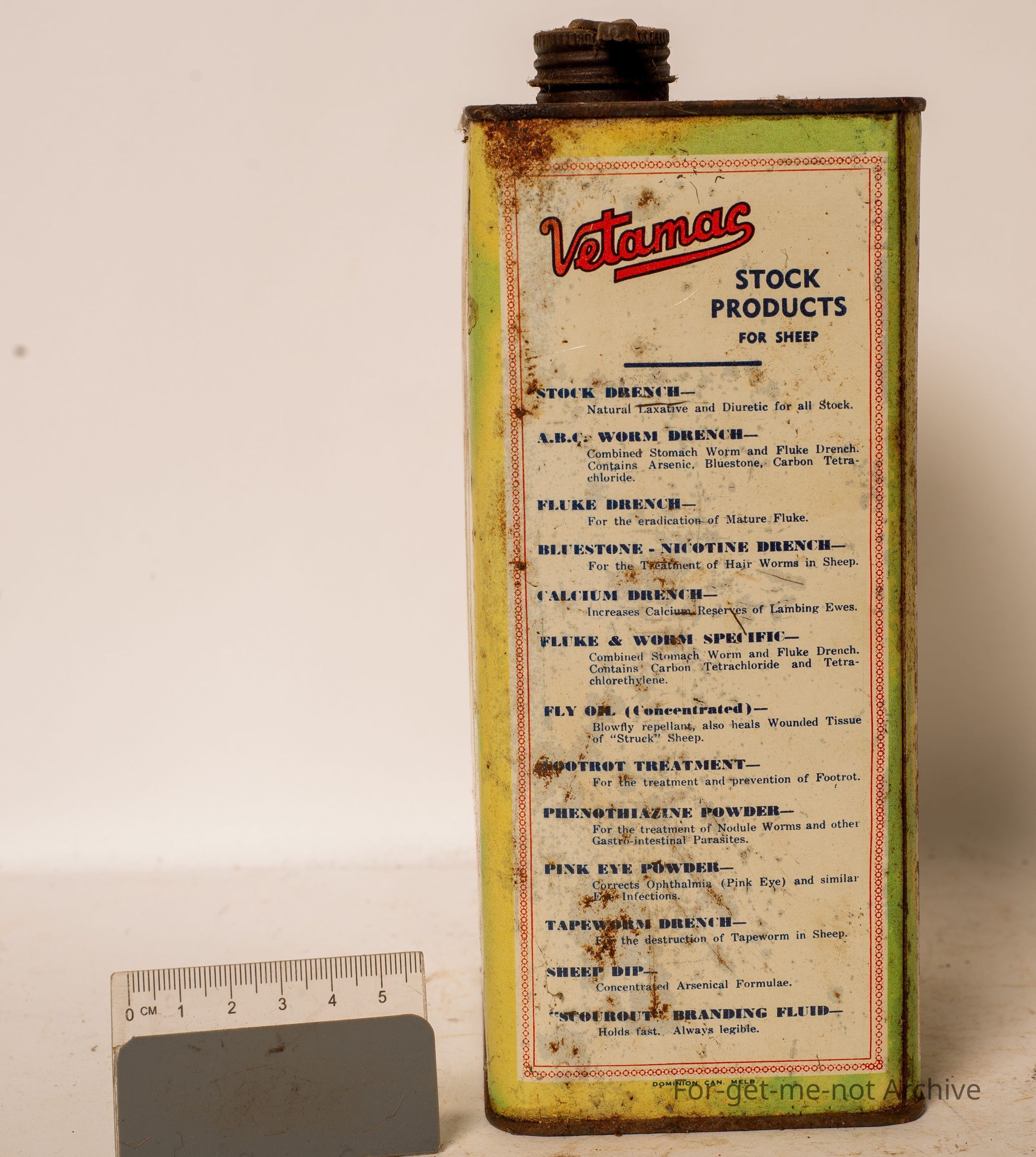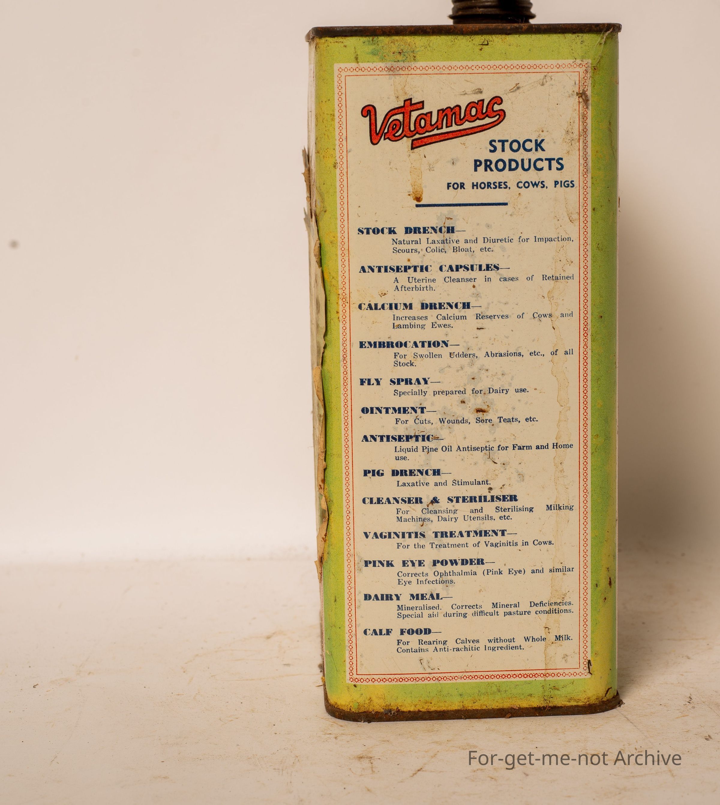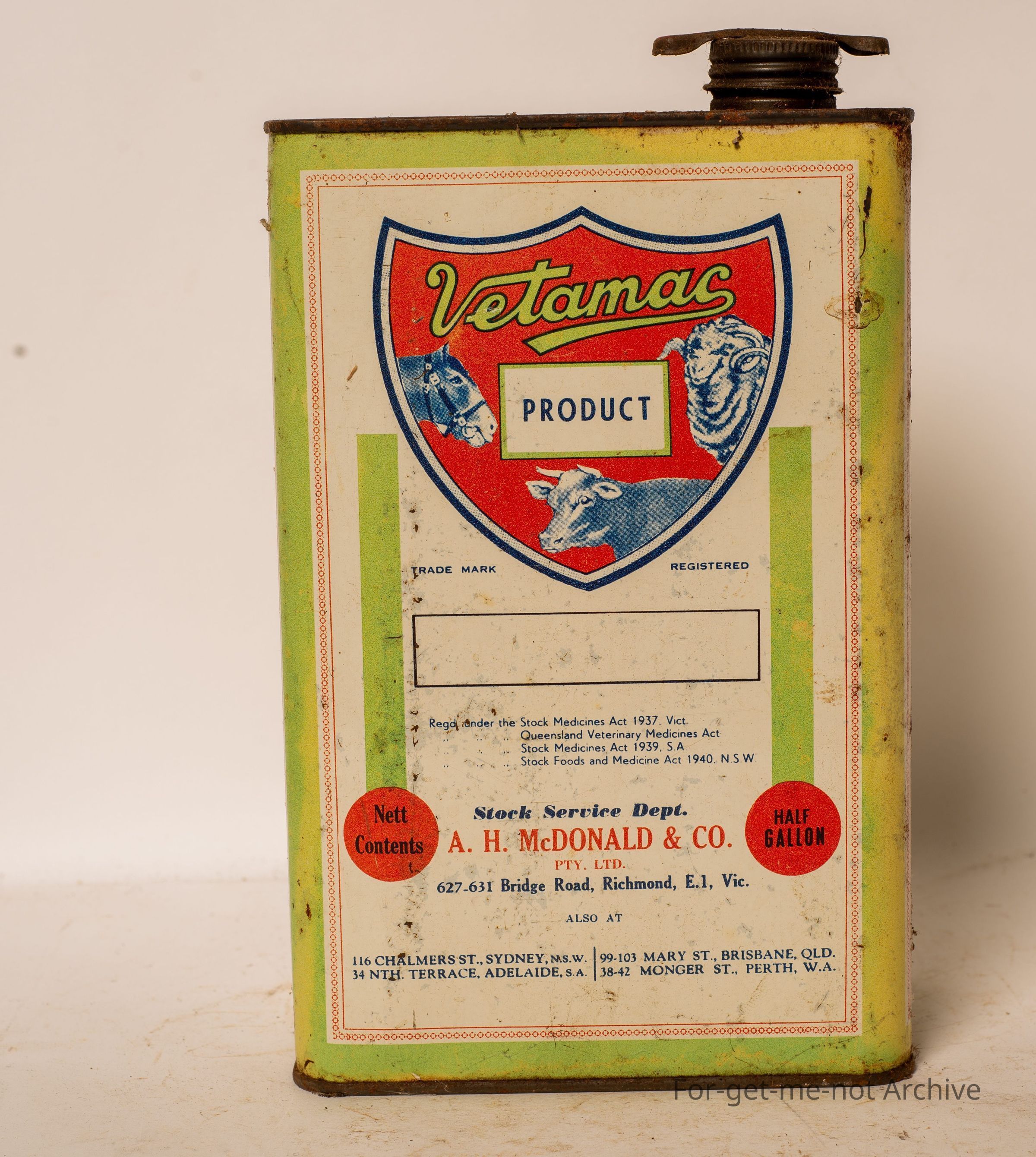 Vetamac, by AH McDonald, Bridge Road, Richmond, half gallon tin, for drenching sheep, for pretty well all the ailments of sheep, in reasonably good condition.