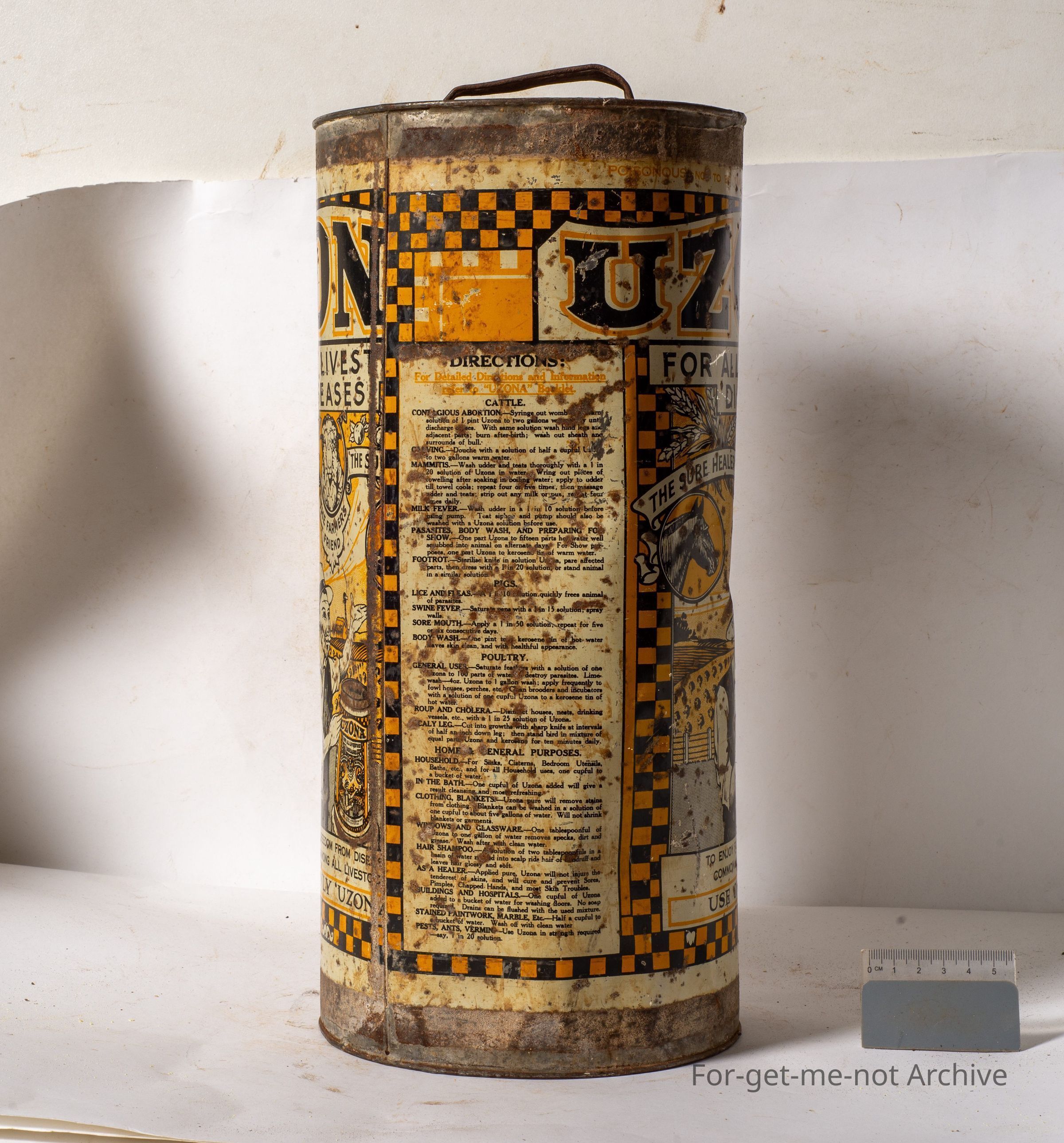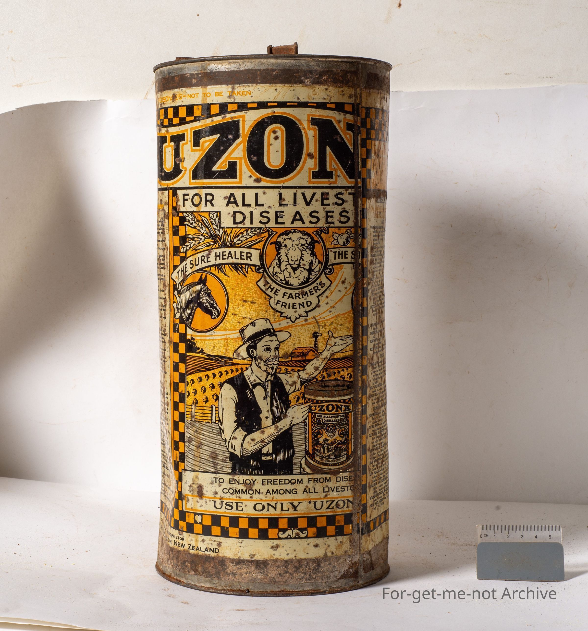 This is a tall, cylindrical tin labelled Uzona for all livestock diseases. The sure healer, graphics of a horse, a sheep, a farmer. This tin is quite a hard tin to find. I bought this in New Zealand. Very hard to find out here. This stuff cures everthing imaginable for stock and garden . truly amazing stuffCollection