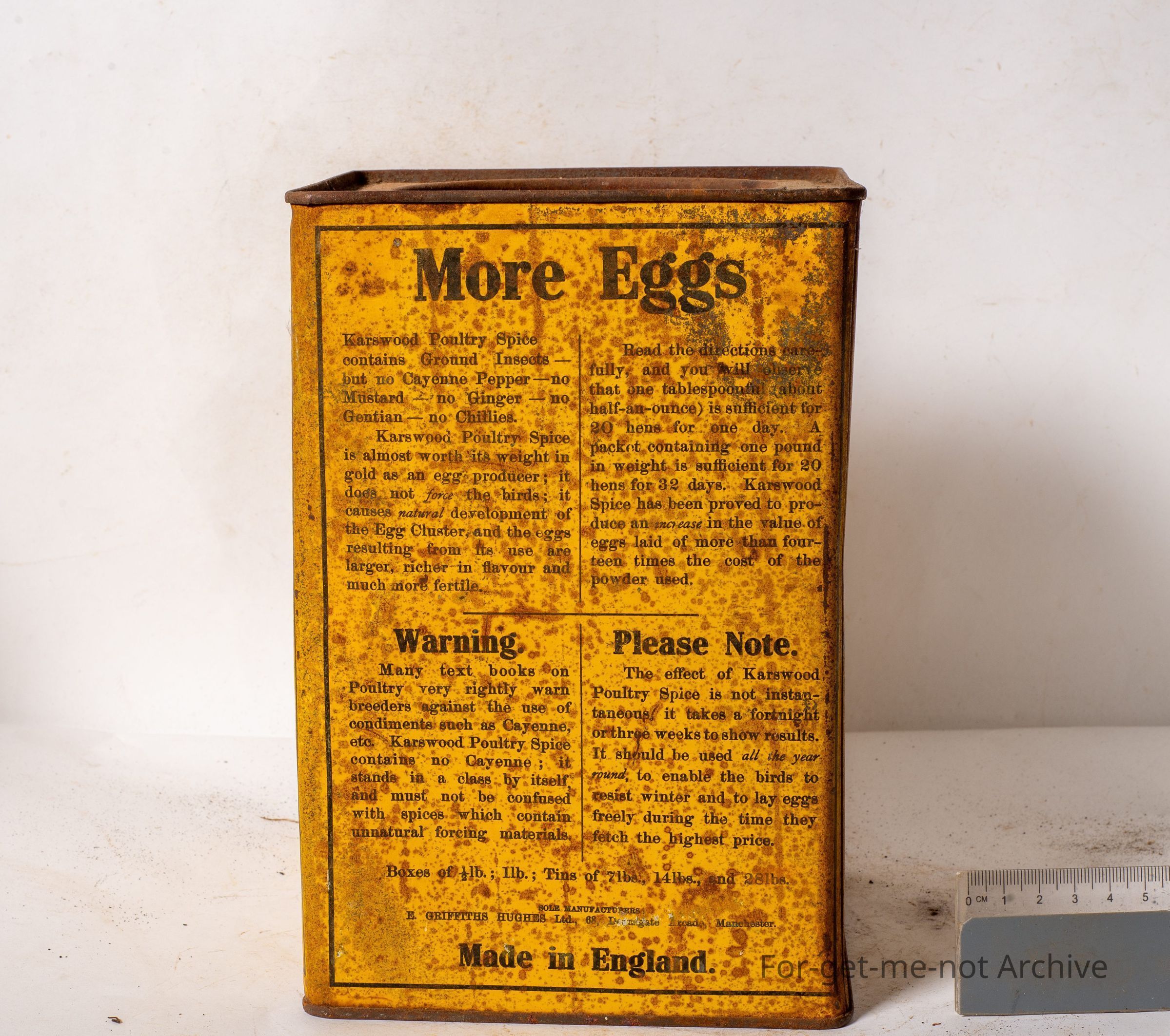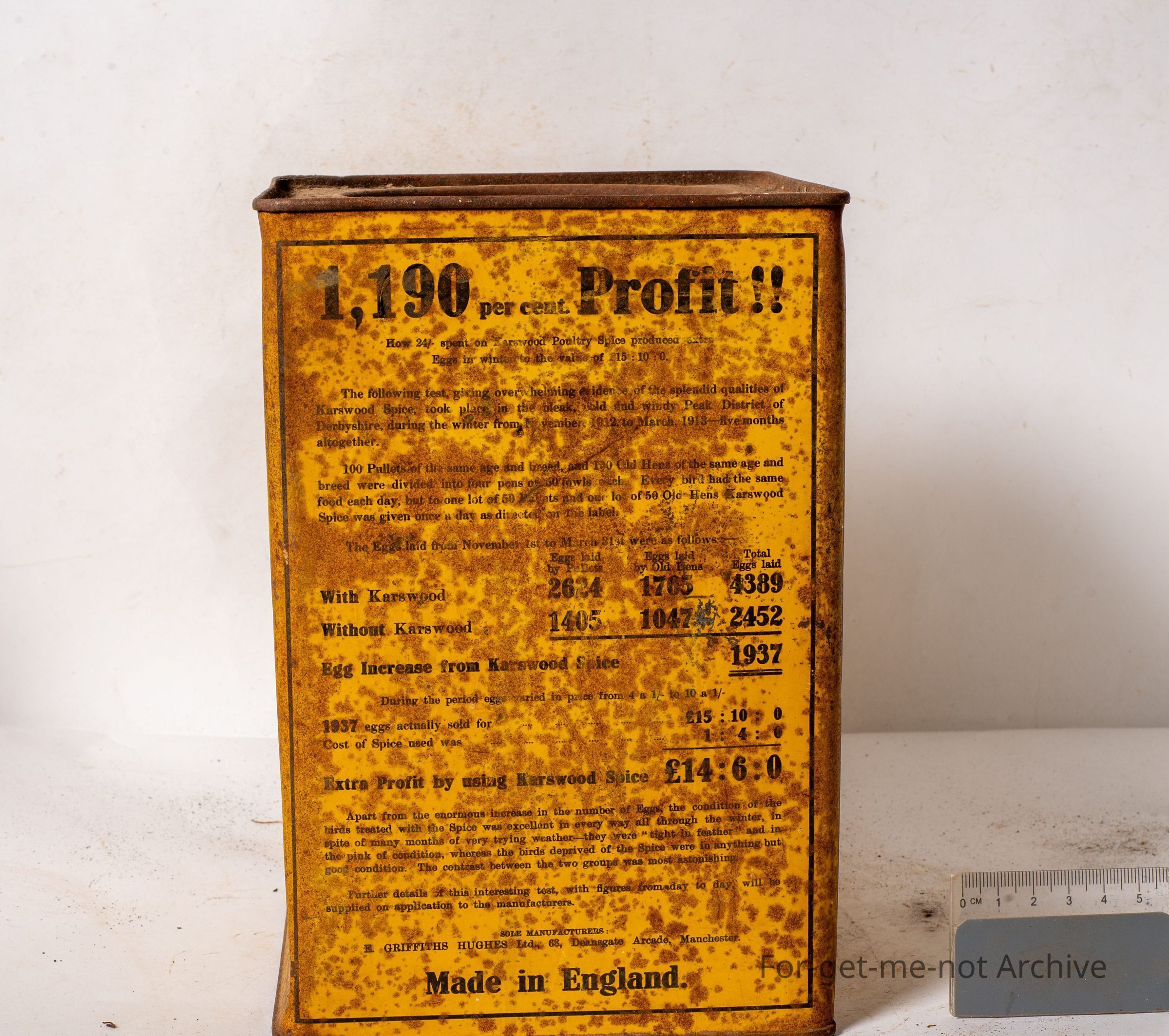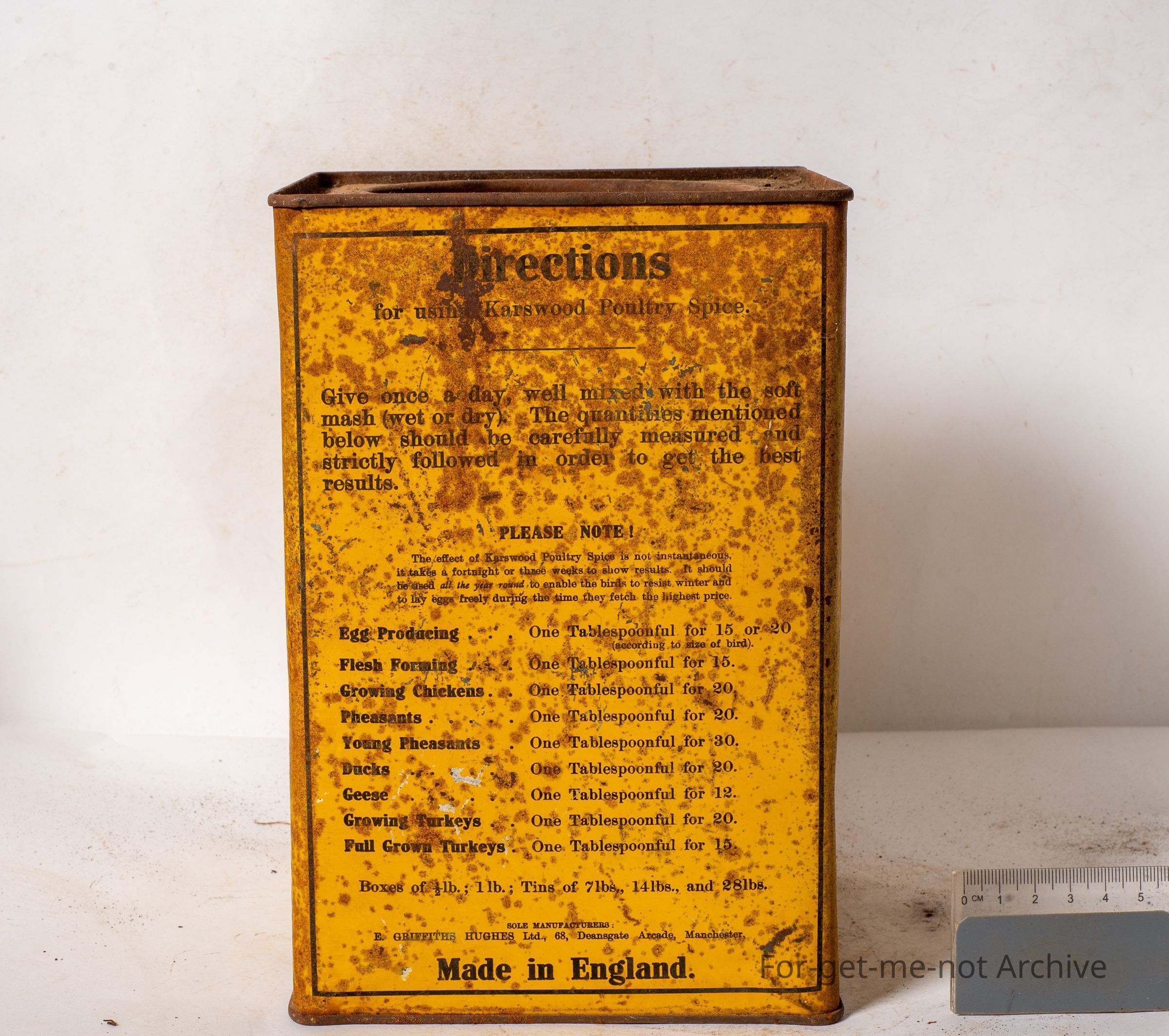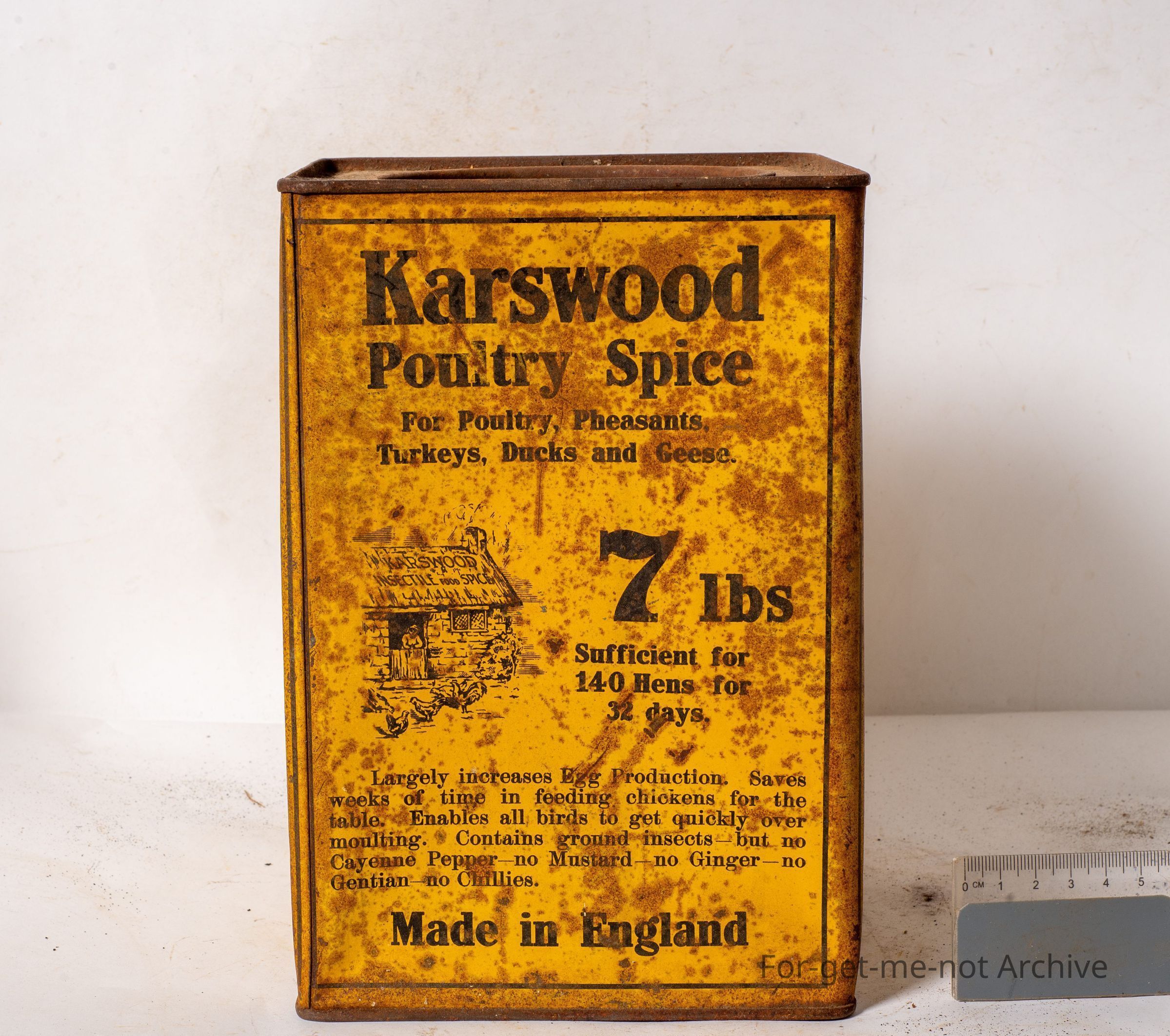 This is a tin of Karswood, poultry, spice for poultry, pheasants, turkeys, ducks, etc. 7 lb content. Made in England. Pretty unusual tin, not in bad nick.