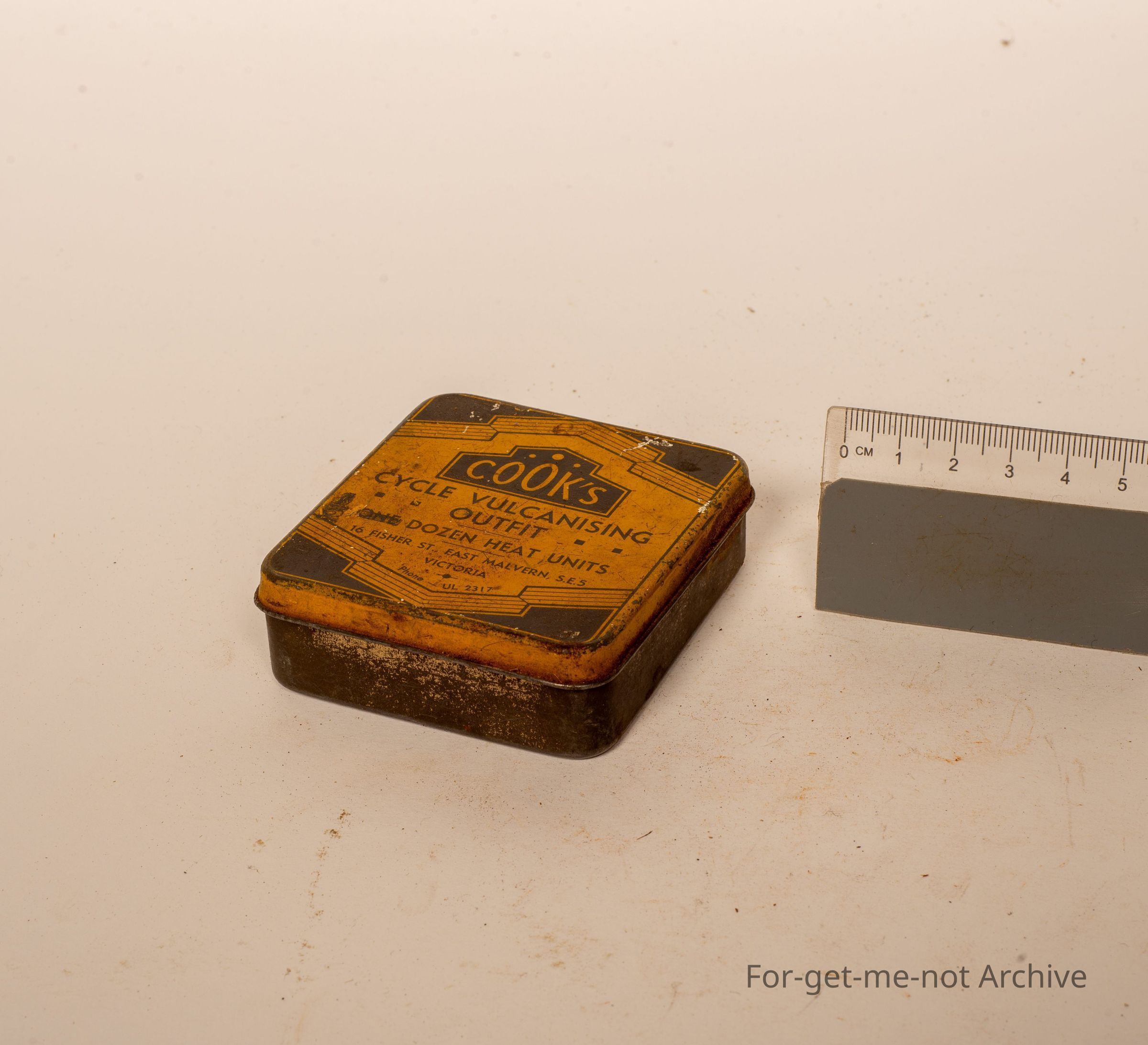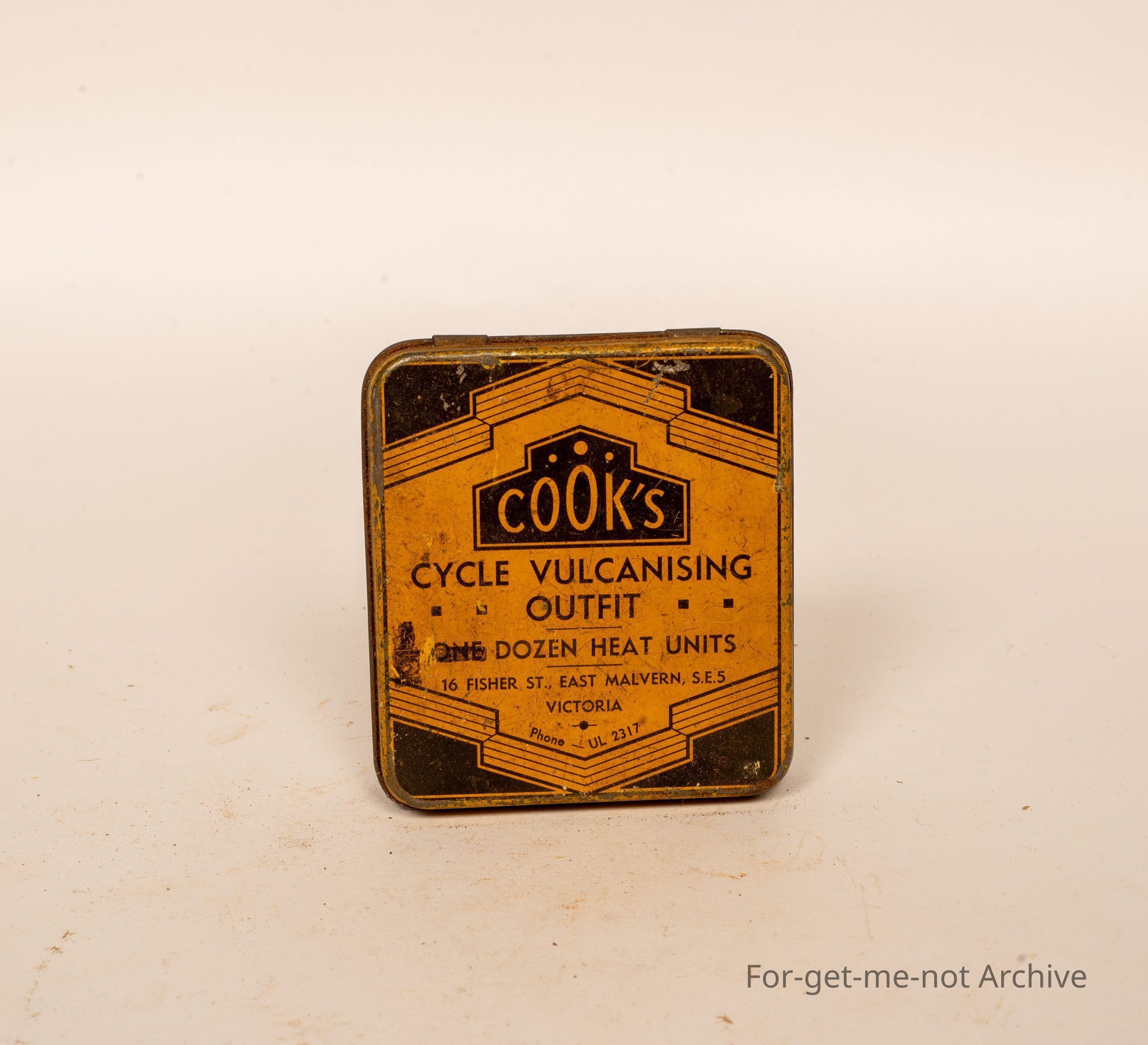 Another tin for Cycle Vulcanizing Repair Outfit for Push Bikes. Cook's Cycle Volcanizing Outfit, Fisher Street, East Malvern, Victoria. An early tin in reasonable condition. Not an easy one to find.Collection