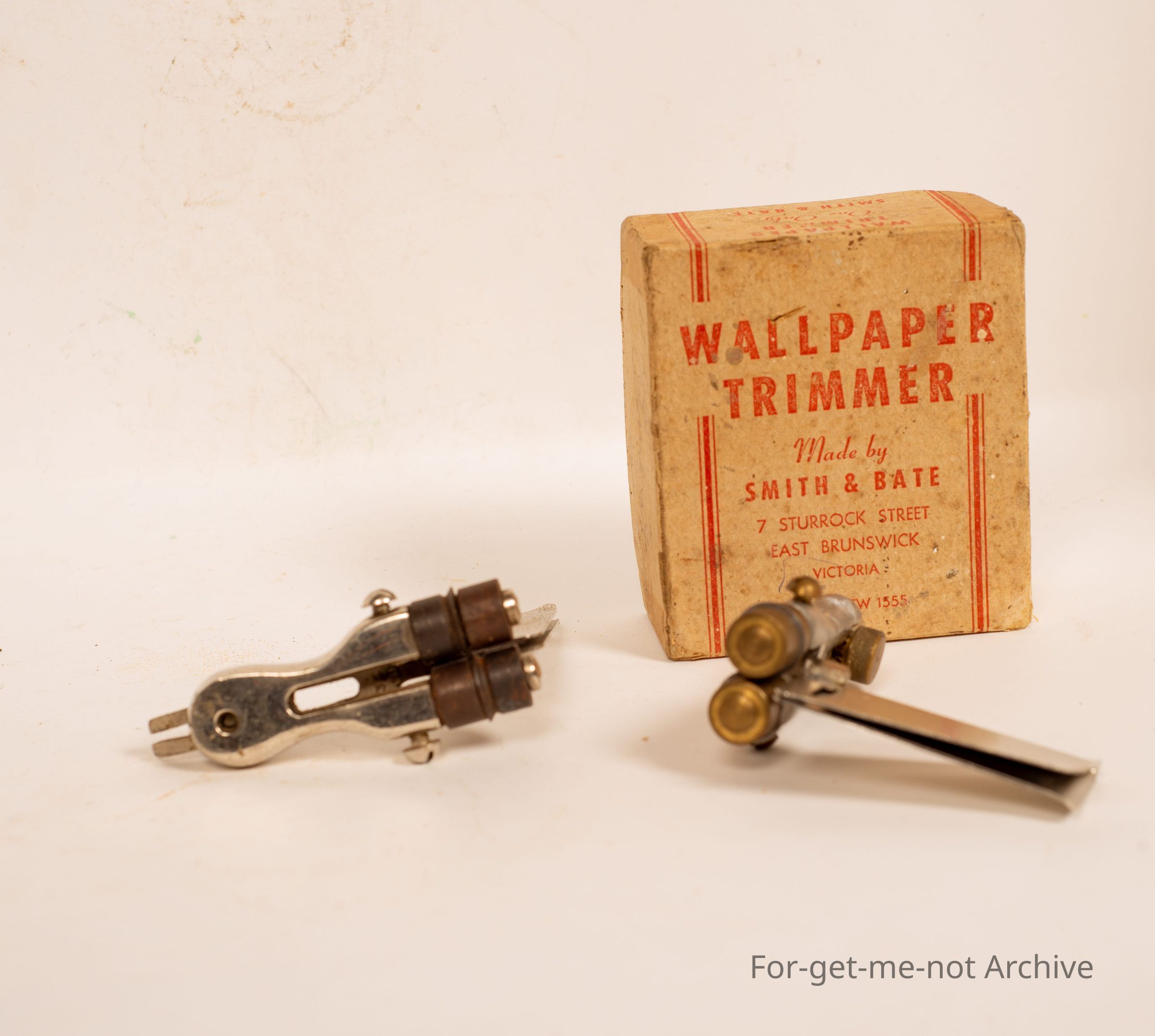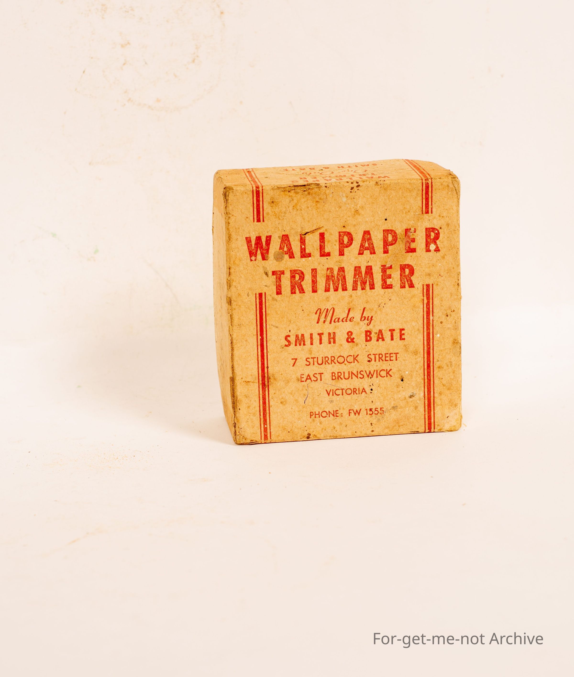 Cardboard box with wallpaper trimmer intact made by Smith and Bate, Brunswick, Victoria.