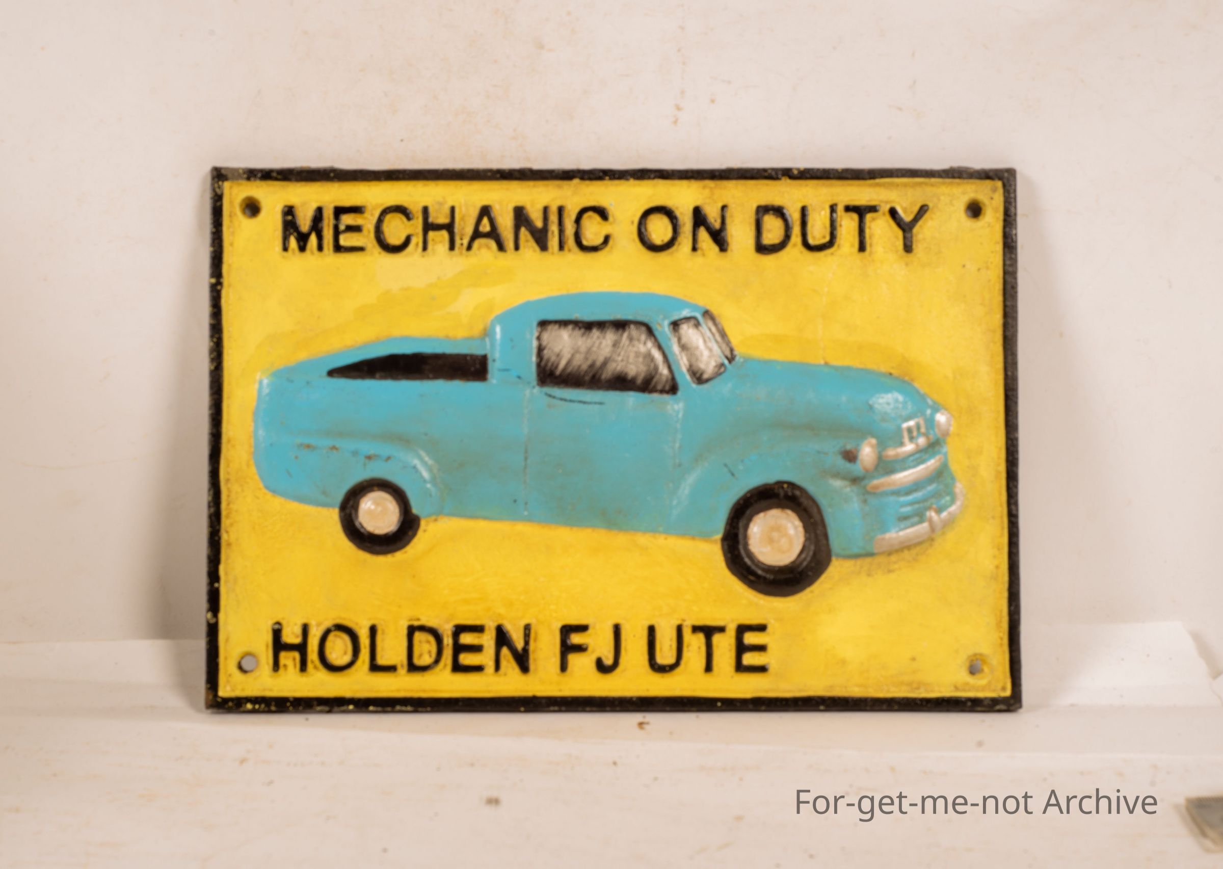 Sangeet Collection, This is a rectangular cast iron image of an FJ Holden Ute saying mechanic on duty, Holden FJ Ute all painted.