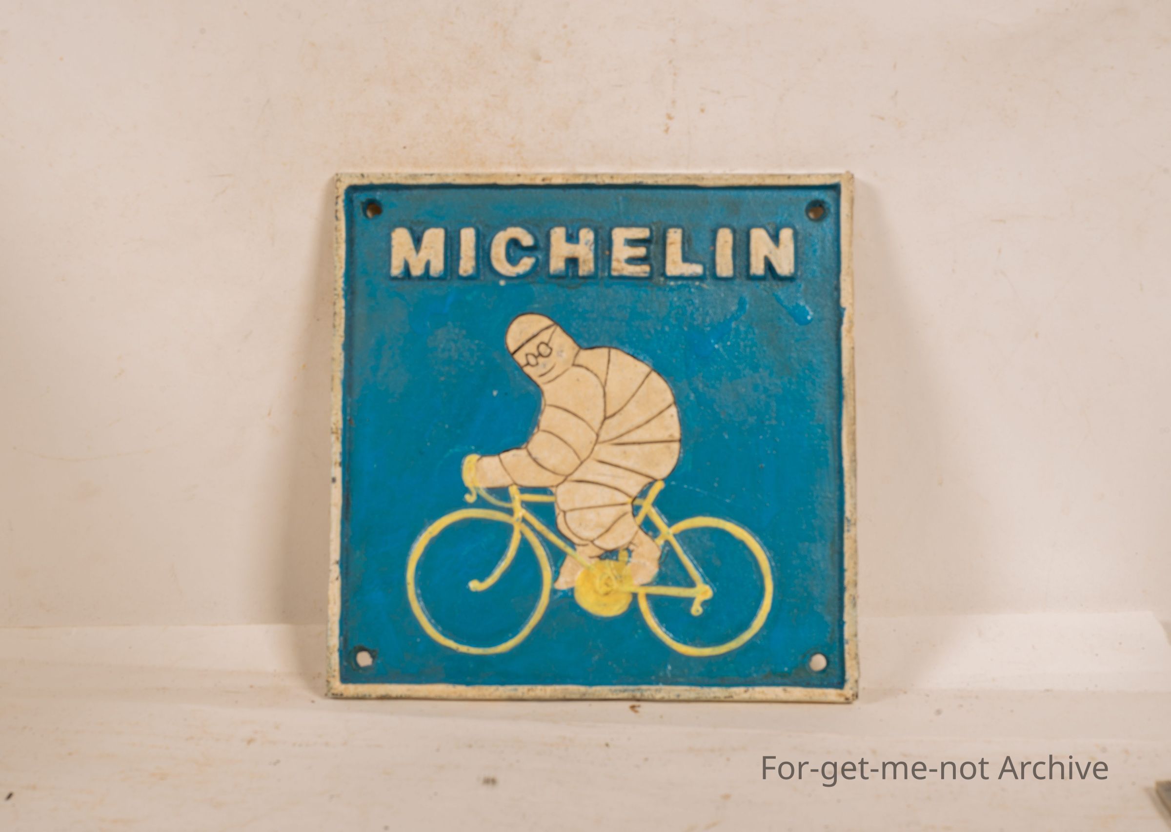 Sangeet Collection, This is a square of cast plaque with an image of Bibendum riding a push bike stating Michelin. Painted