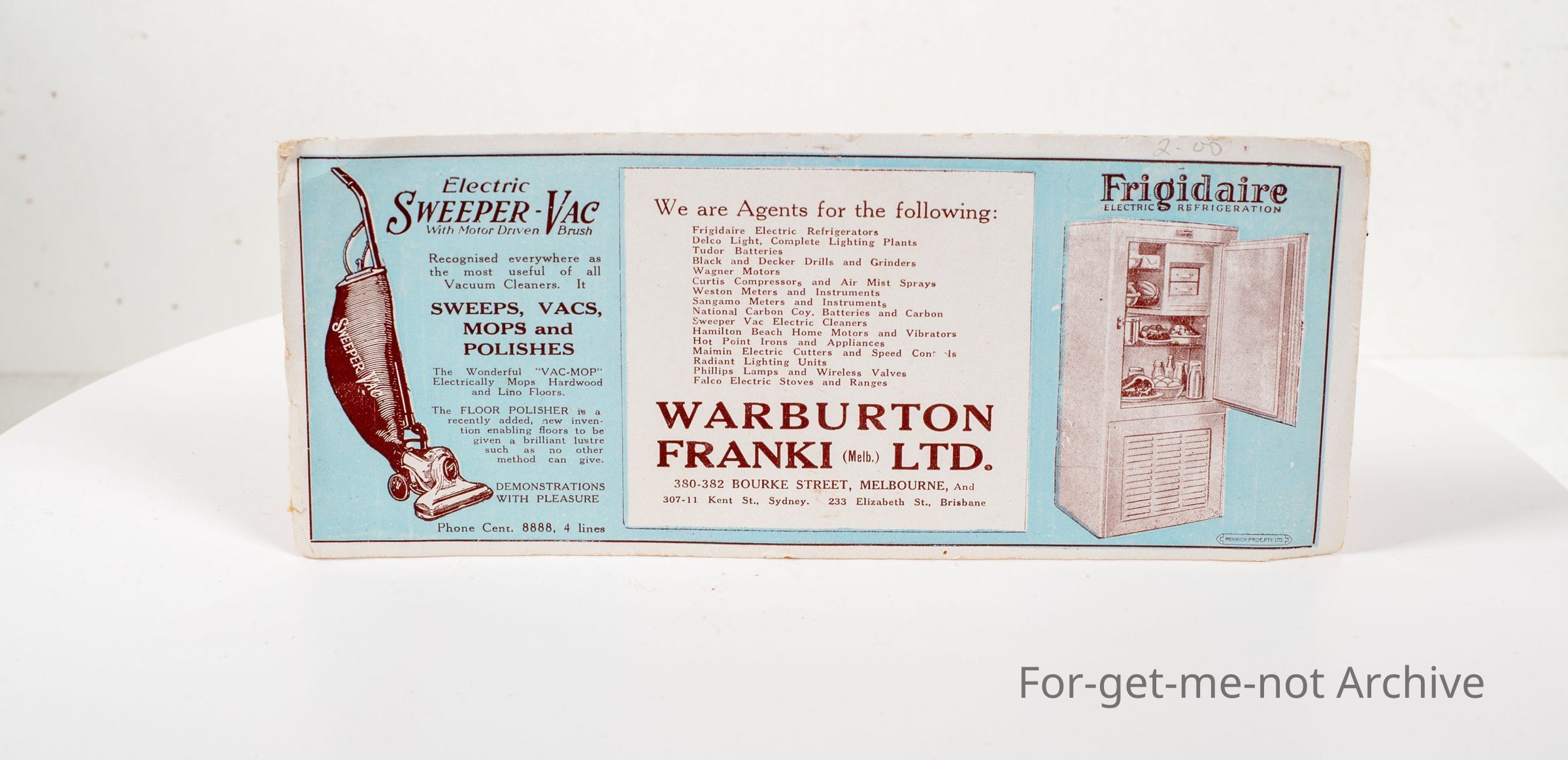 Cardboard advertising piece for Warburton Frankie, Melbourne with electric floor sweeper and Frigidaire fridge.