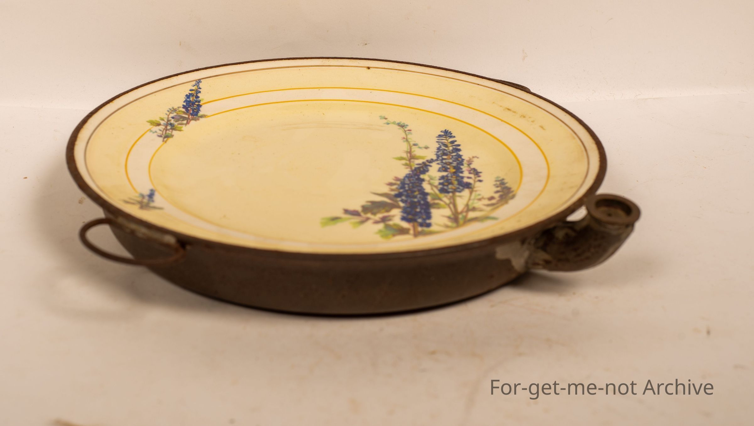 Situated in a tin base plate, the warmer was filled with boiling water to keep the food warm. A wire handle either side to lift out.