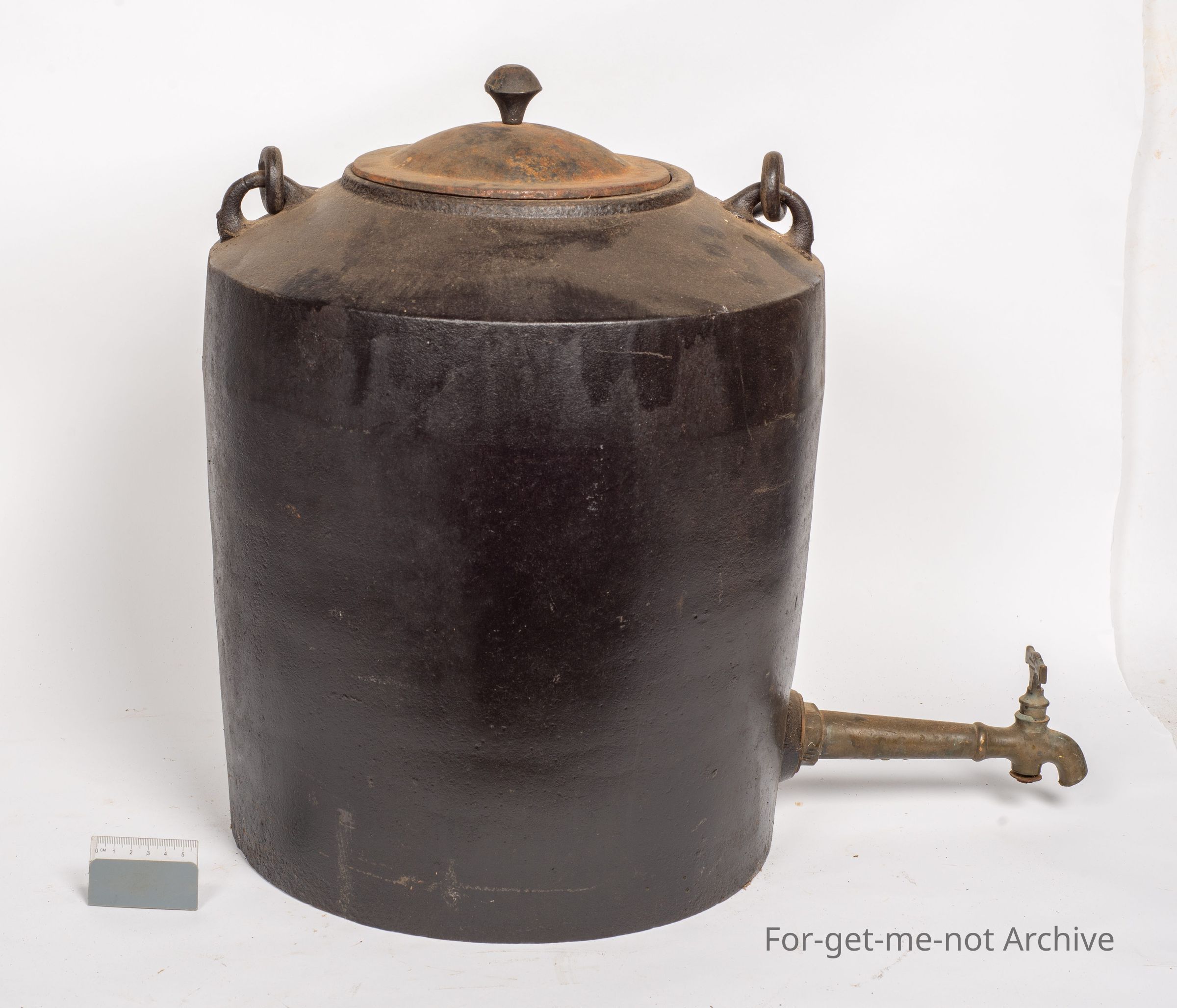 This is a beautiful water fountain made by Finway Scotland. Extremely hard to find. This is a 10 gallon capacity. Original tap hanger. The lid is debatable, but it still has a cast iron lid.Collection