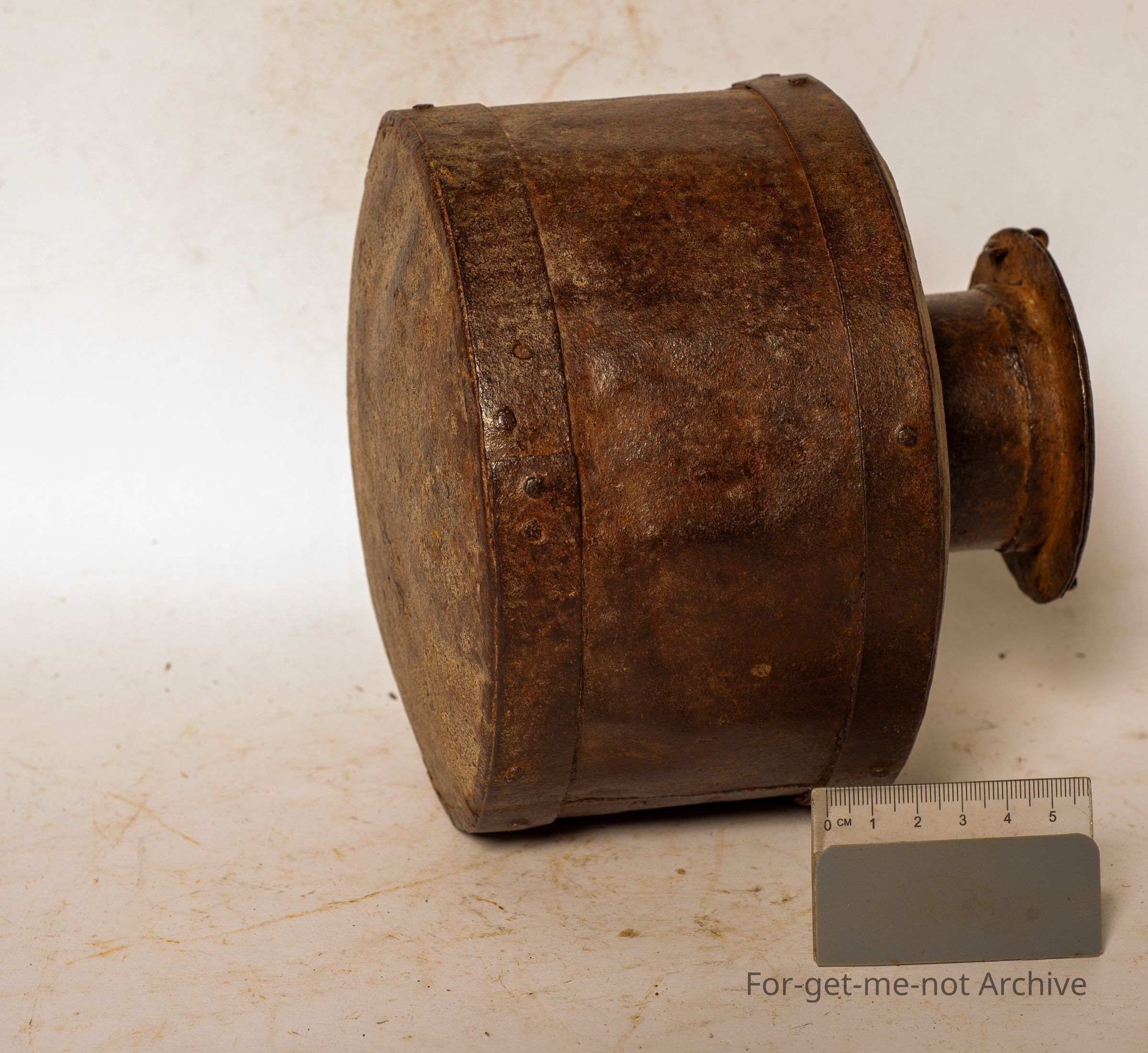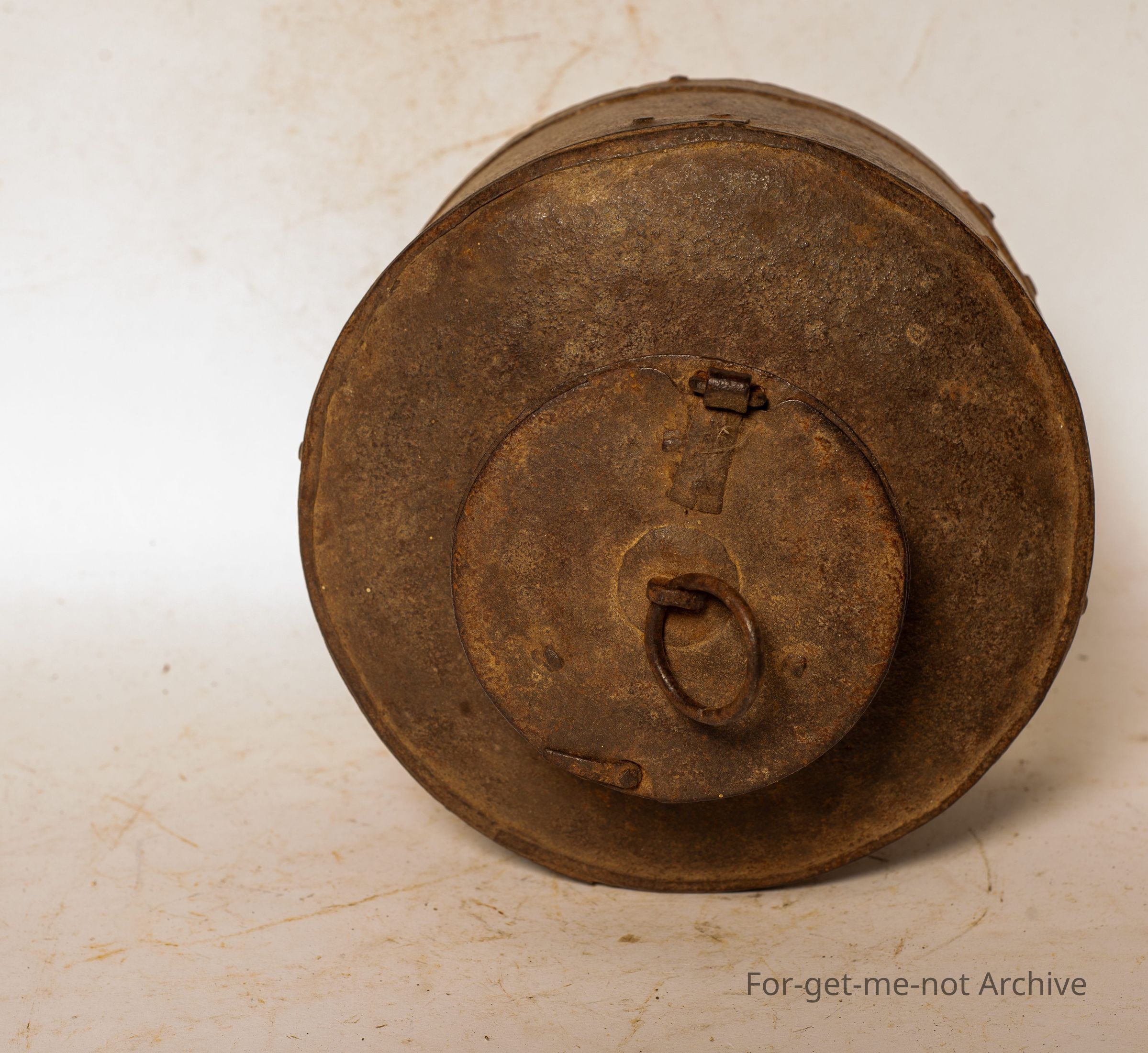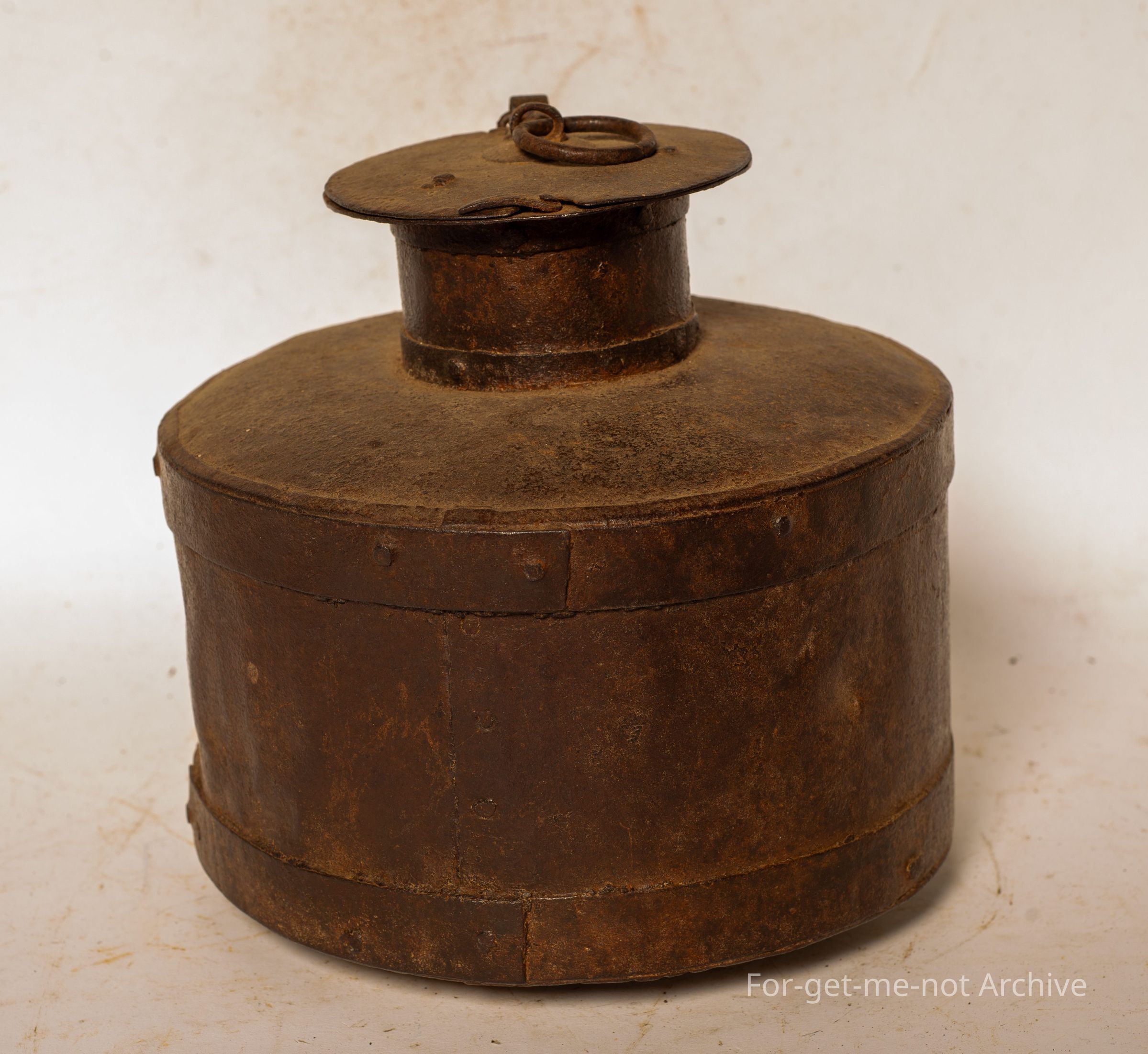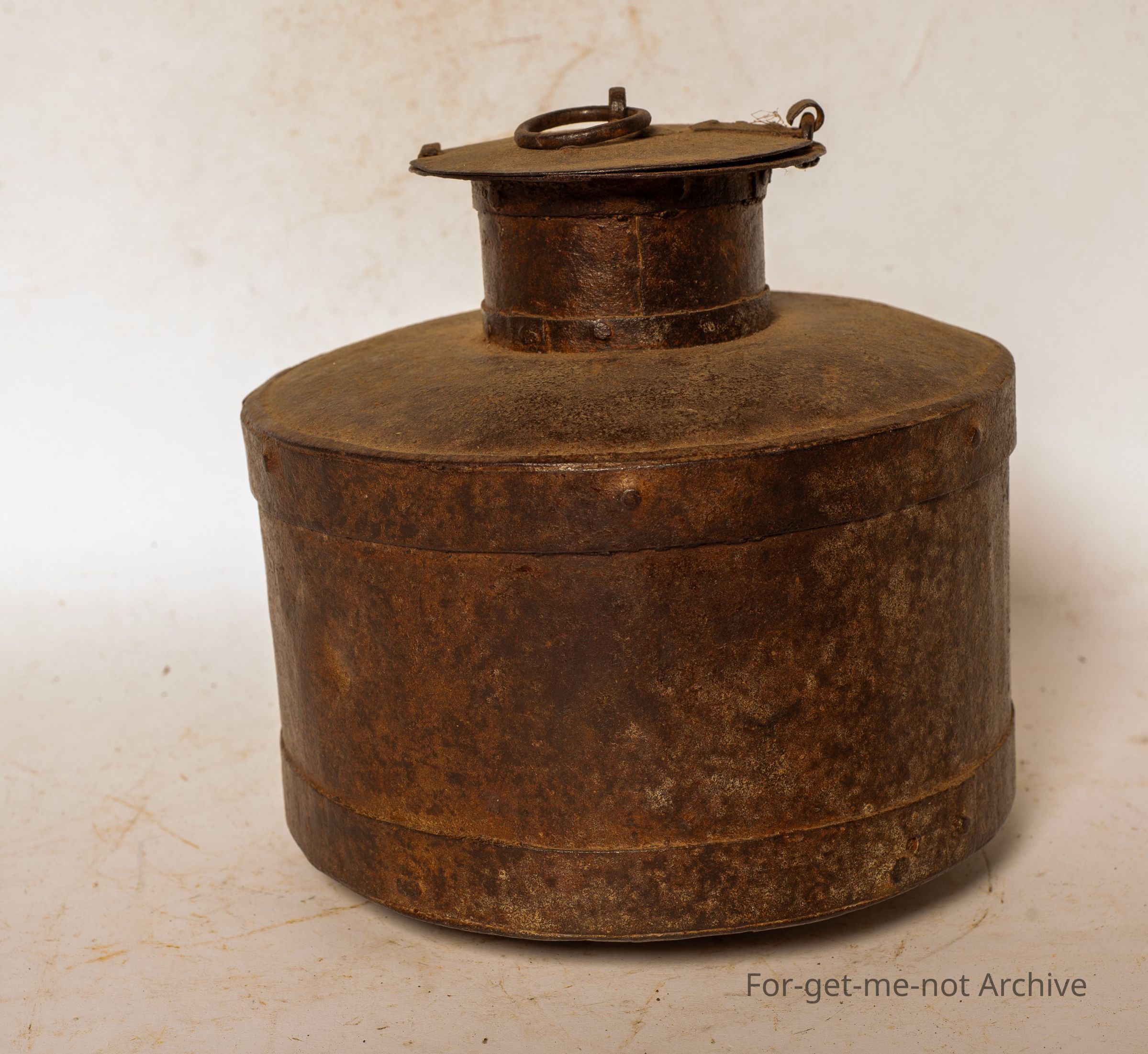 This vessel is, of Obscura origins, made of tin with a dome base, has an ornate lid. It gives the appearance of being Indian rather than Chinese. It is a water carrying vessel.