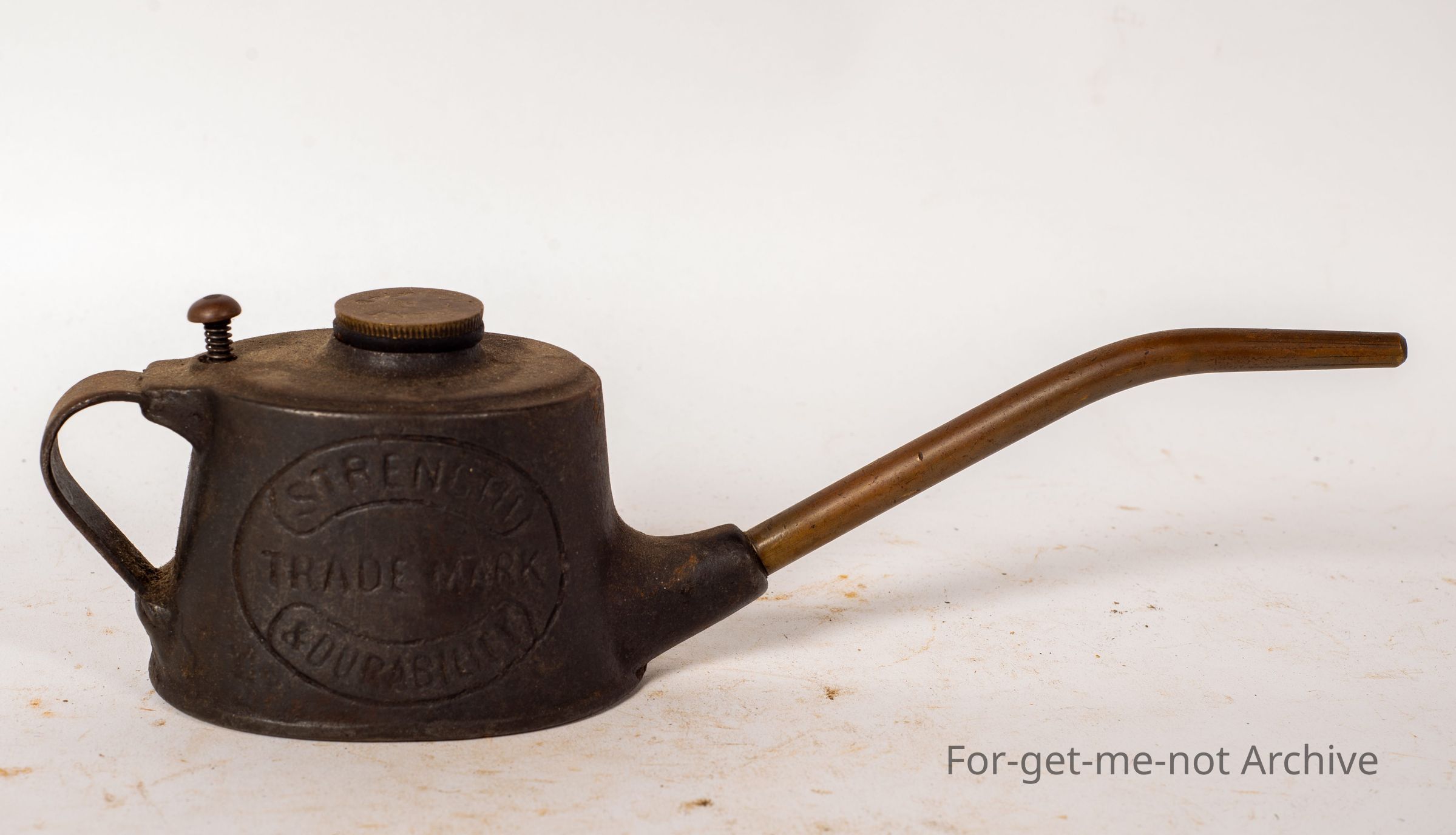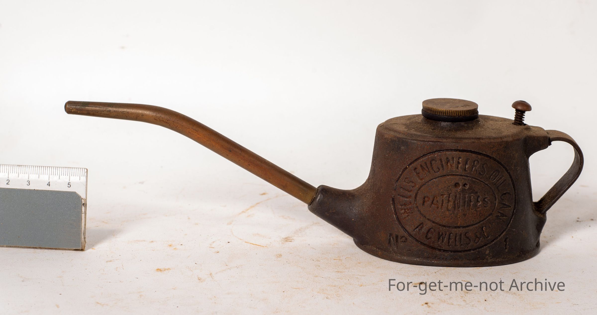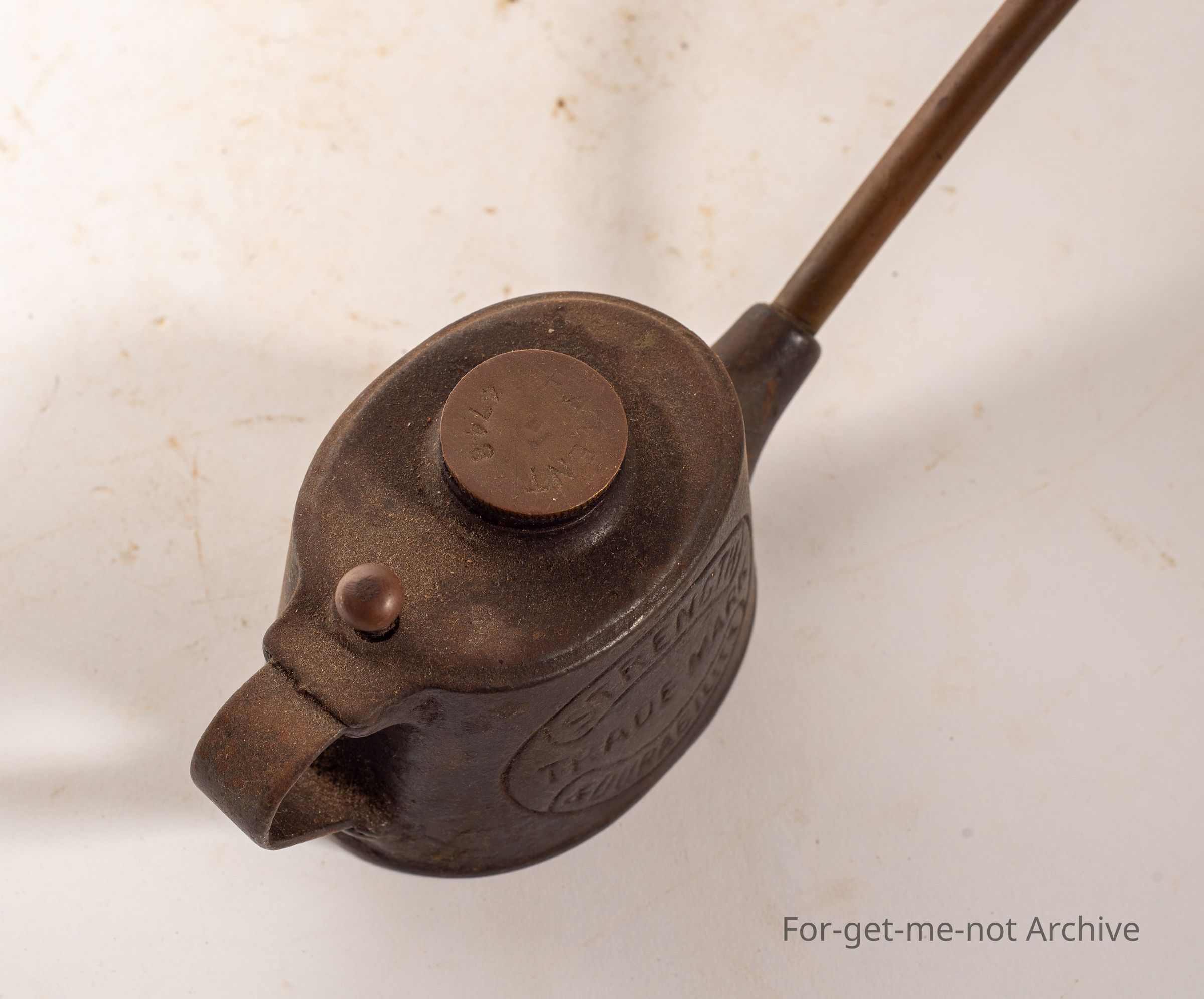 This is in wonderful condition. Has the original, brass spout, the original brass lid, and the, air or the finger operated air valve to let the oil run from the can. Beautiful piece.Collection