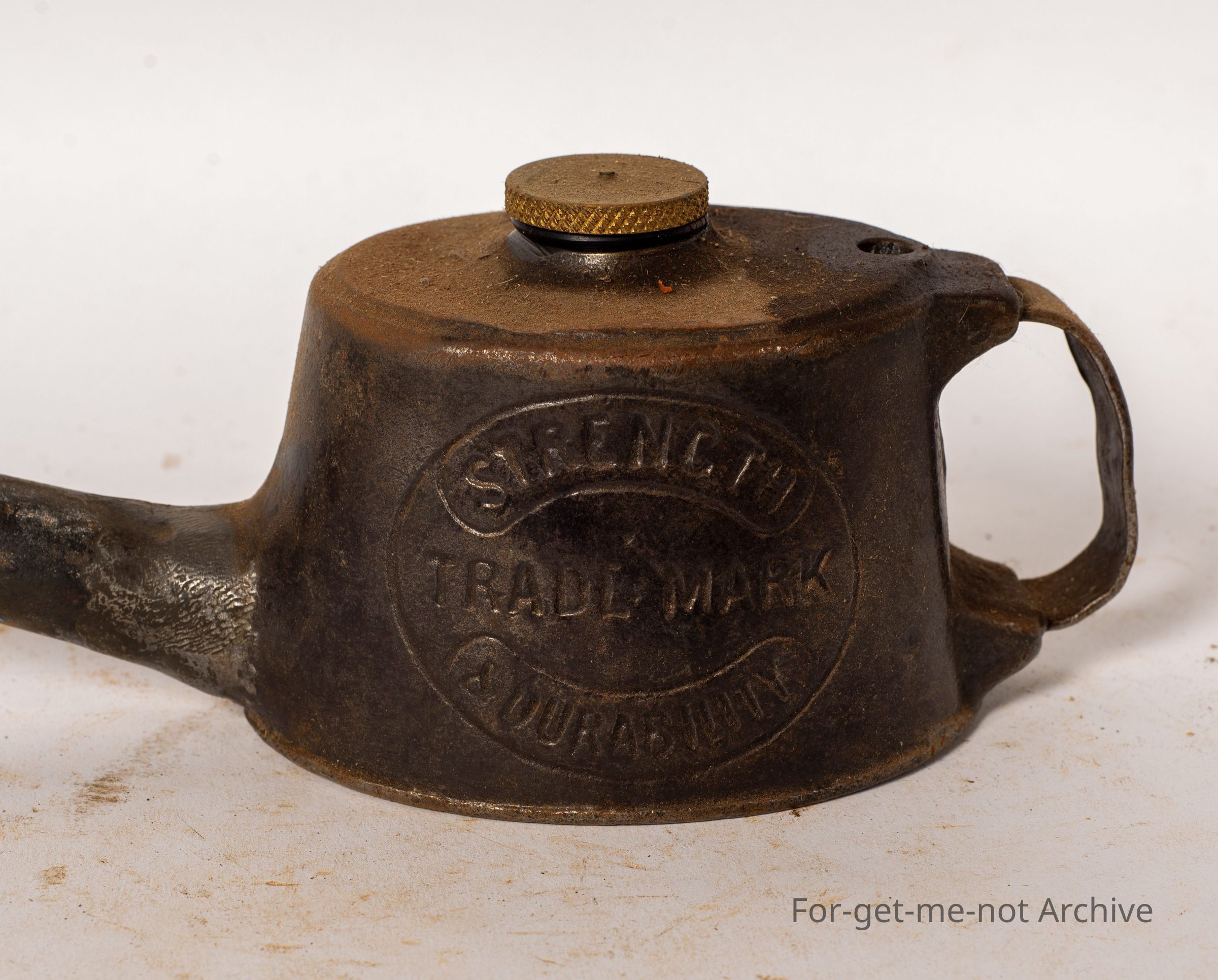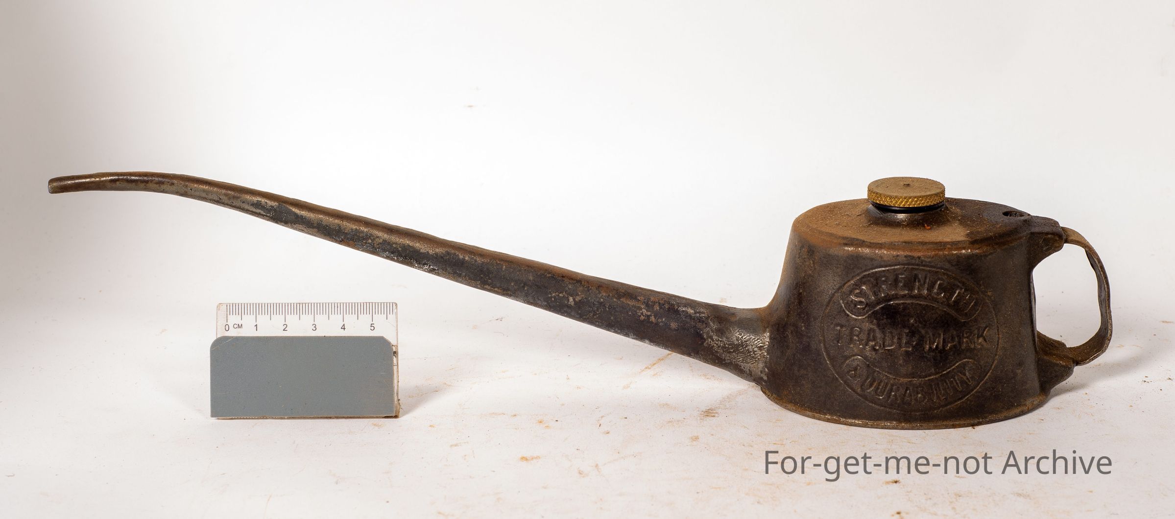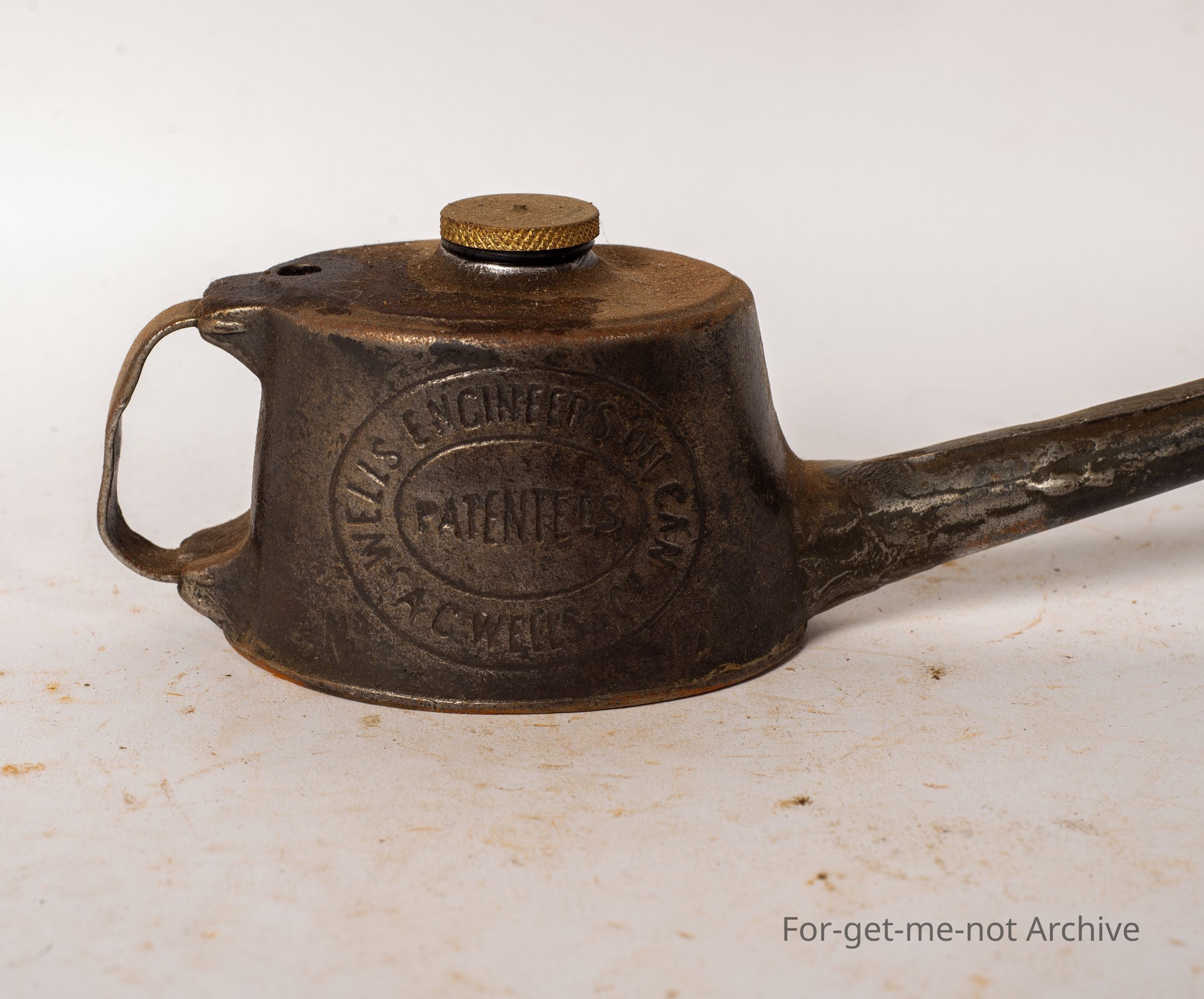 This is called the, Wells Engineers oil can . Very long spout,. The air valve is missing. The oiler has an air valve that when released allows the oil to flow out of the oiler via gravity rather than by pumped pressureCollection