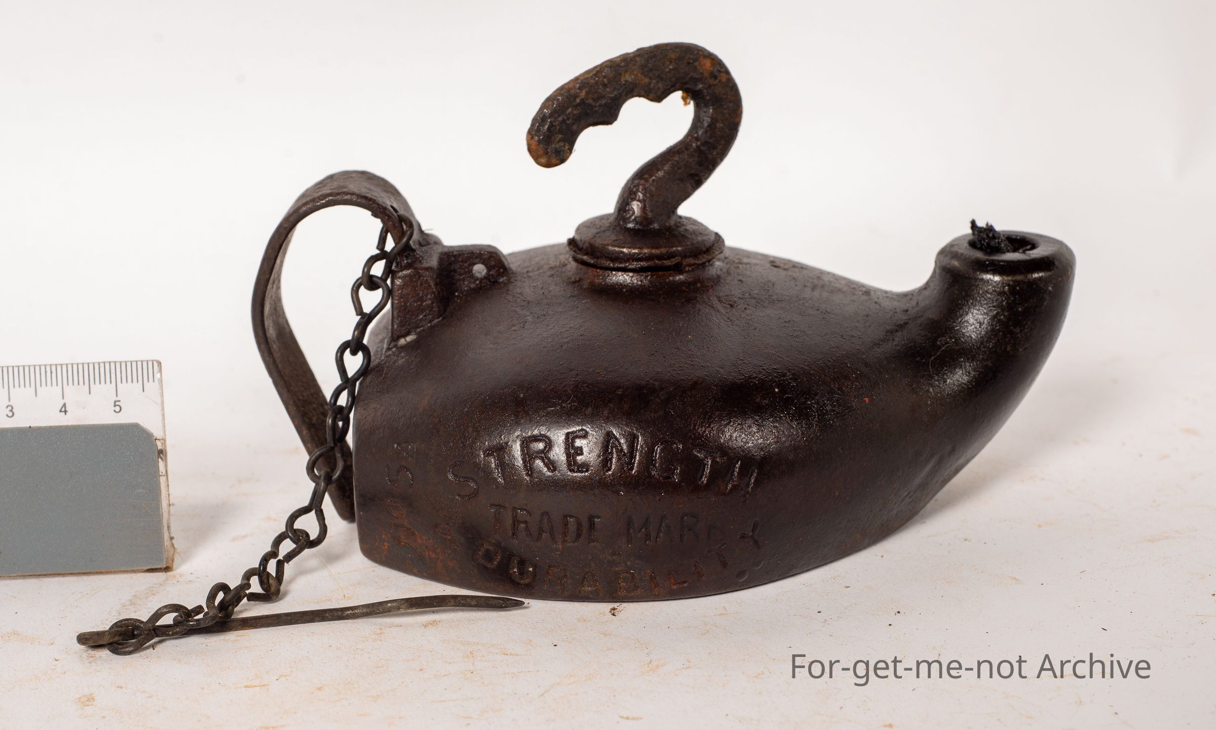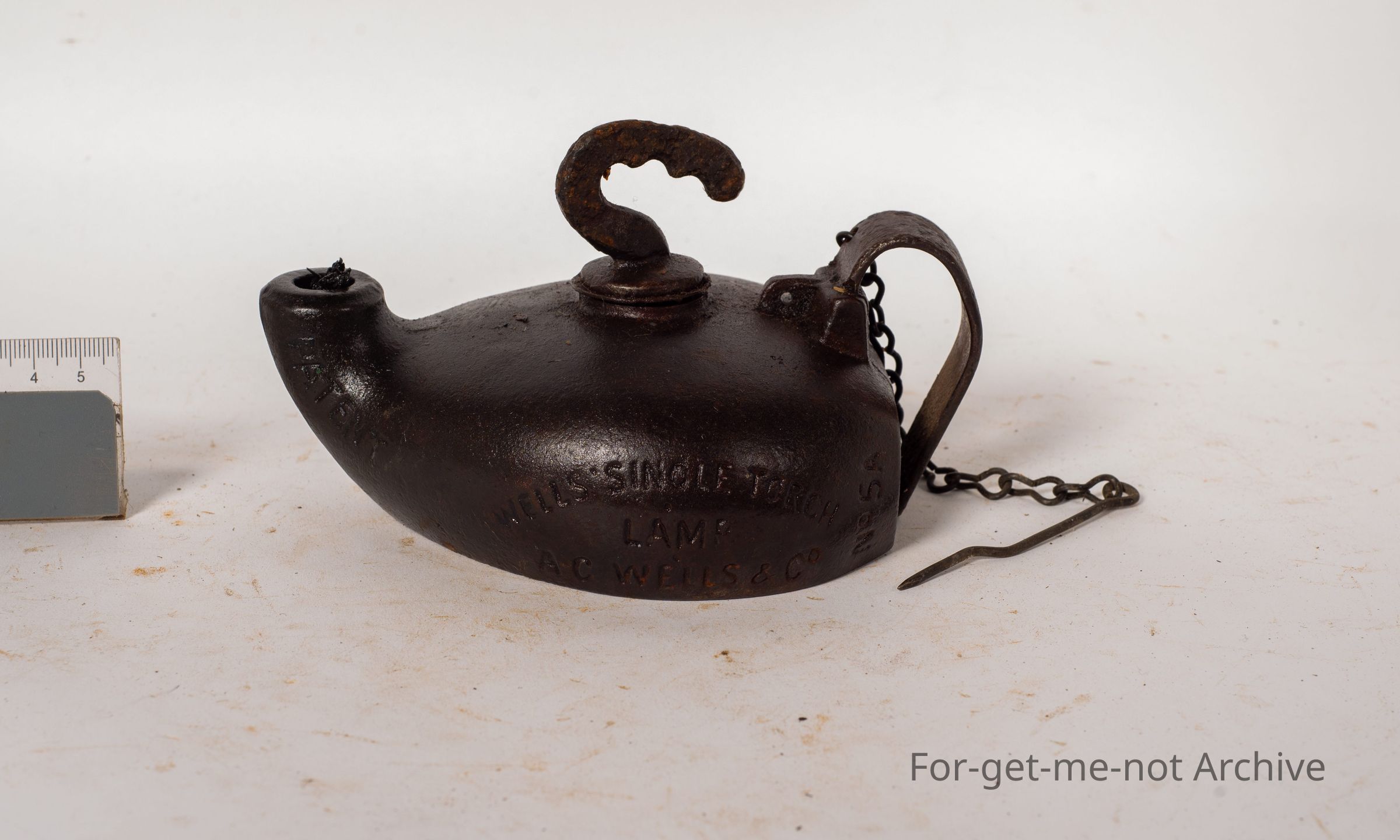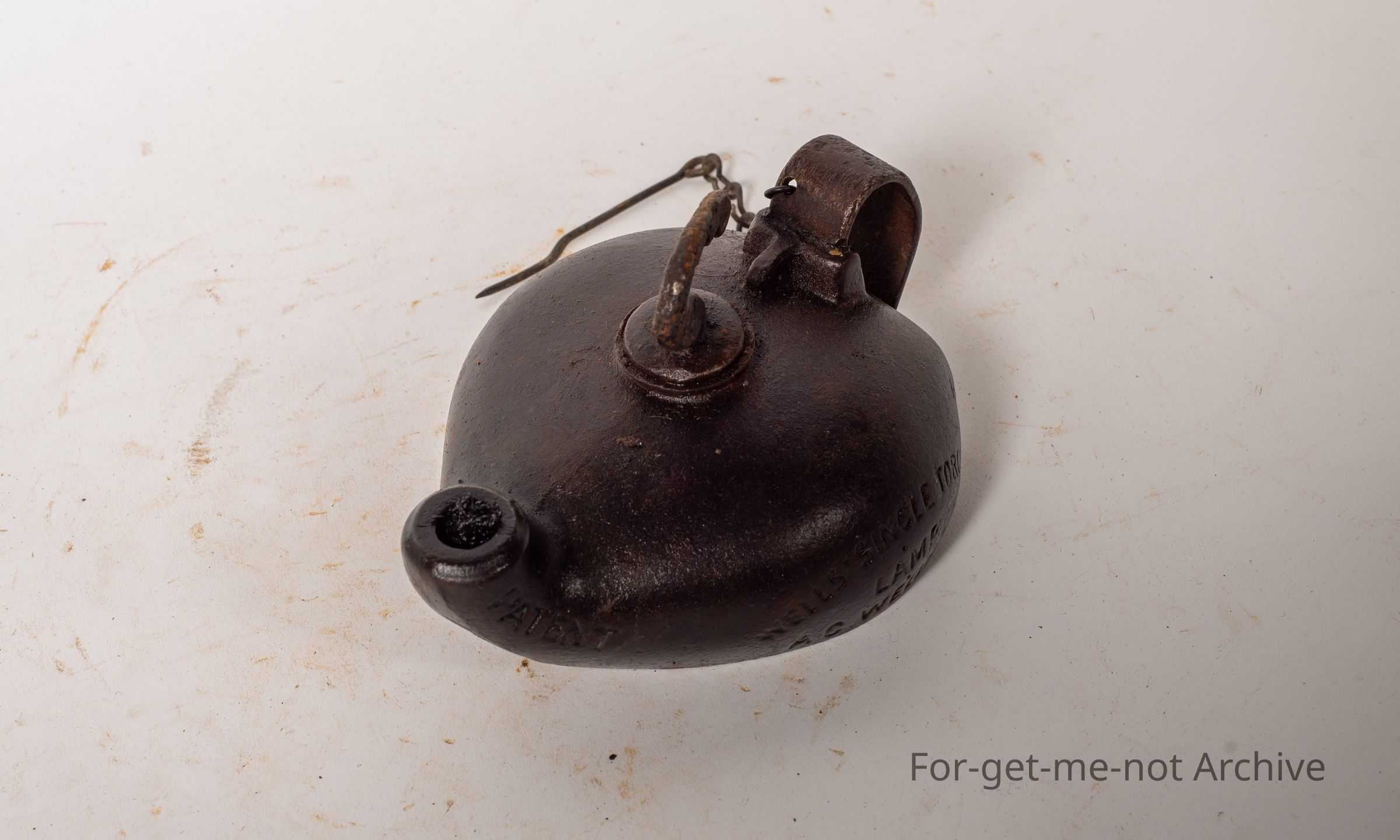 This is another Wells lamp, the unbreakable trade symbol. This one is referred to as the miner's lamp. Has an adjustable handle on the top that you can tilt it to put run the oil down to the wick when it's getting low. It has the chain with the wick pricker still attached and the little metal handle at the back. A rare piece of Wells production.Collection