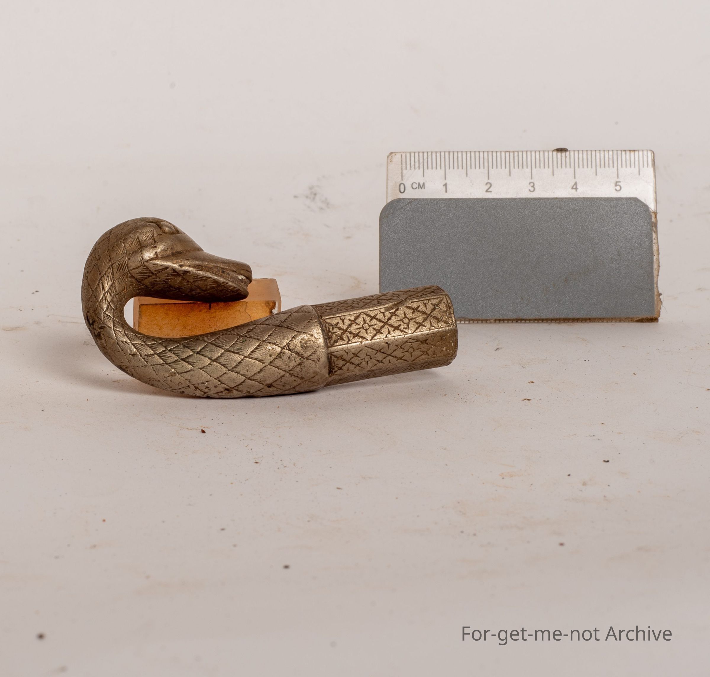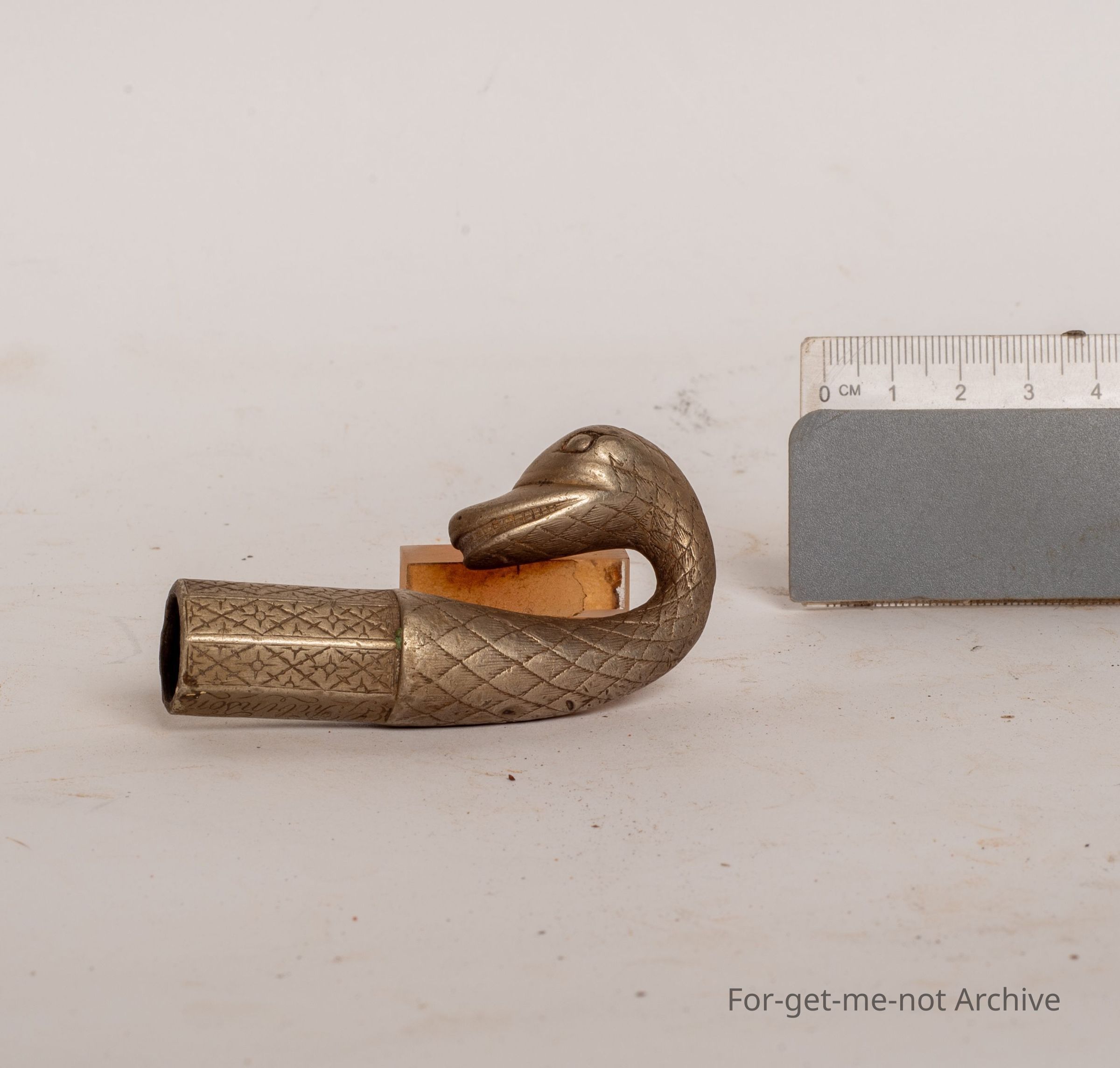 This is a beautiful cast end from a whip. Looks to be made of nickel. Gloriously decorated in the form of a swan's head. Only part that's here is the whip end. The rest gone, but still lovely piece.Collection