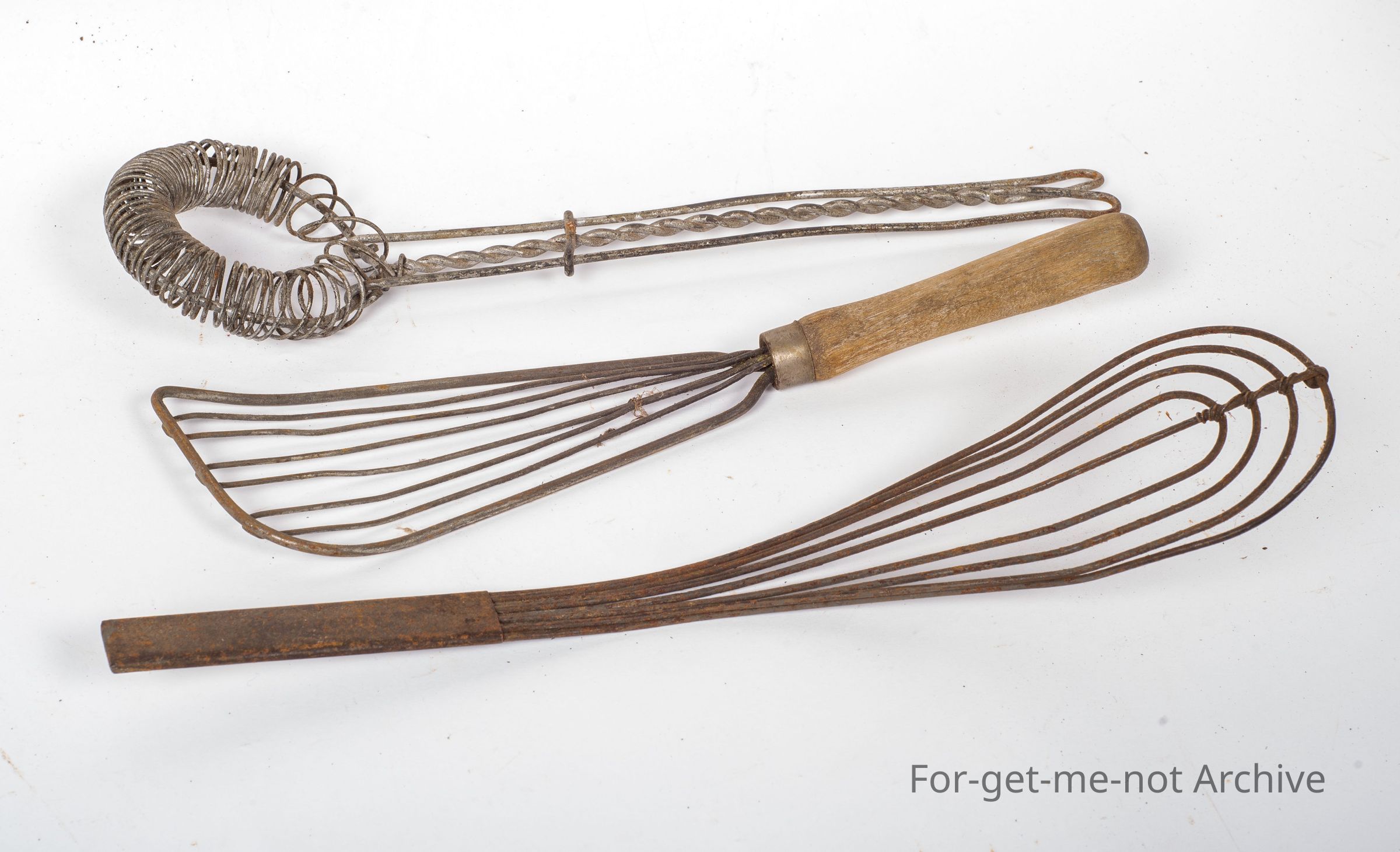 Another group of 3 wire work, whisk, one with a wooden handle, all different shapes, but they all do the same job.