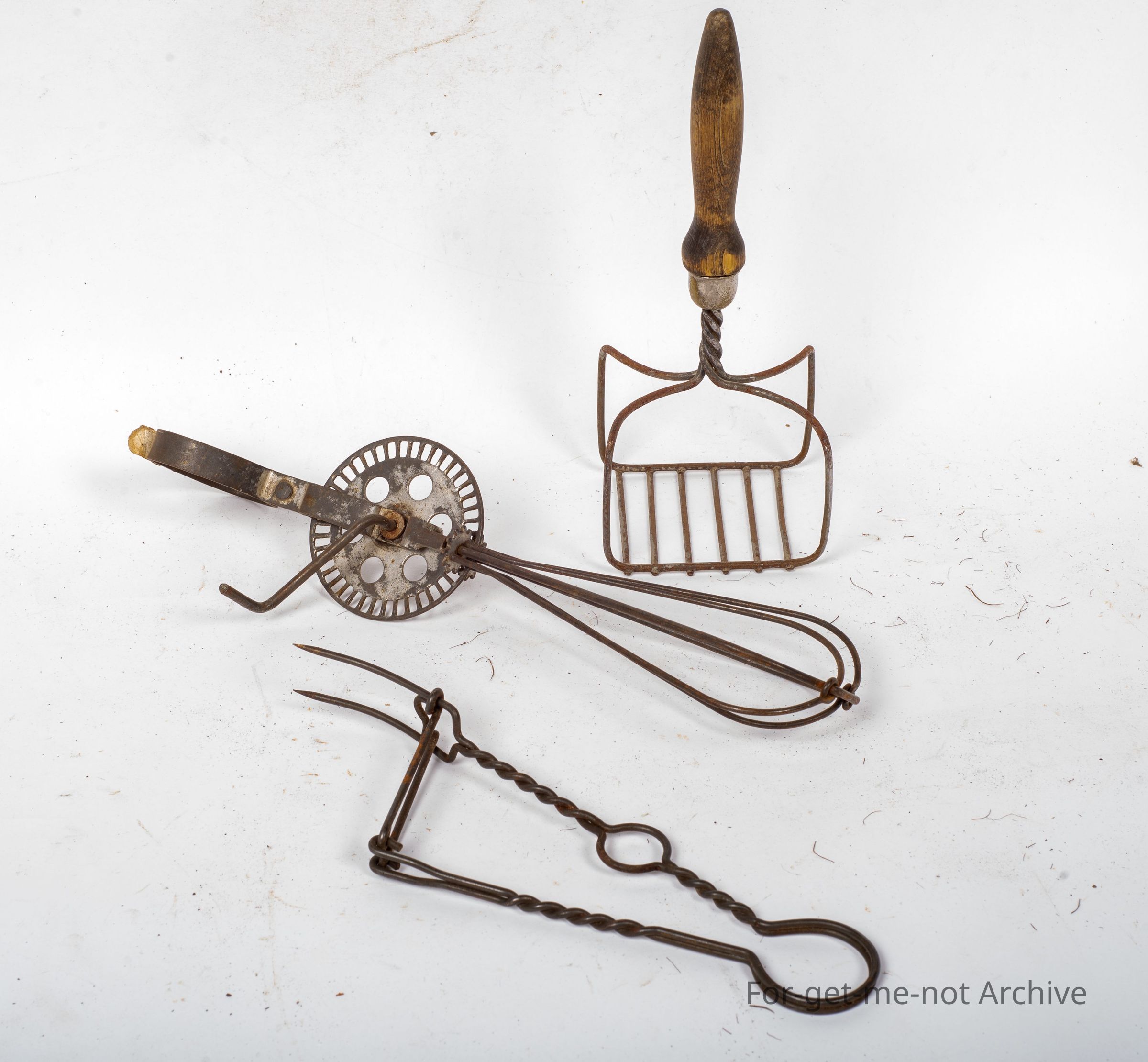 Is a group of 3 kitchen implements. 1, a spud masher. 2, a hand operated kitchen whisk. The third one, is a fork with a piece when pressed together, pushes whatever's on the fork off. A clever little piece.Collection