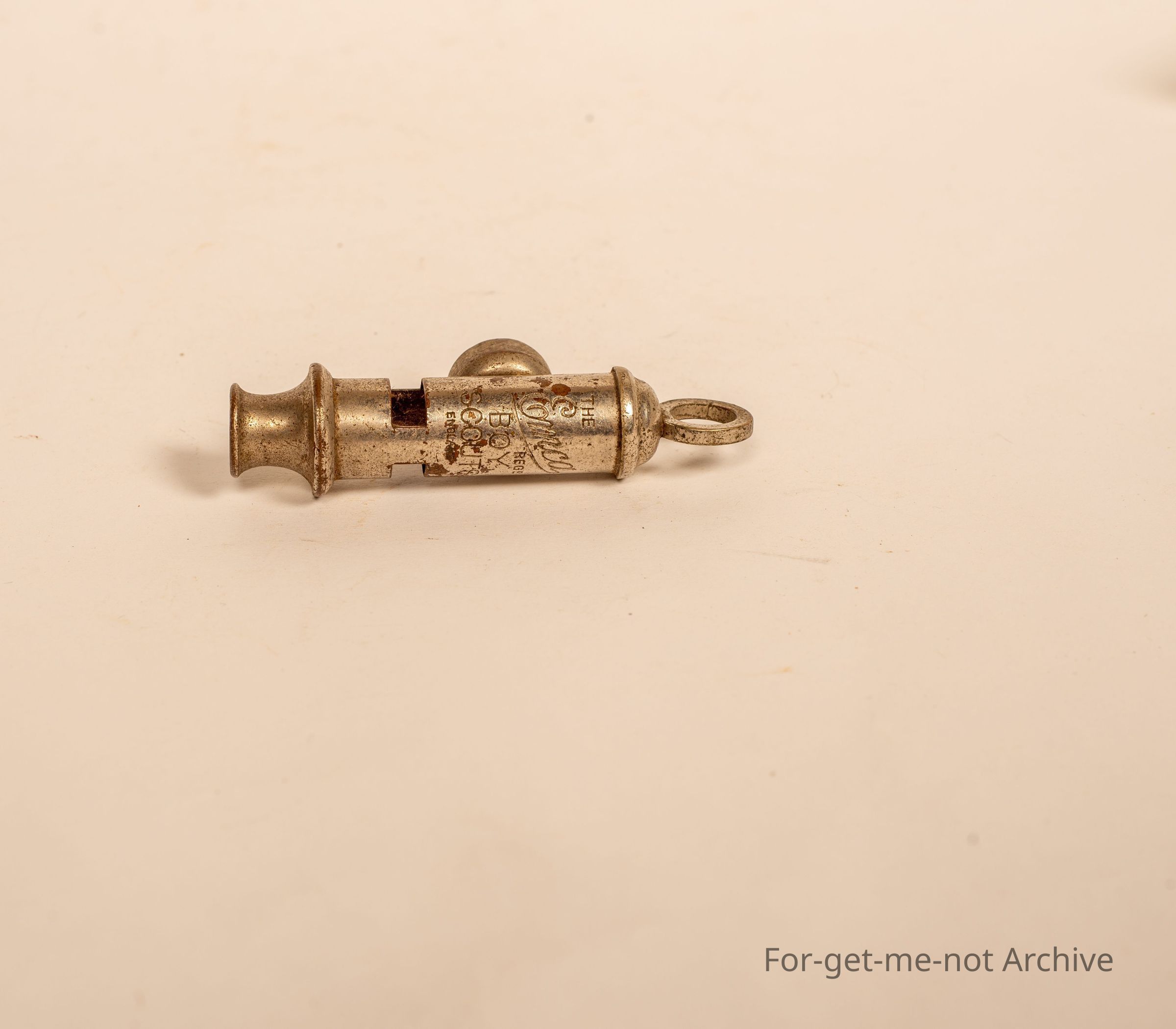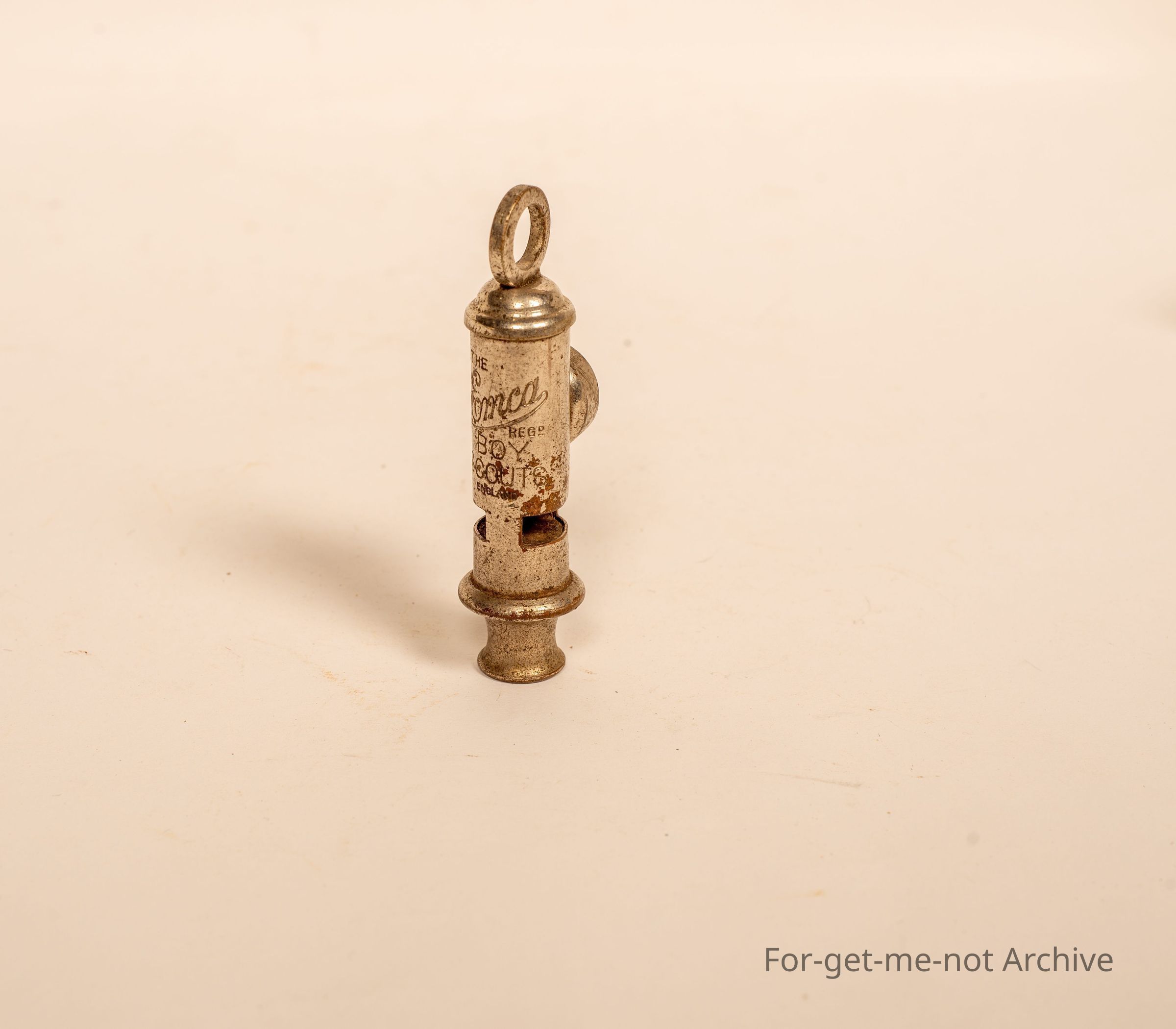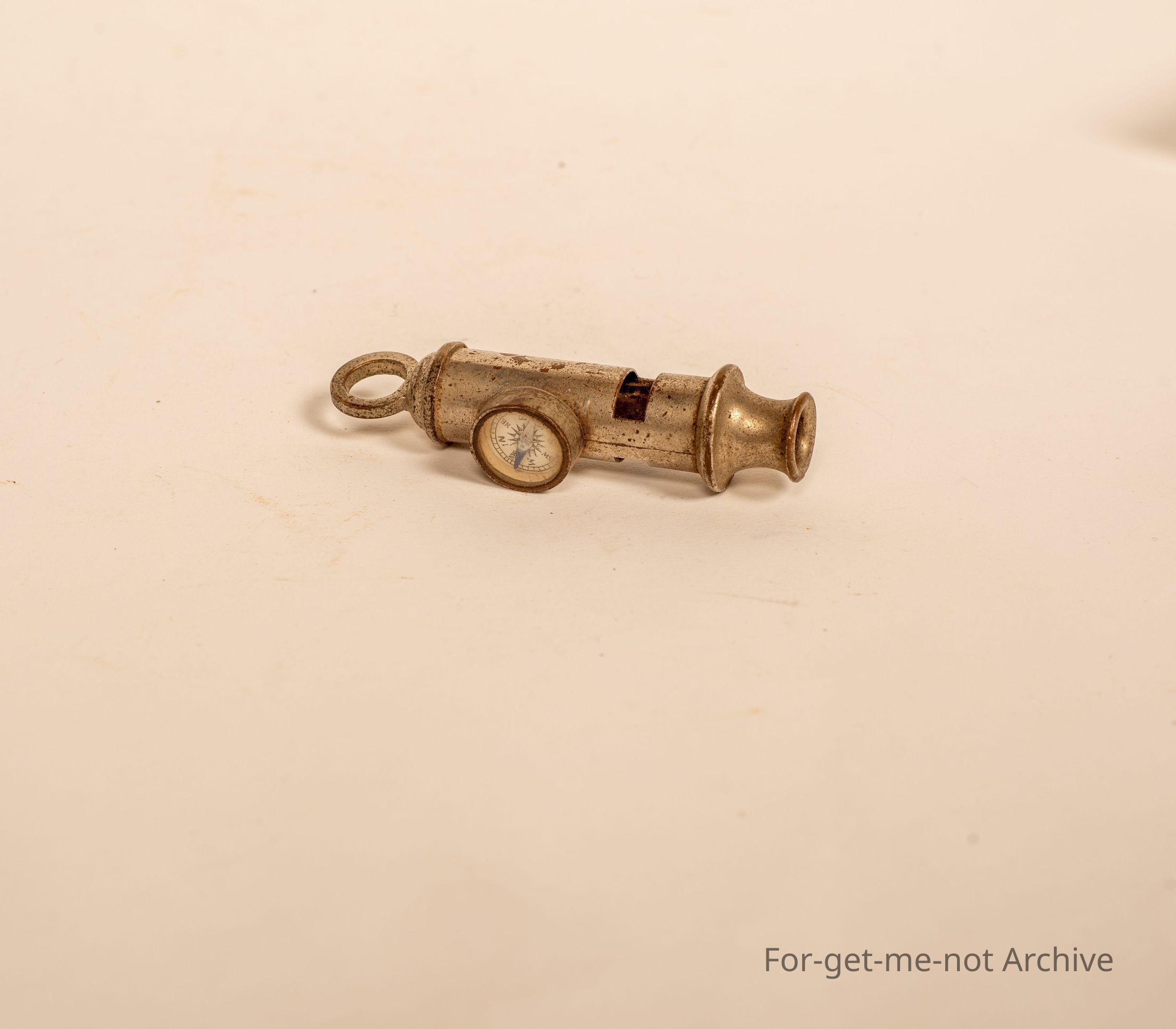 Tin whistle. Possibly oh, it is for a Boy Scouts, and it has a compass on the top of the whistle.