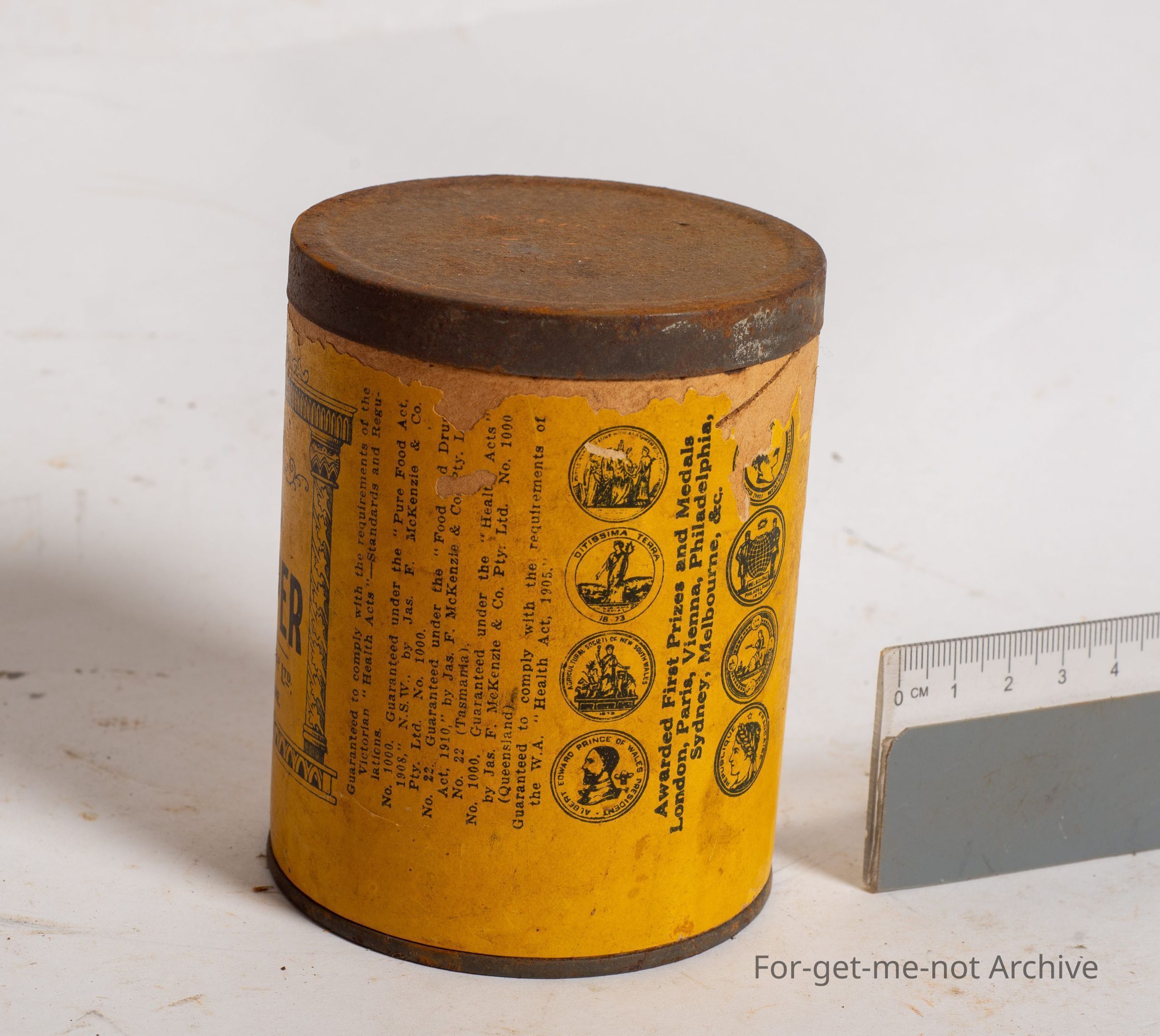 This is a tin of finest ground white pepper, produced by F Mackenzie, Melbourne, Sydney, Brisbane. This is a paper labelled tin. In considering its age, it's in very good condition. Hard to find.Collection