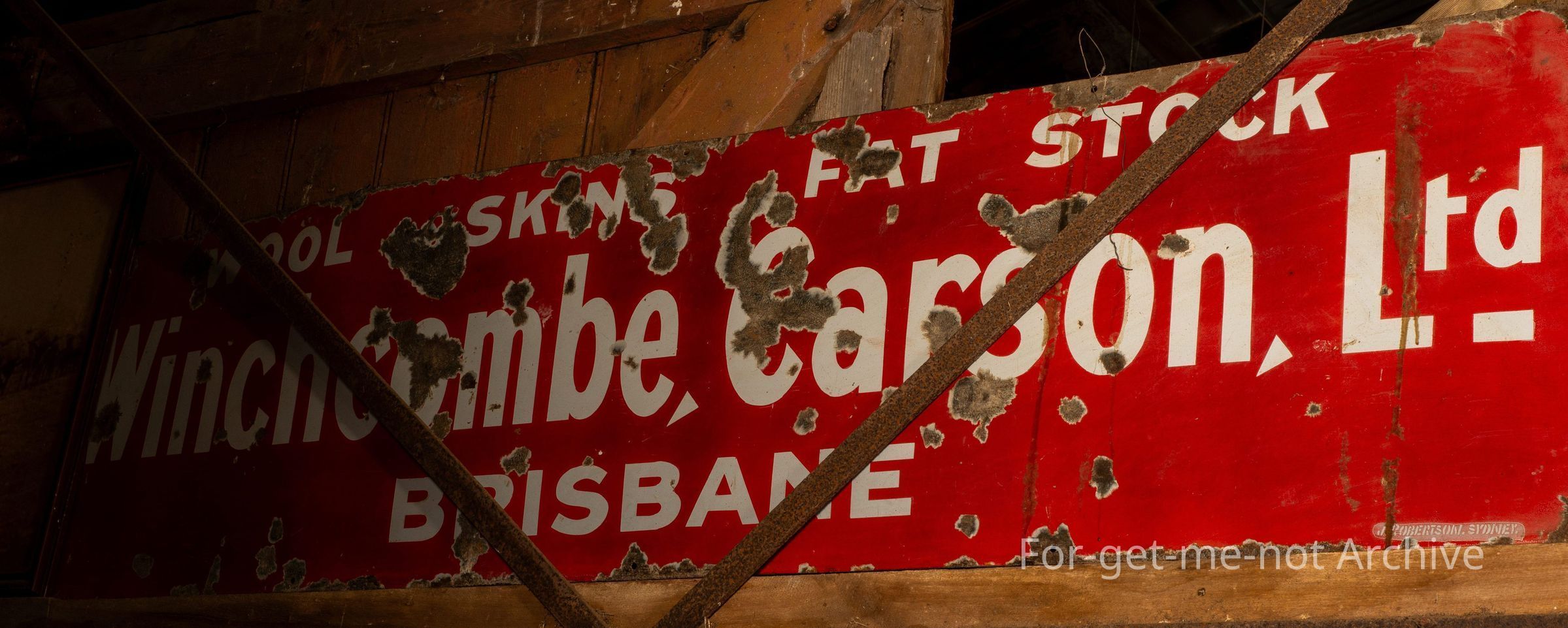 Description, this is rather long sign, probably 6 foot by 2, red and white enamel. This one is advertising wool skins, flat stock, Winchcombe Carson Limited Brisbane, Stock and Station Agents. Quite a rare sign. Not often seen in Victoria.Collection