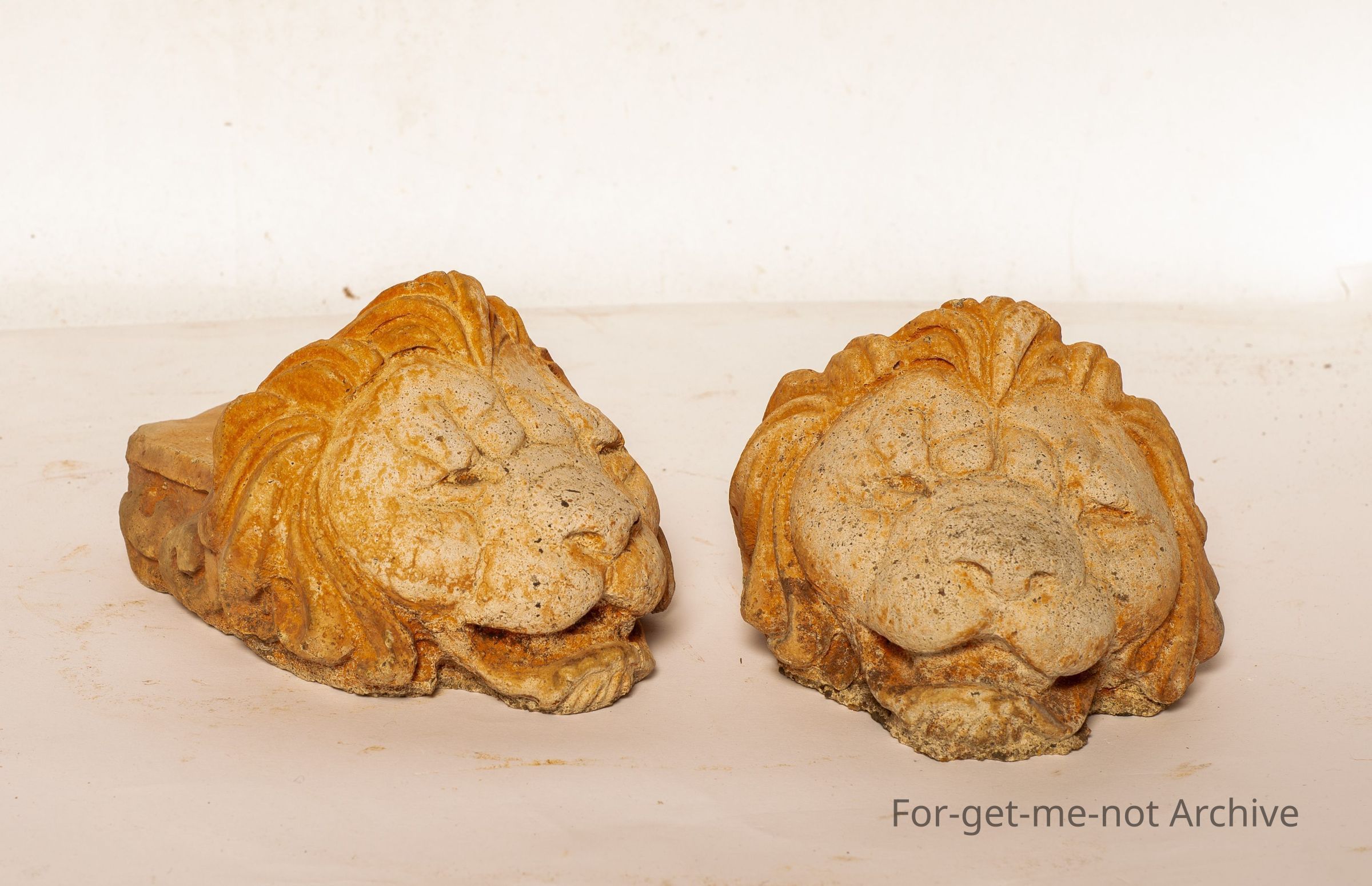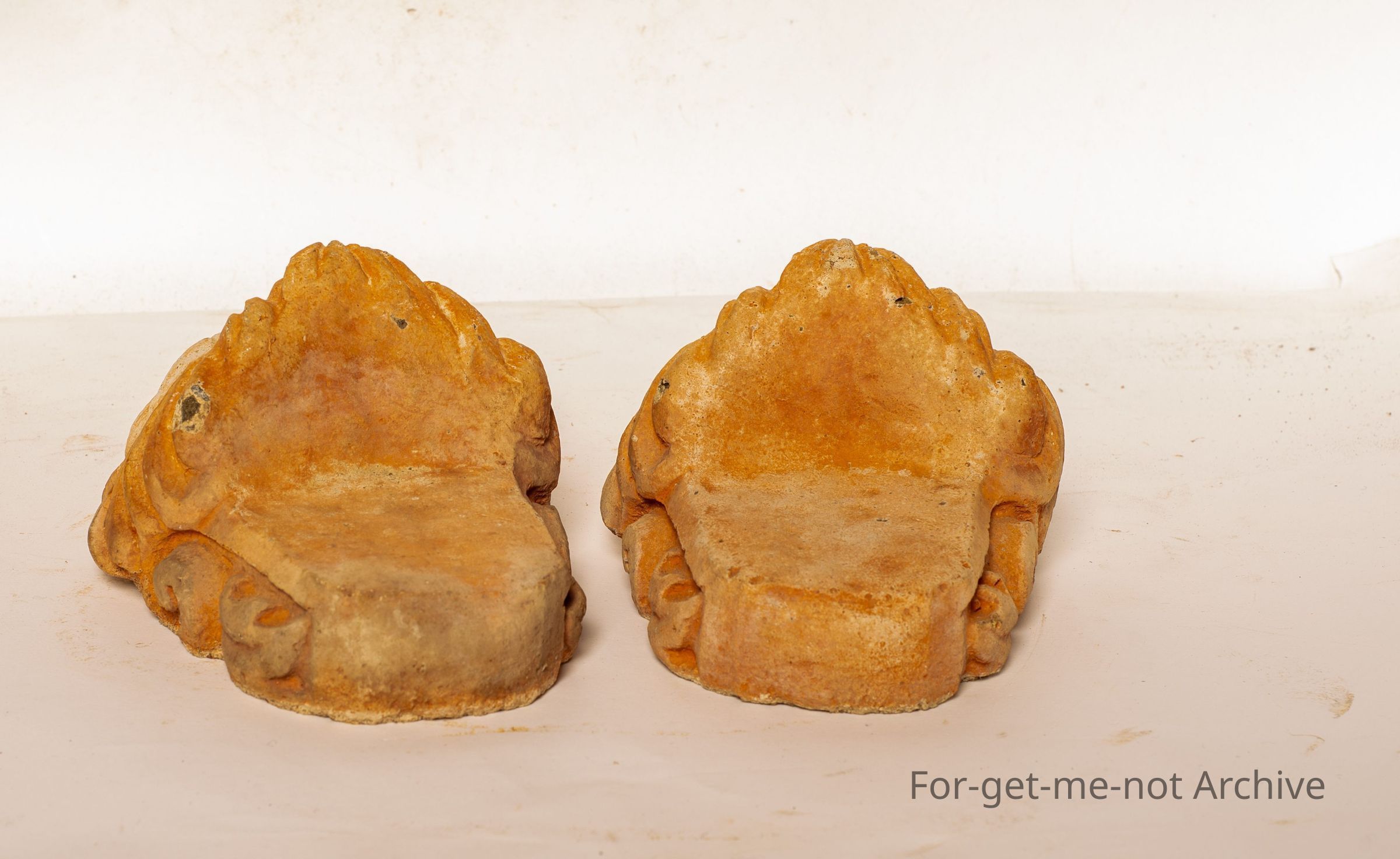 2 earthenware, stoneware window chocks. These are in the shape of a lion set at the front with a flat platform behind. These were used as window chocks to allow a draft to come through into an early house, sometimes used as footings for pieces of furniture.Collection