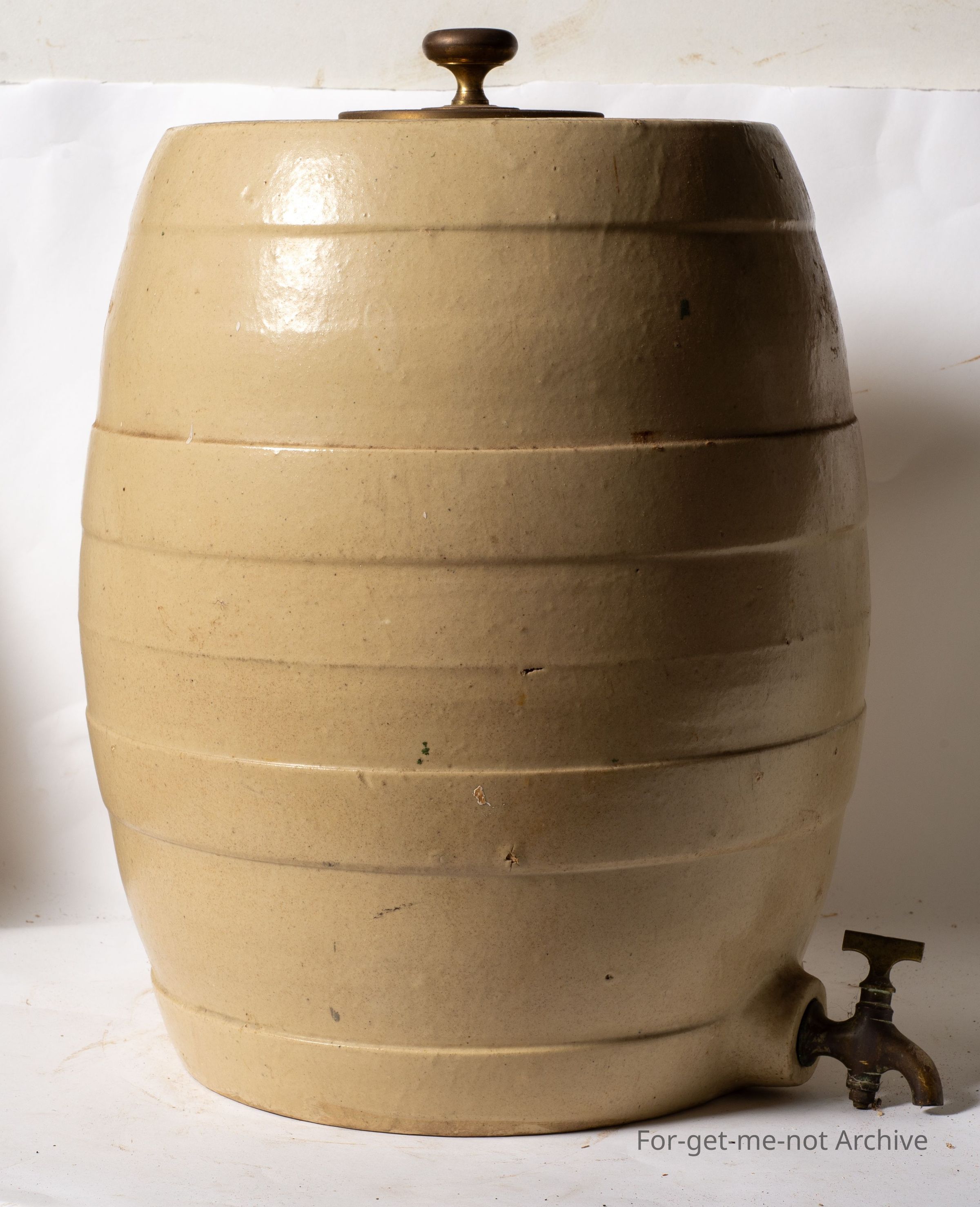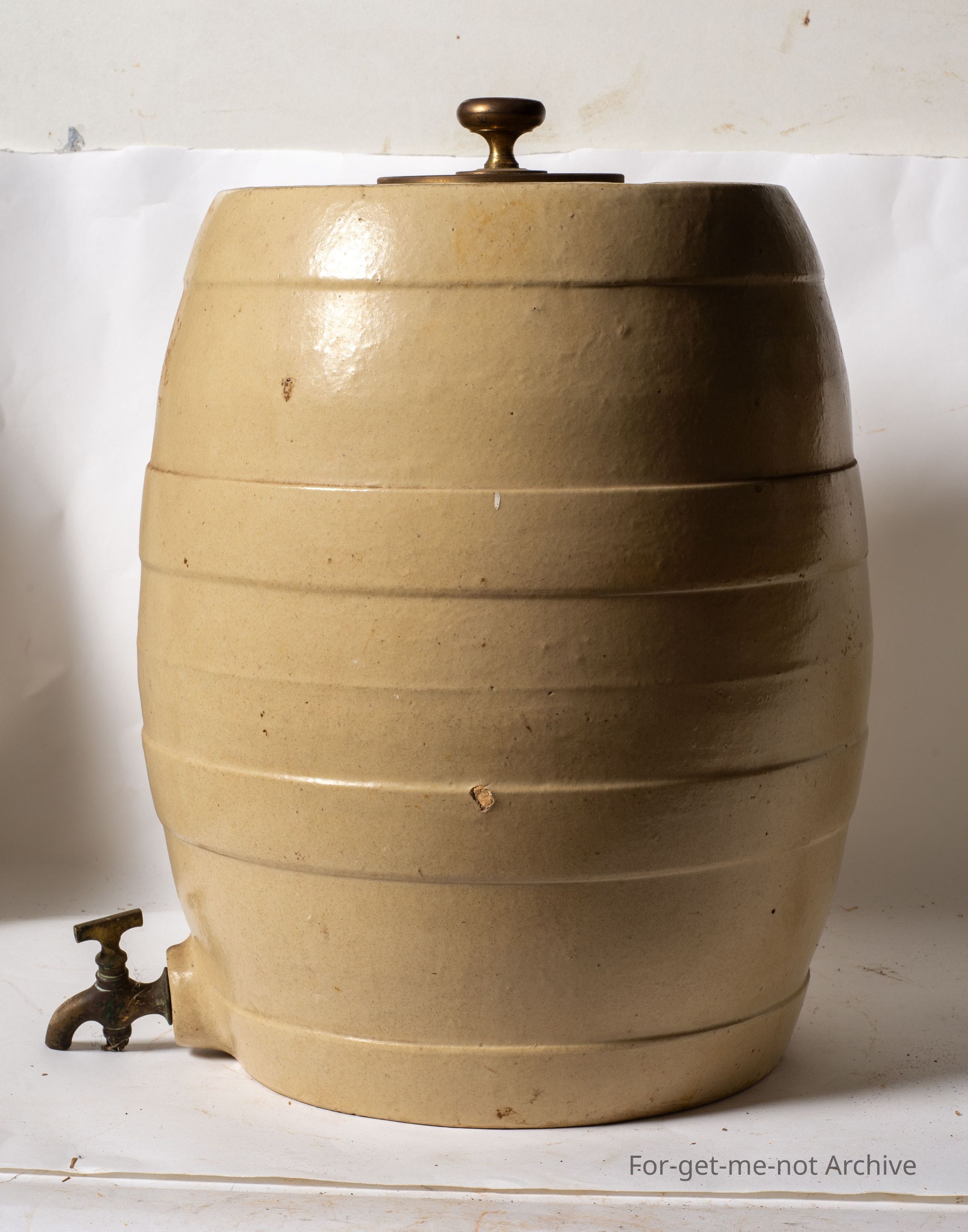 Ceramic Pottery, this is, a 4 gallon wine barrel with the brass tap intact. Has a sealing lid. Doesn't appear to have any stamping, but a very pale coloured glaze, unpainted bands